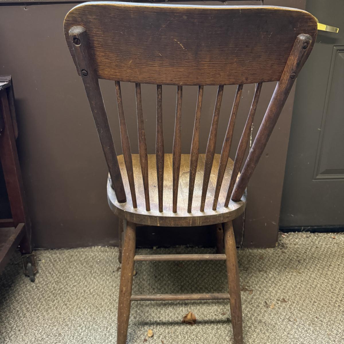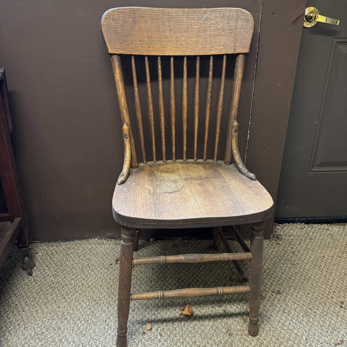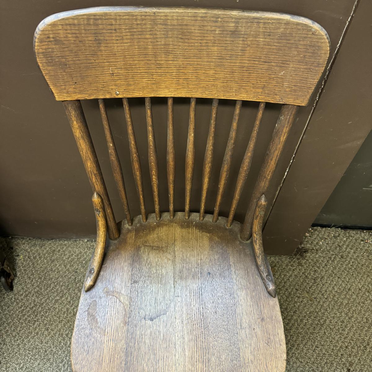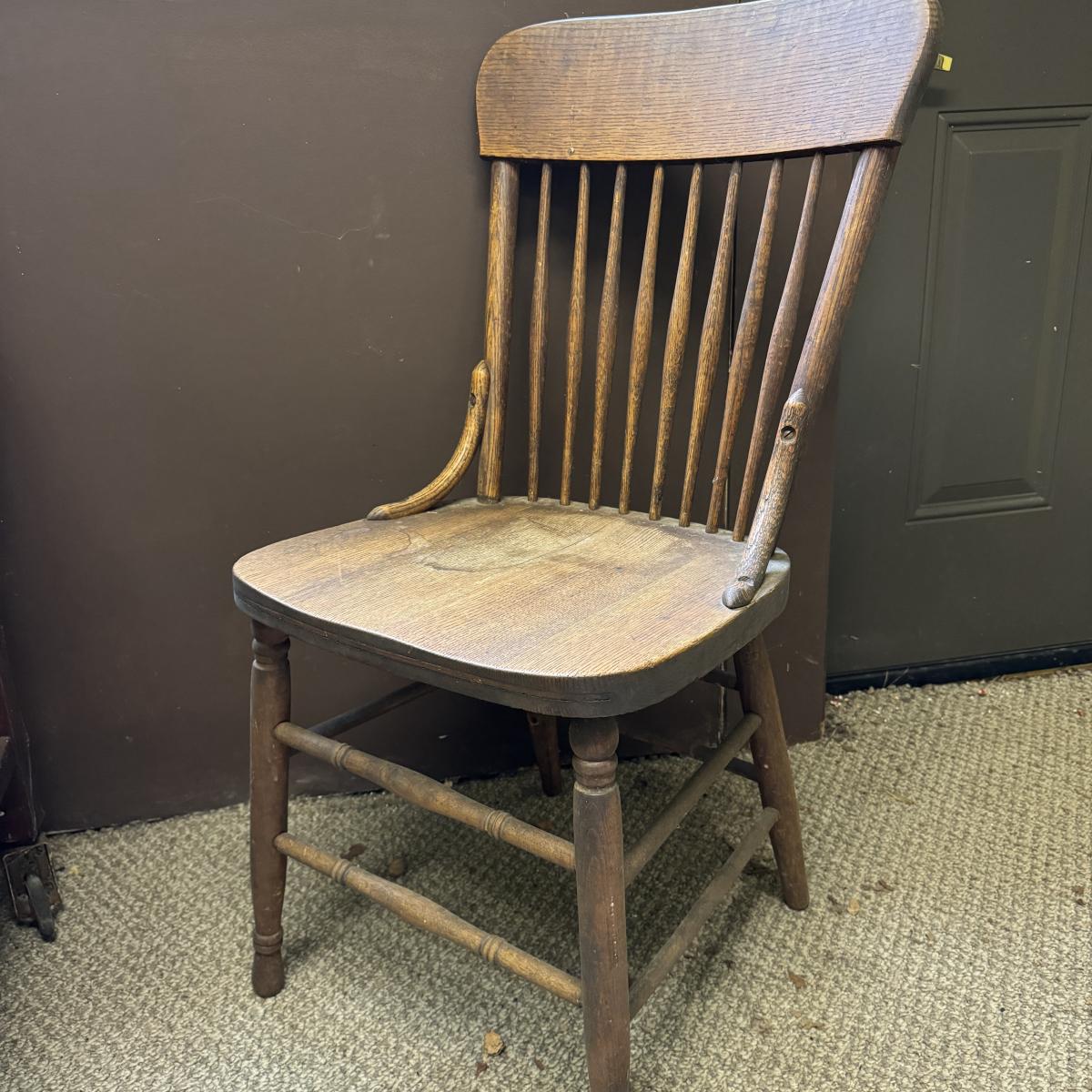 Nice looking wooden chair with spindle back. Sturdy. Has sticker on bottom but doesn’t appear to say anything. A few water stains on seat. The chair measures 16.25” x 17” x 35”H. Local pick up only.