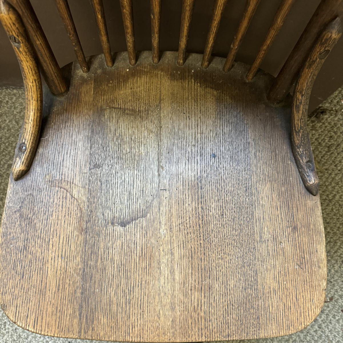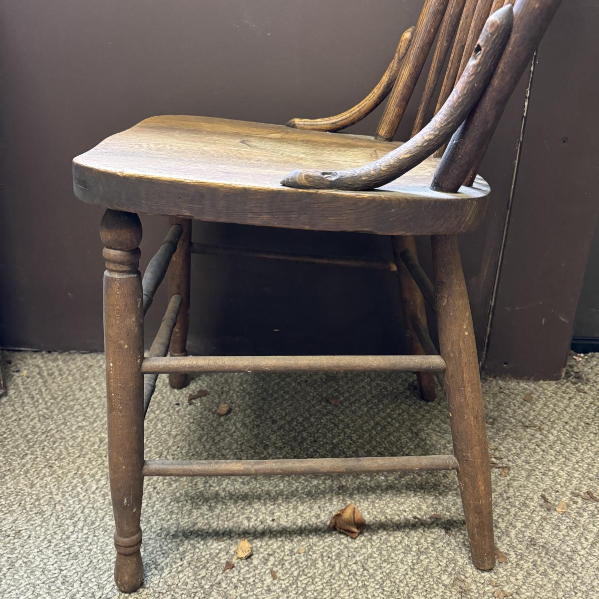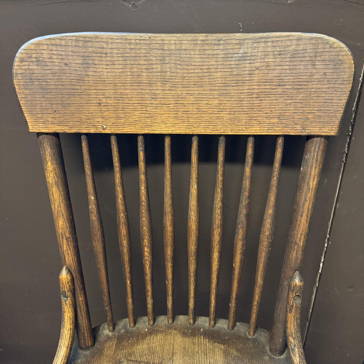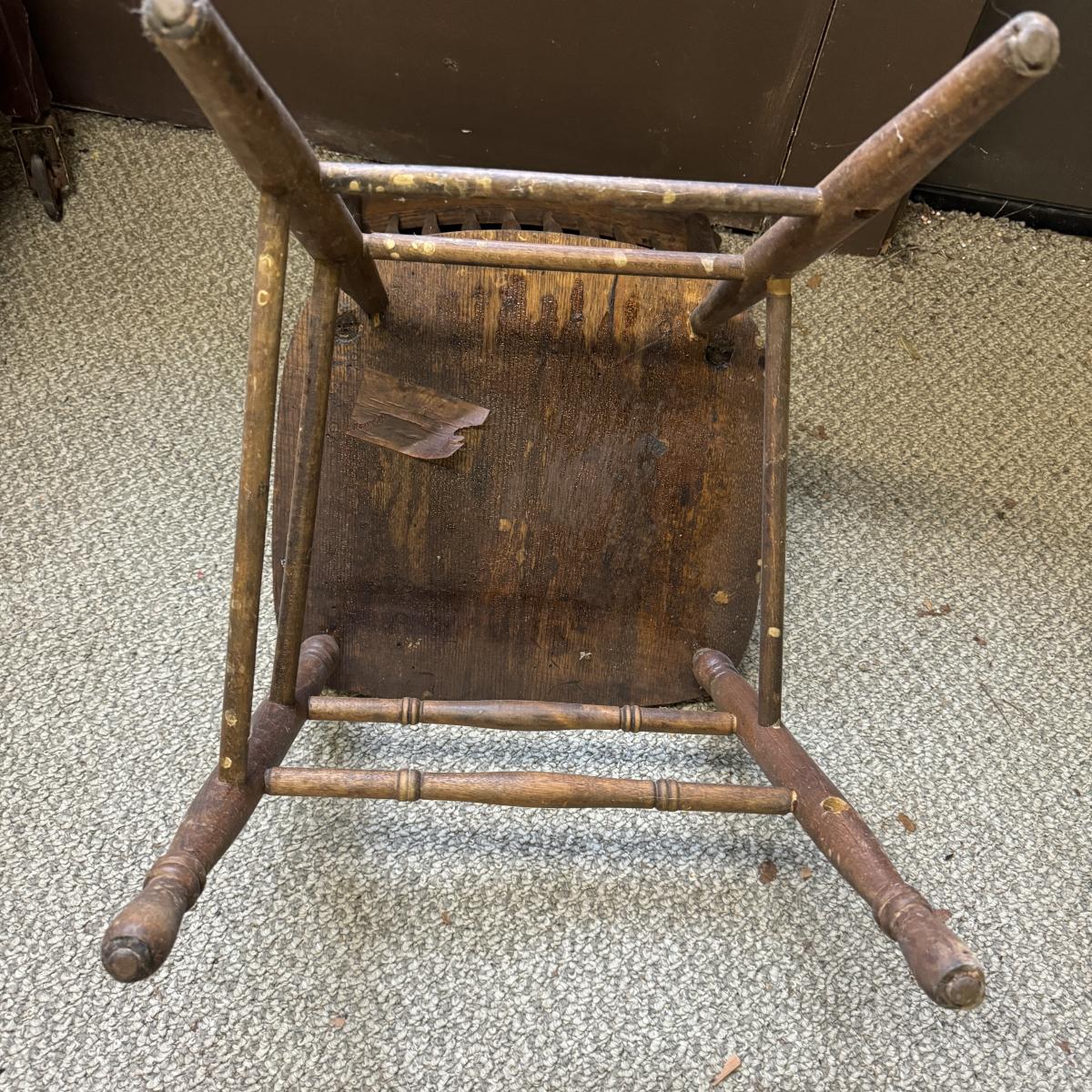 Nice looking wooden chair with spindle back. Sturdy. Has sticker on bottom but doesn’t appear to say anything. A few water stains on seat. The chair measures 16.25” x 17” x 35”H. Local pick up only.