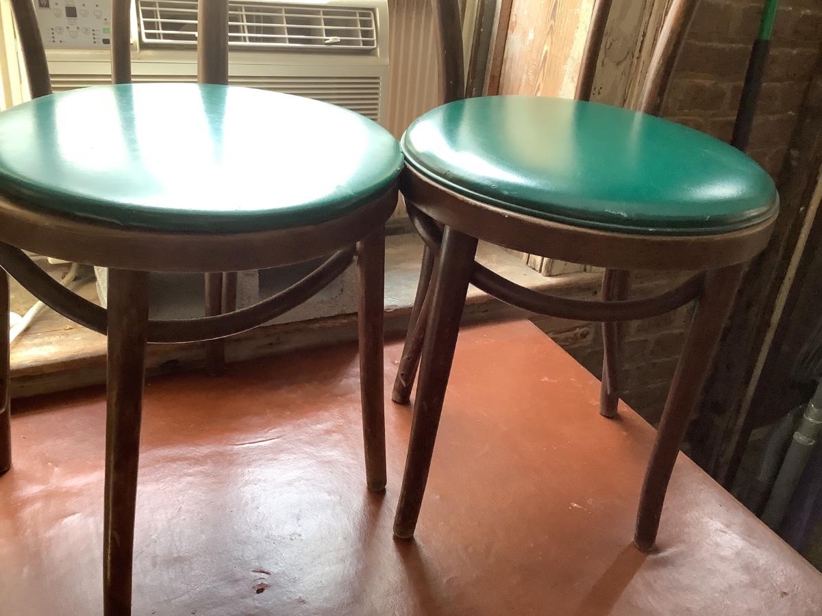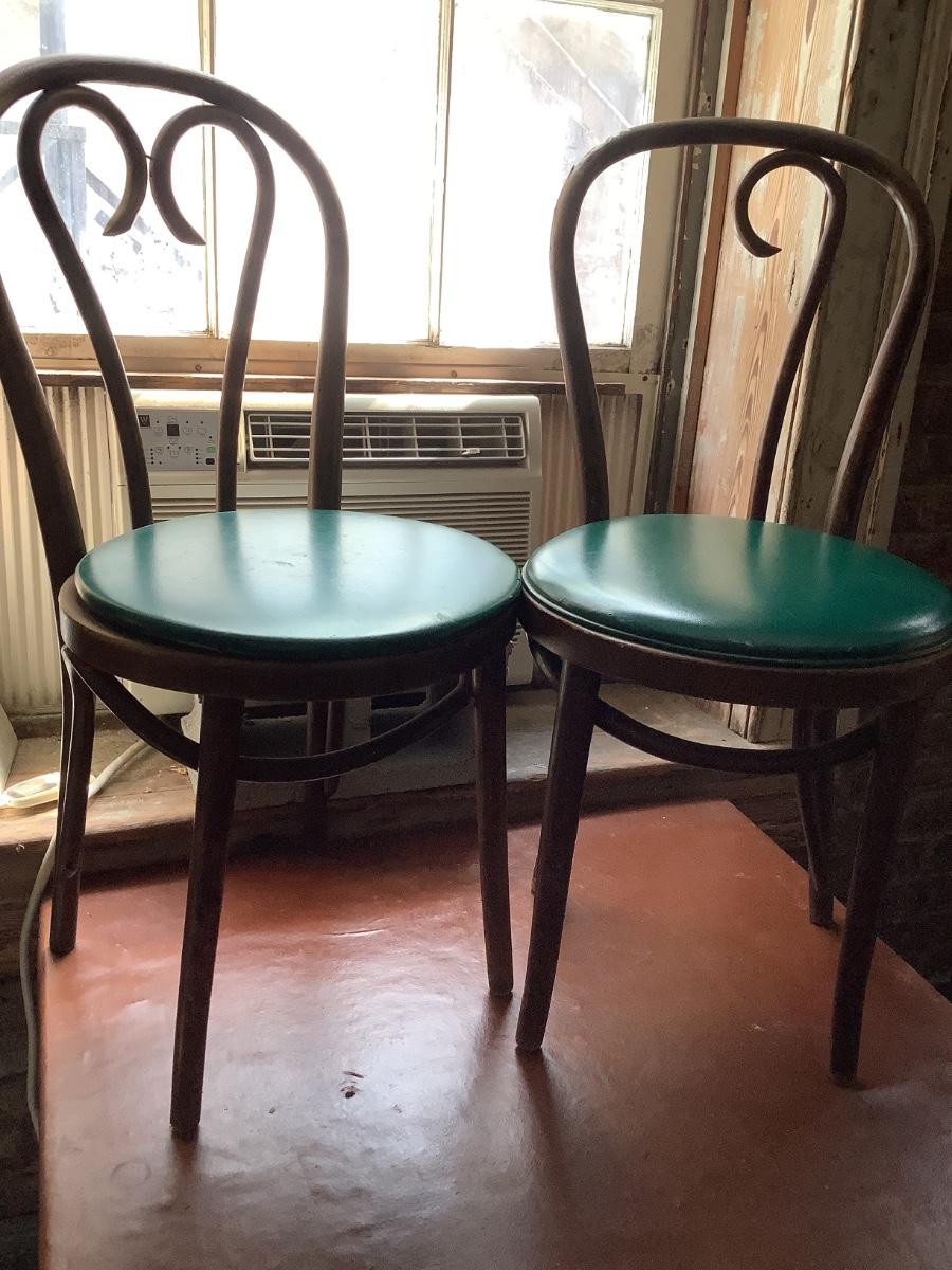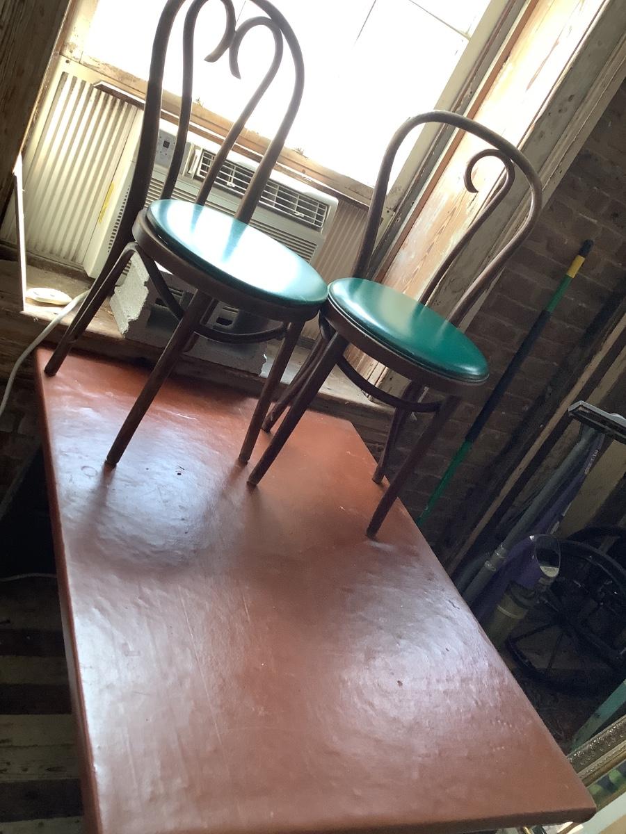 Sturdy wooden table with vinyl cover and 2 green seat wooden chairs