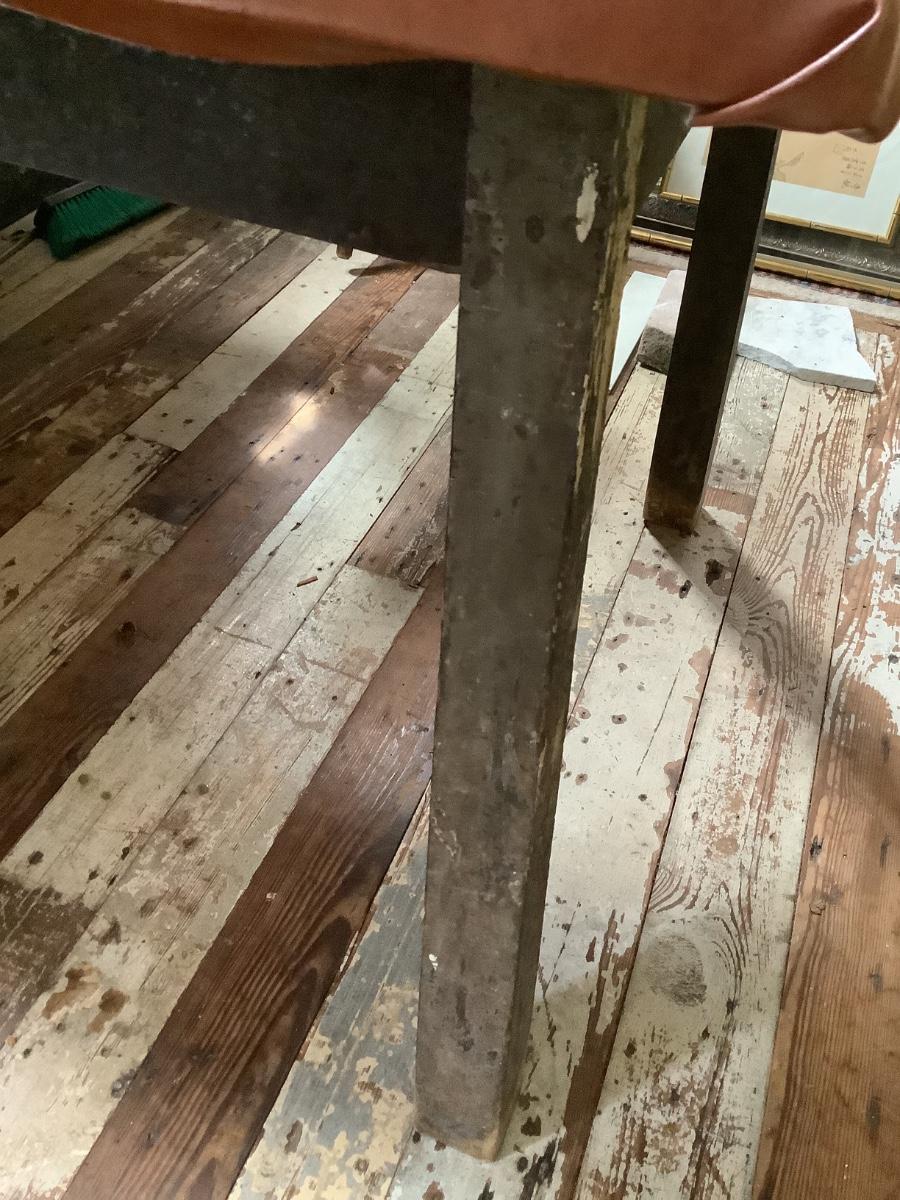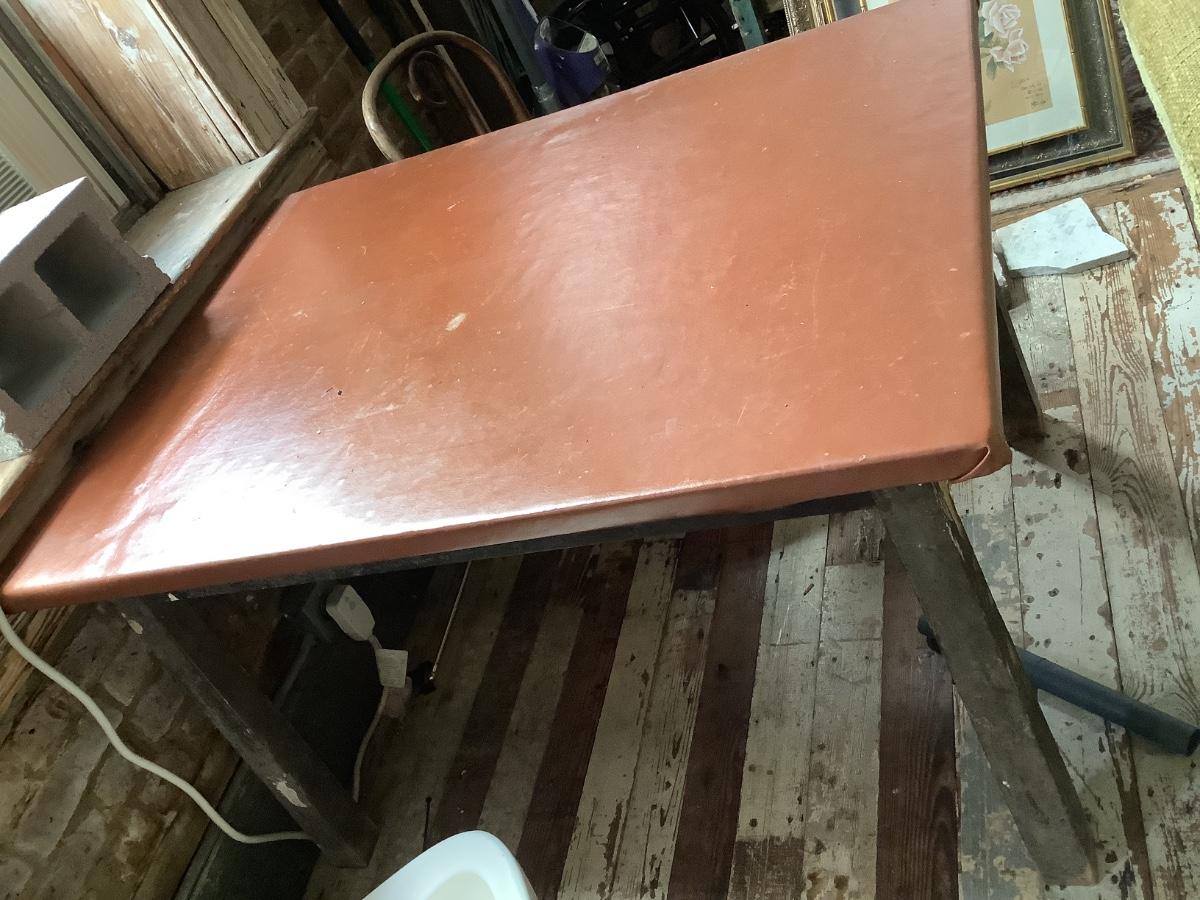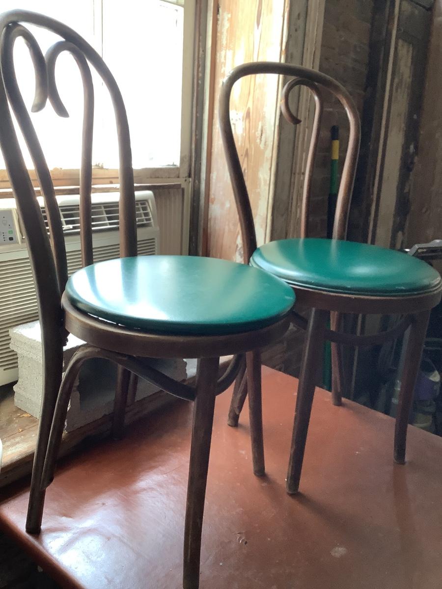 Sturdy wooden table with vinyl cover and 2 green seat wooden chairs