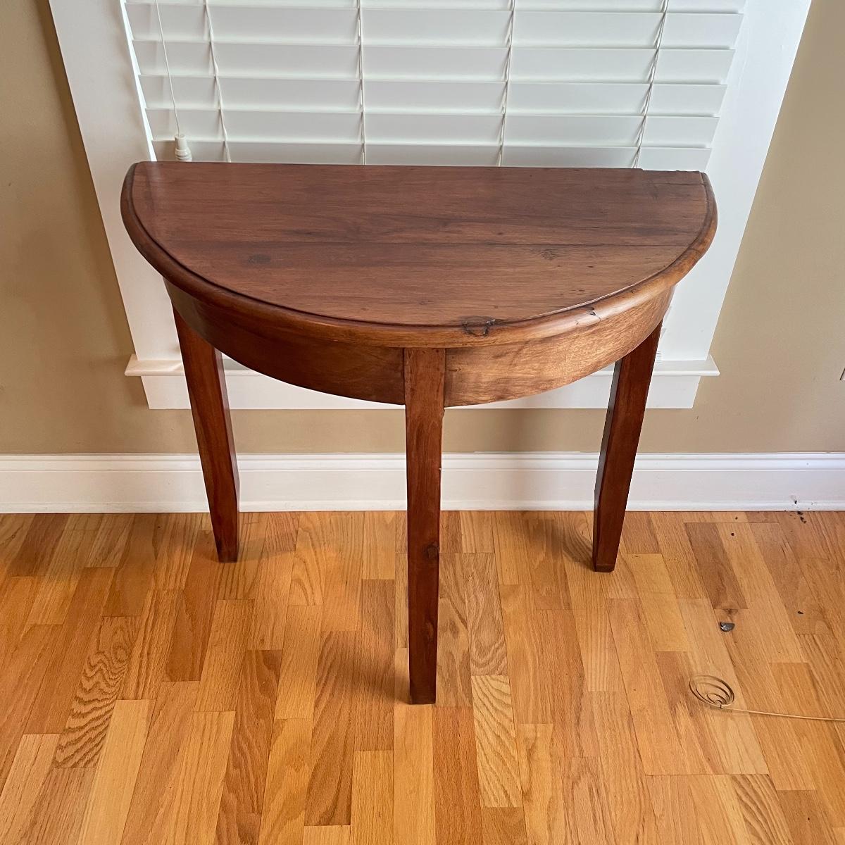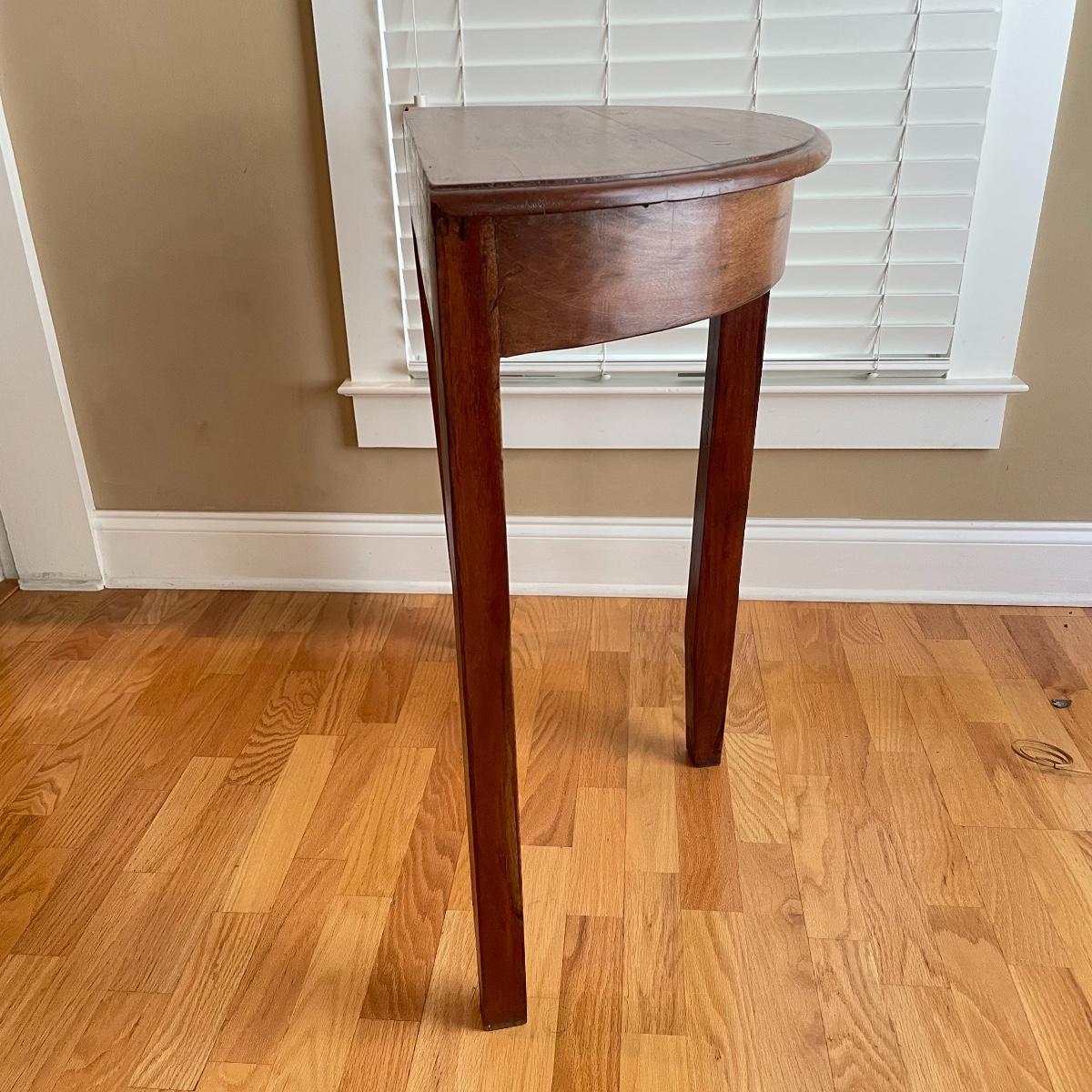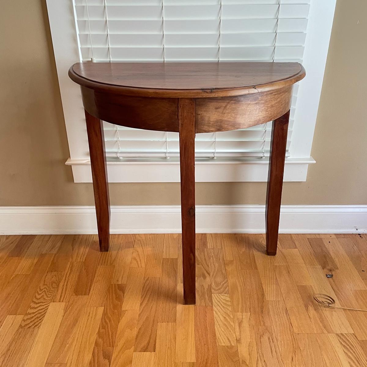 Sturdy solid wood semicircular side table. Wood is a medium brown with a decent chip on the back, barely noticeable from the front. Table measures 30” x 15” x 30”. Local pick up only.
