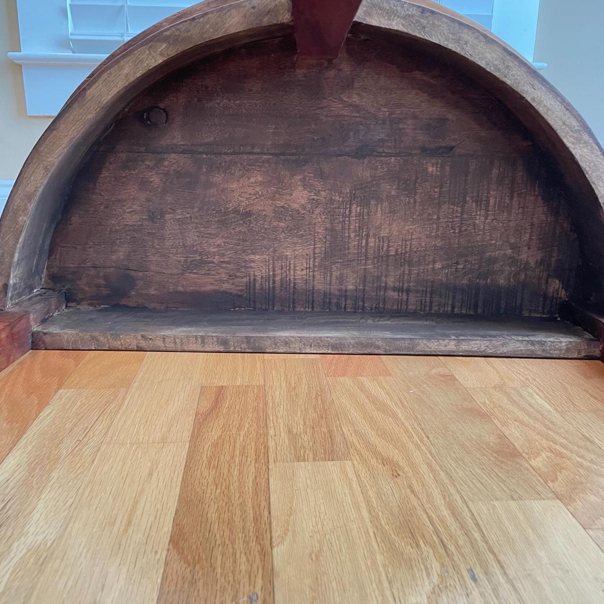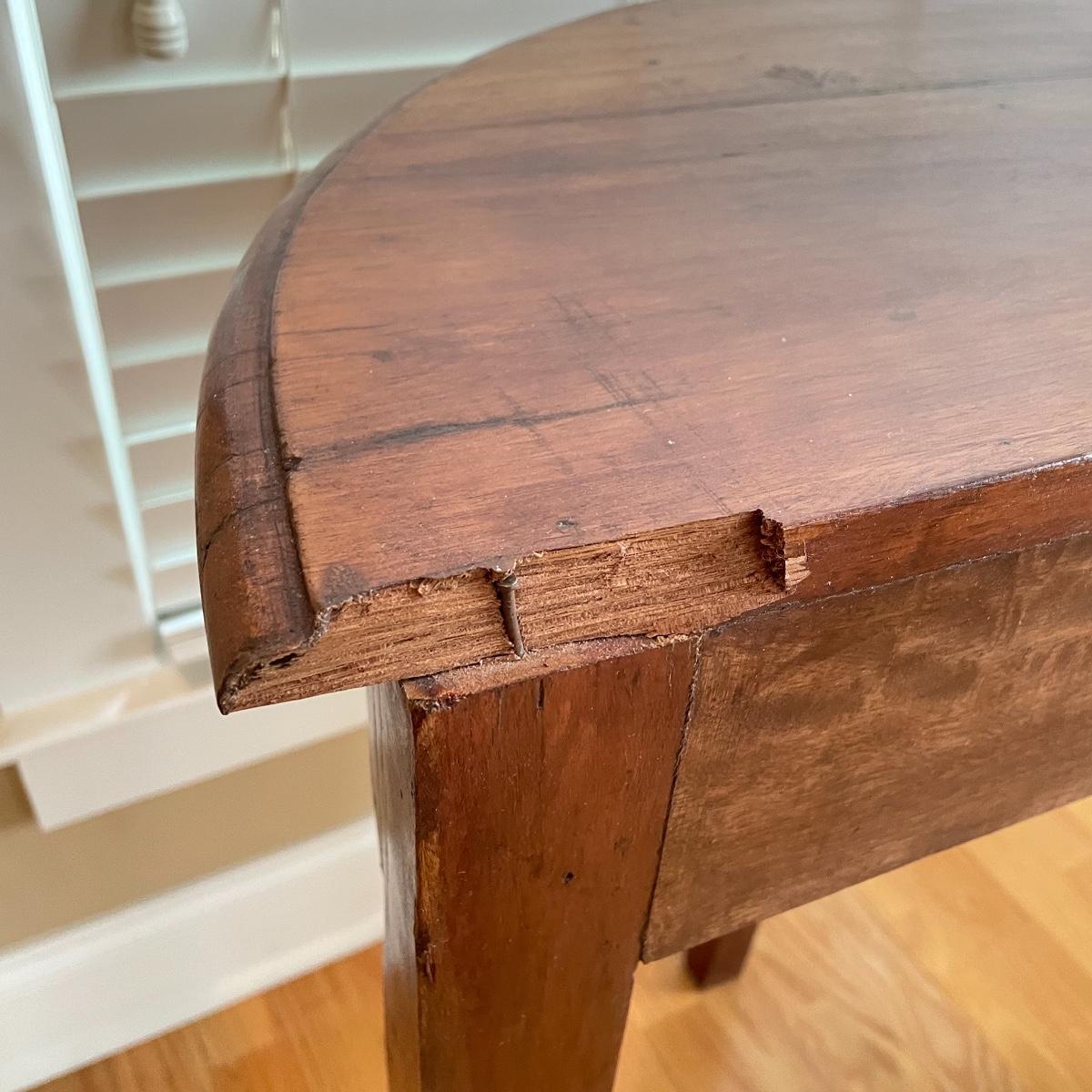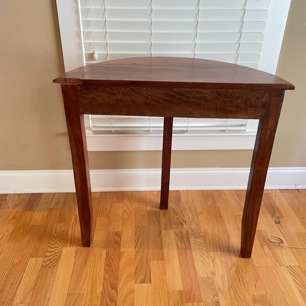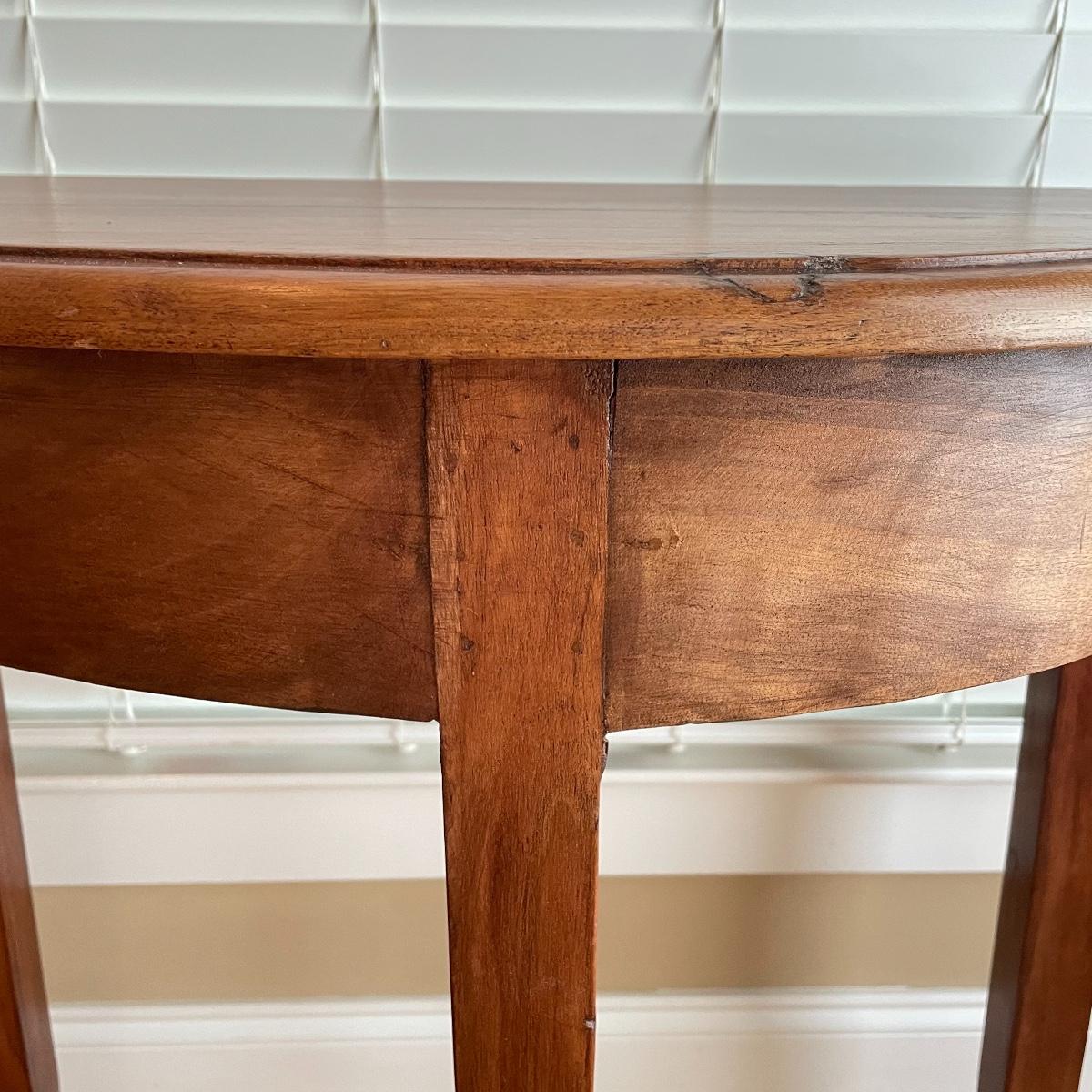 Sturdy solid wood semicircular side table. Wood is a medium brown with a decent chip on the back, barely noticeable from the front. Table measures 30” x 15” x 30”. Local pick up only.