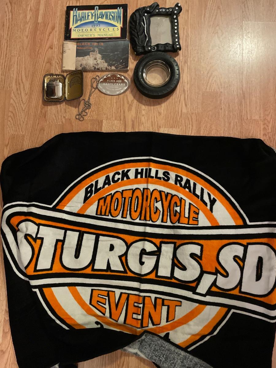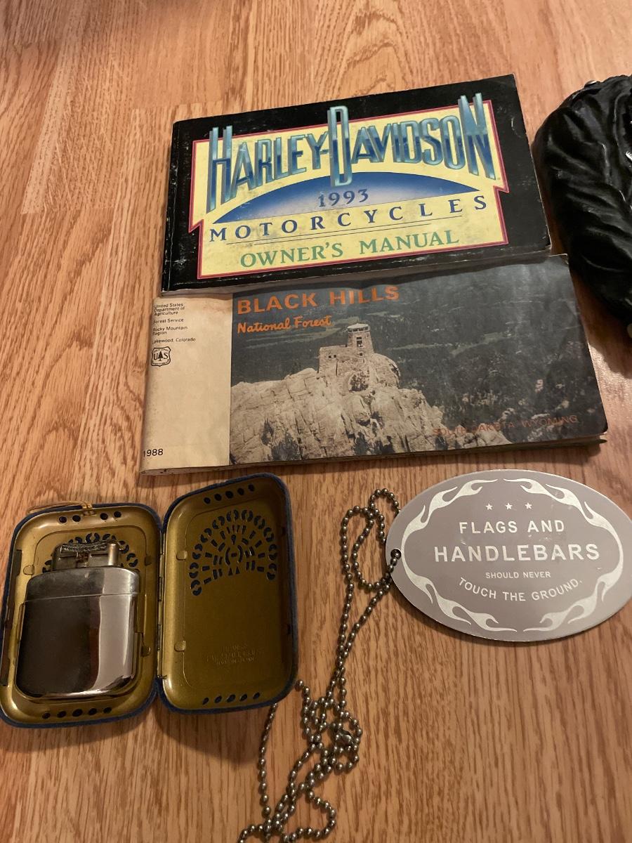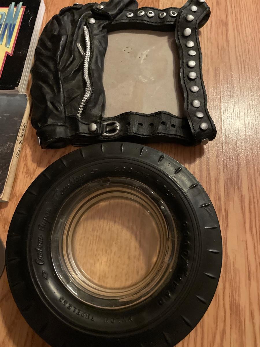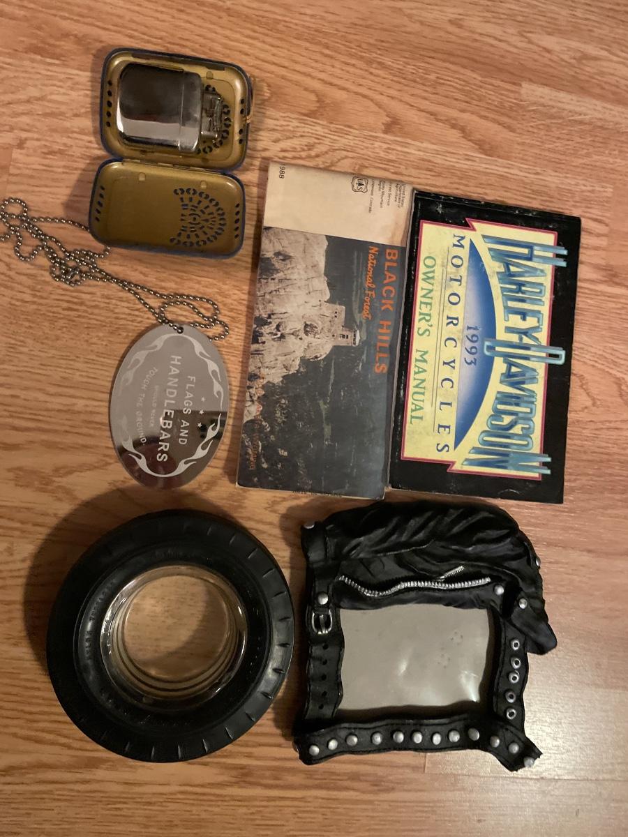 Leather jacket picture frame, Goodyear tire ashtray, map, tag and HD manual