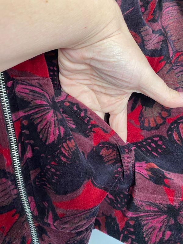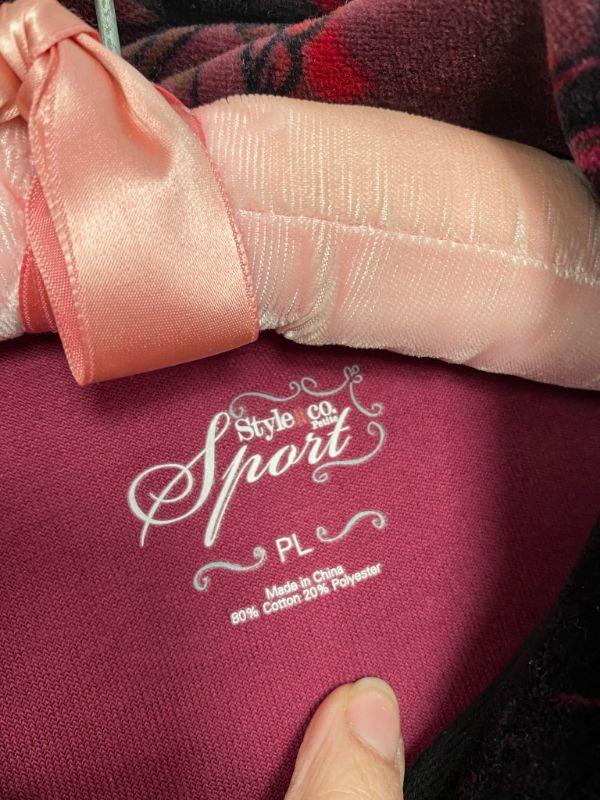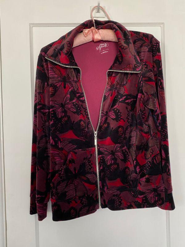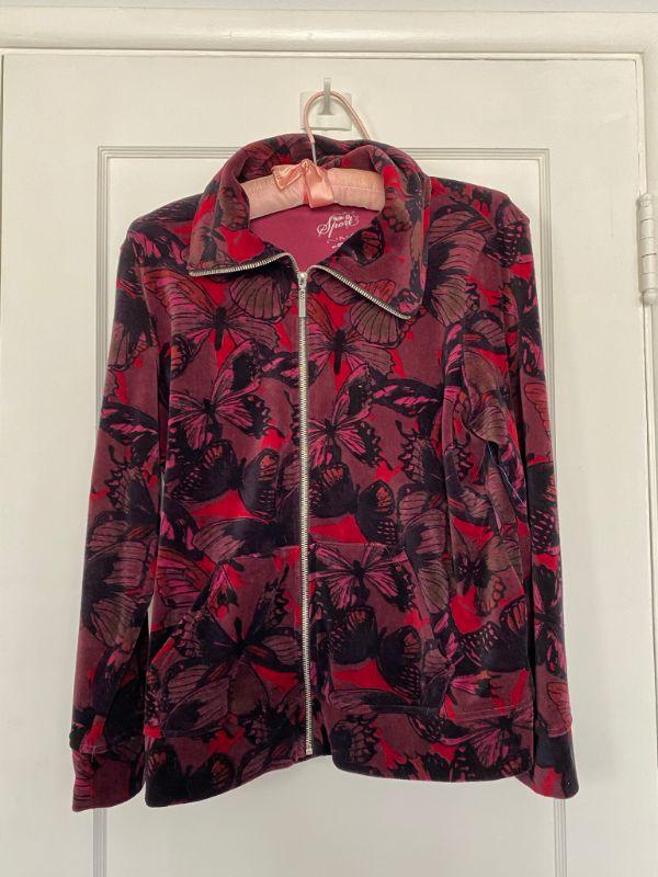 Style & Co velour zipper jacket. Dark red butterfly pattern. Has pockets. Good condition. Size PL (petite large)