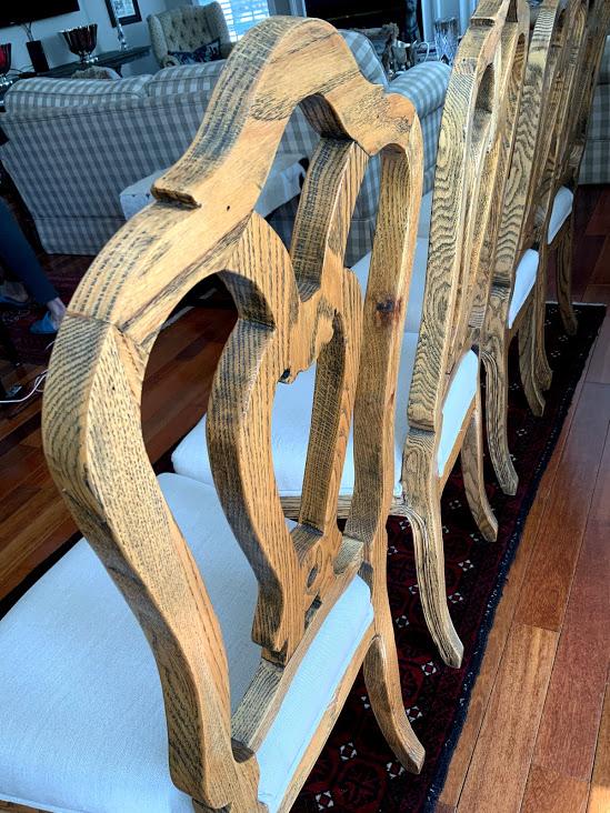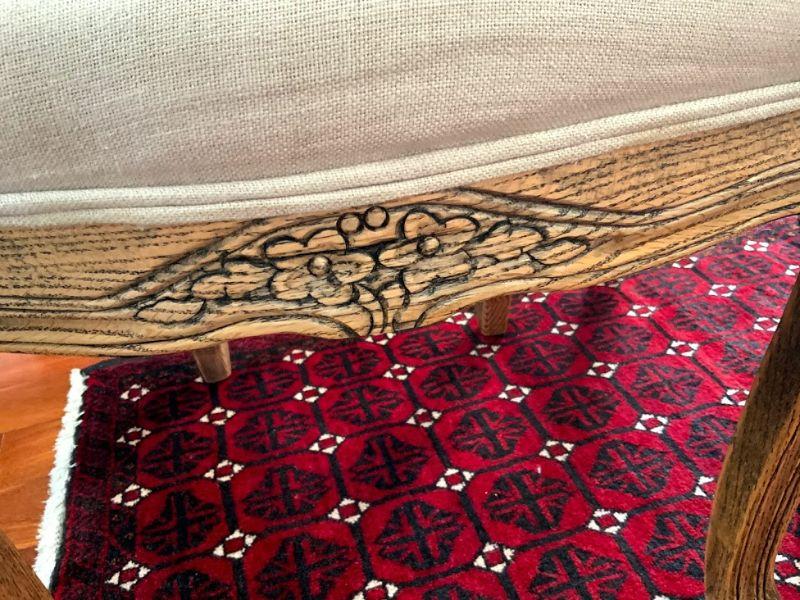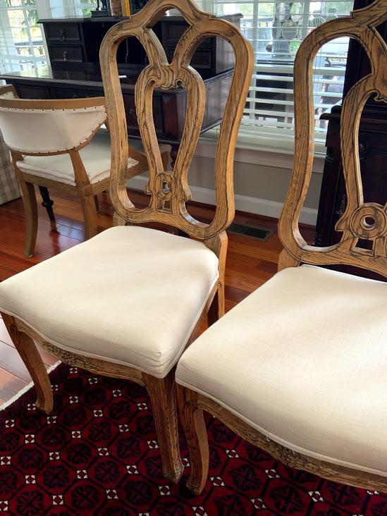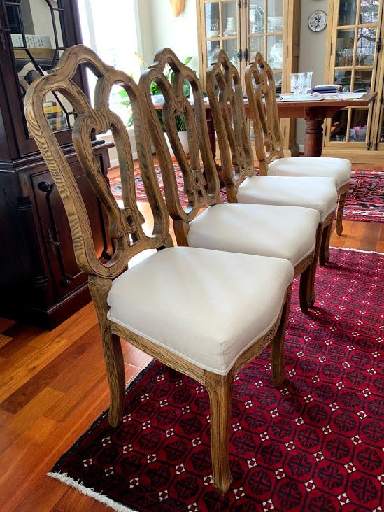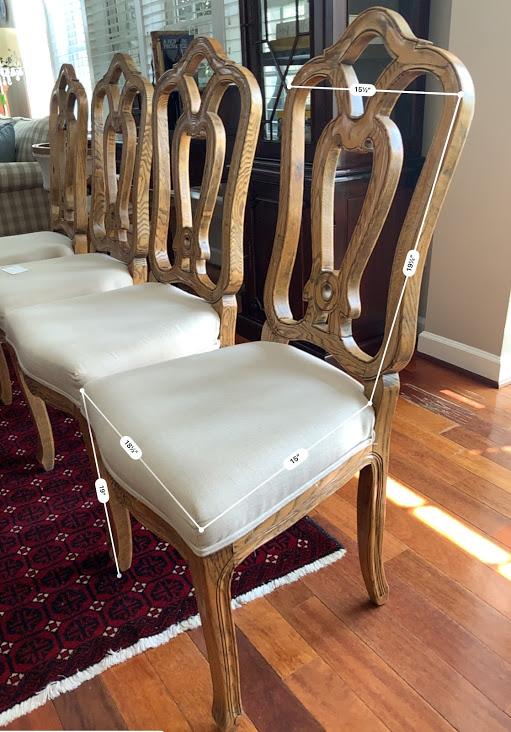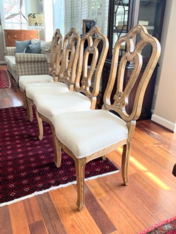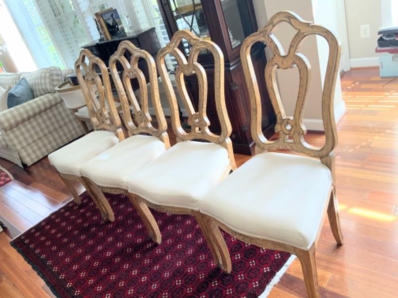 Beautiful carved set of 4 upholstered side chairs to accent any dining room table. Tasteful and elegant.