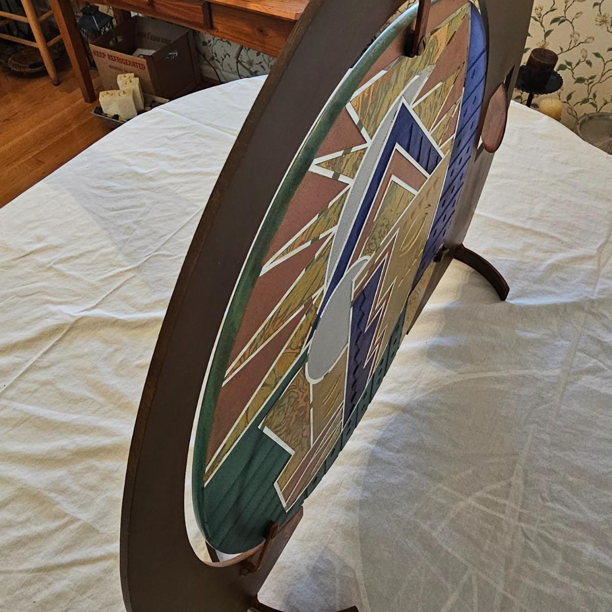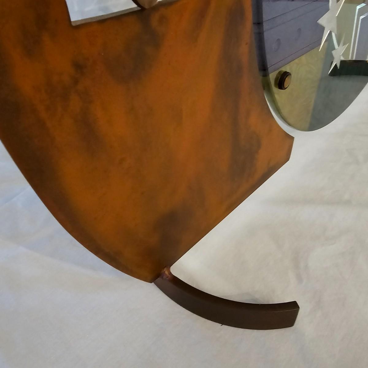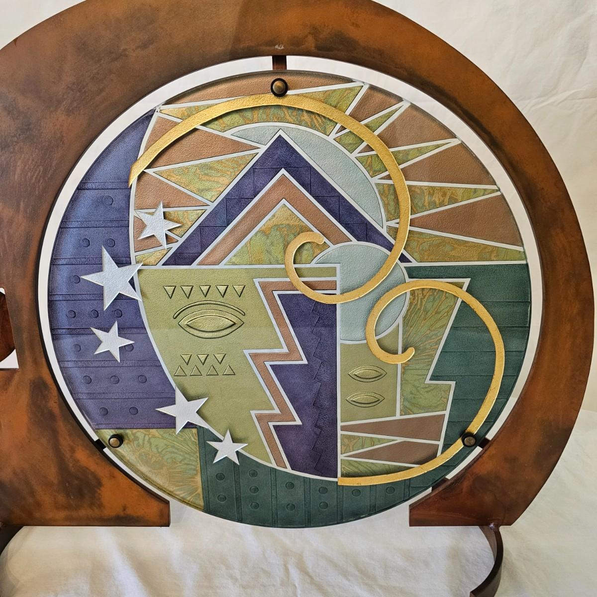 Beautiful round/oval artwork of steel and glass. Copper colored steel frame has two curved cross feet to support 5/16" tempered glass disc. Glass is etched and flashed on both front and back, giving it a 3D appearance. Sculpture measures 7" x 26" x 22"H. See photos for details.