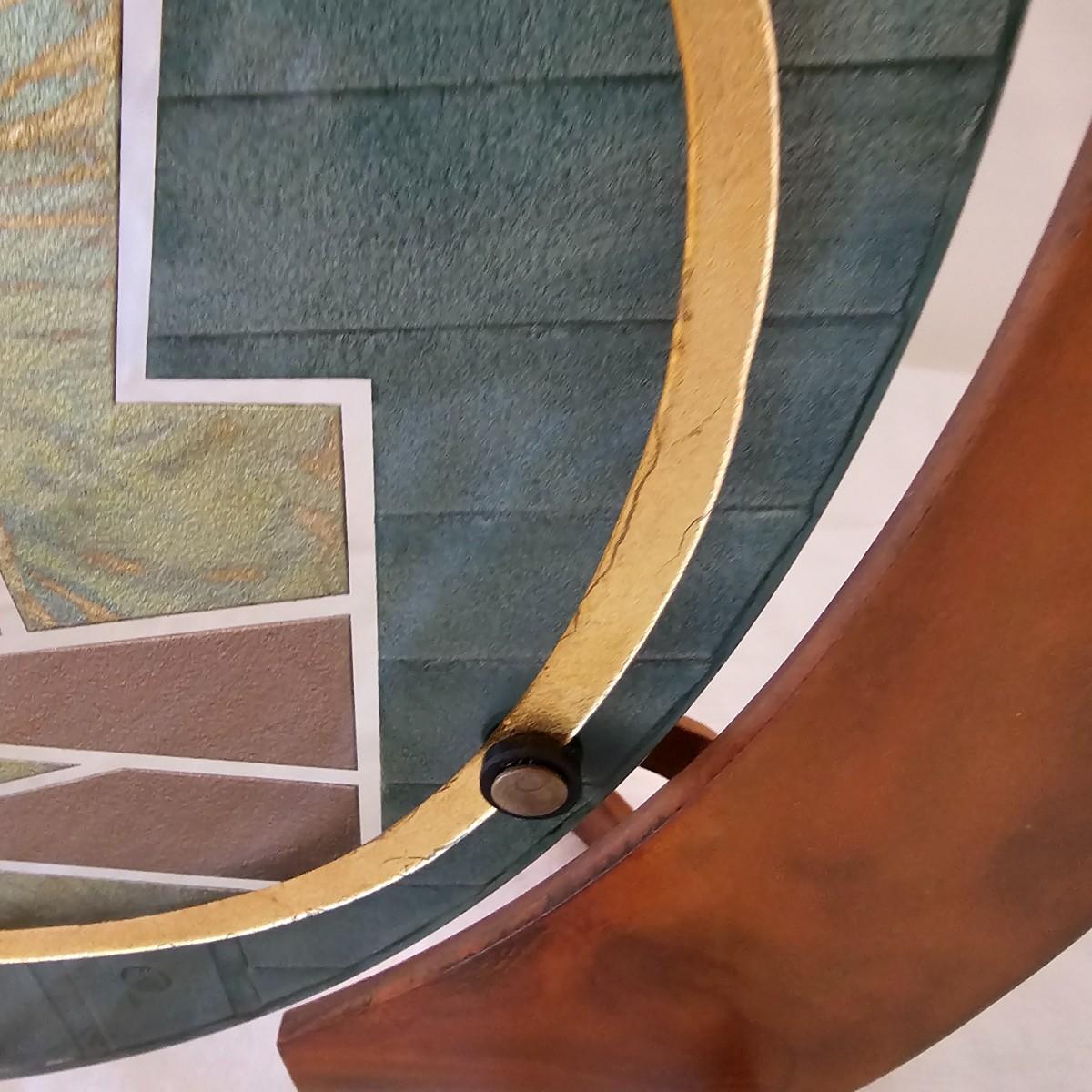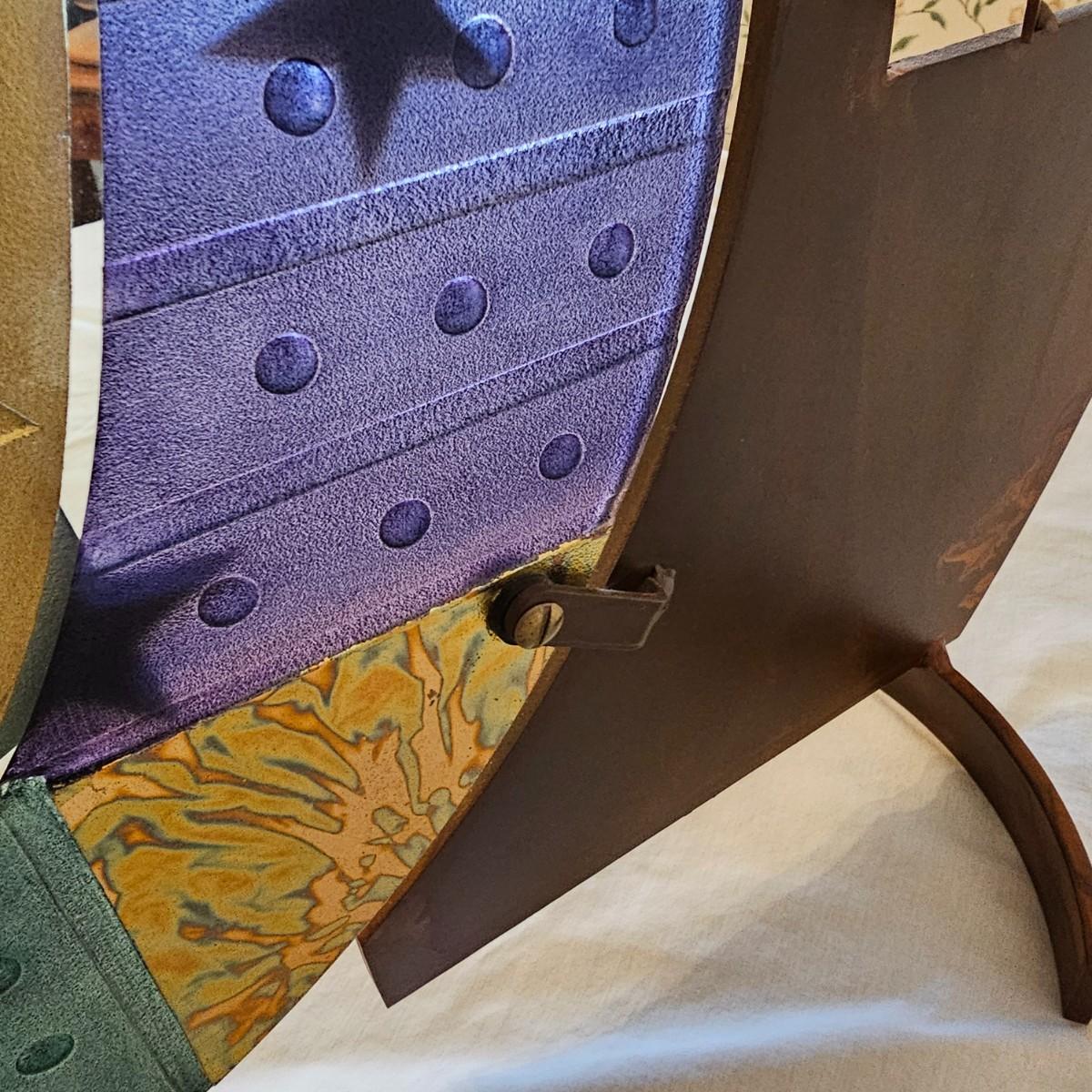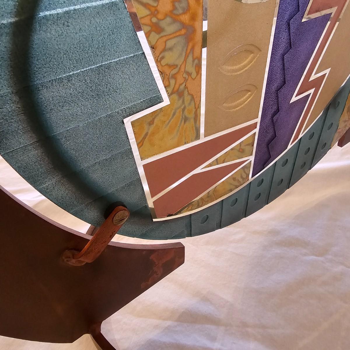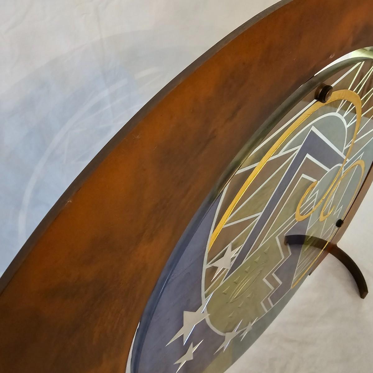 Beautiful round/oval artwork of steel and glass. Copper colored steel frame has two curved cross feet to support 5/16" tempered glass disc. Glass is etched and flashed on both front and back, giving it a 3D appearance. Sculpture measures 7" x 26" x 22"H. See photos for details.