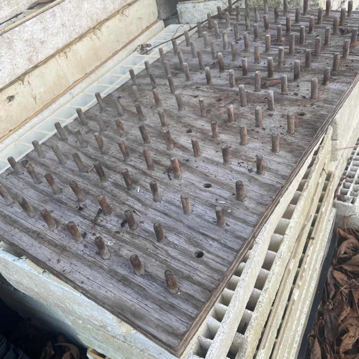 Fifty plus styrofoam seed cell trays for you to pick through and take as many as you want. Some are a little more worn than others and all need a good cleaning as they are outside and have some mold. Lot also includes a wood seed hole tool. Plastic seed trays not included.