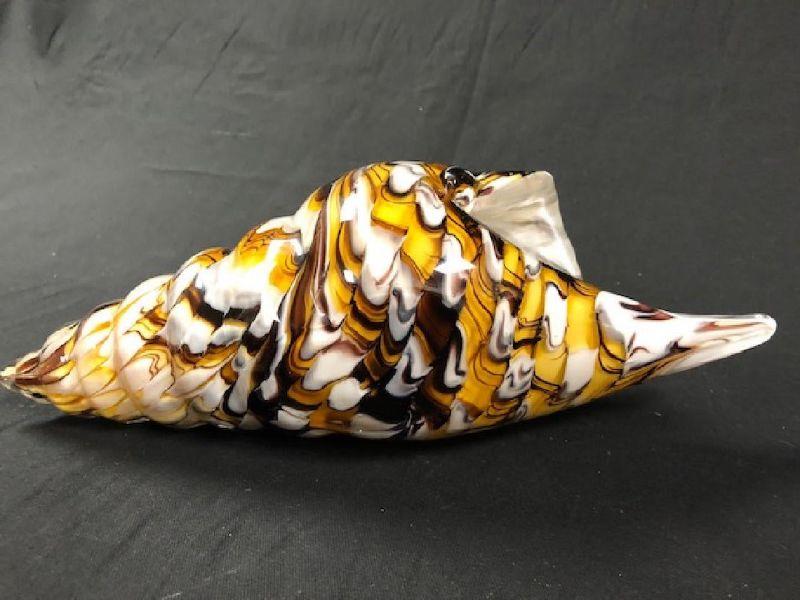 Description: Sublime Murano-style glass shell. Larger size,; fantastic pattern of colors from white to brown. Material: glass. Measurement: approximate 5.5"h x 11"l (INCHES). Shipping cost: $25; different rate applies for Alaska, California & Hawaii. International rate applies.