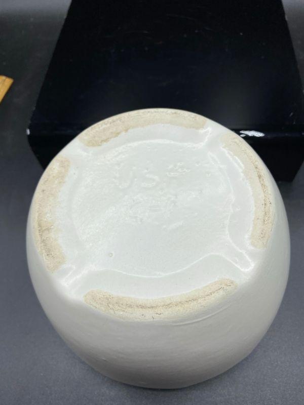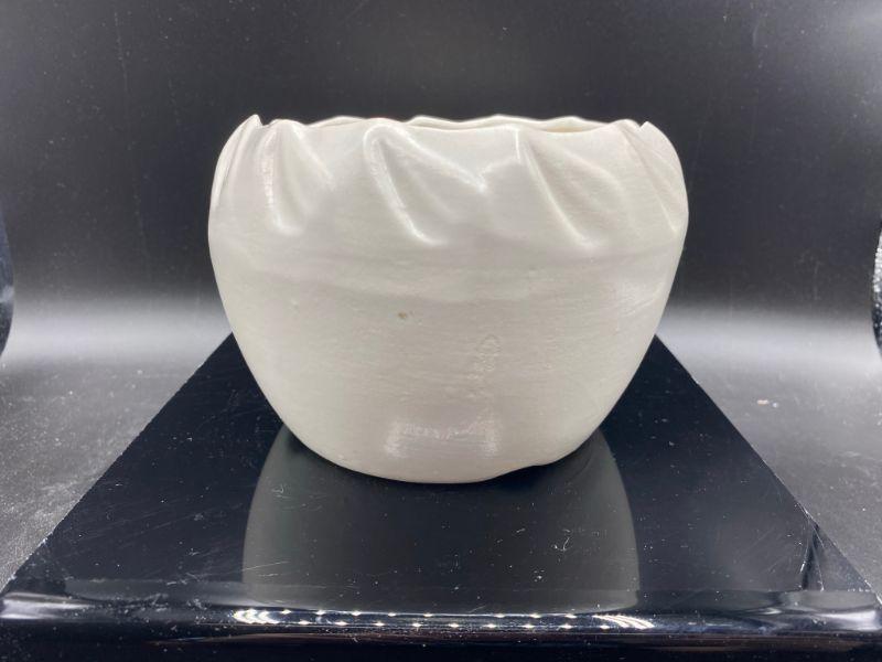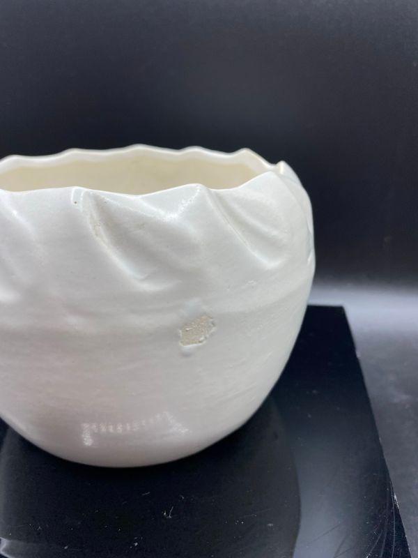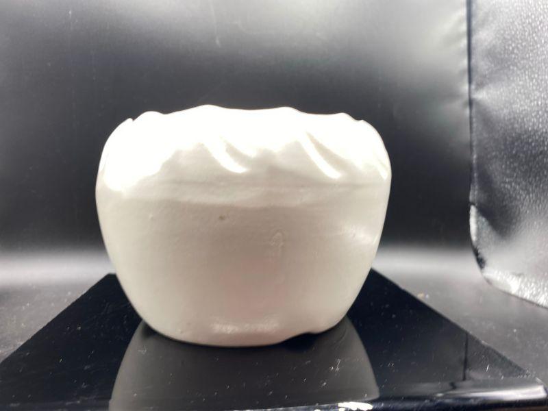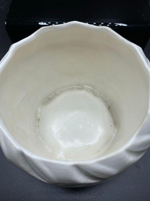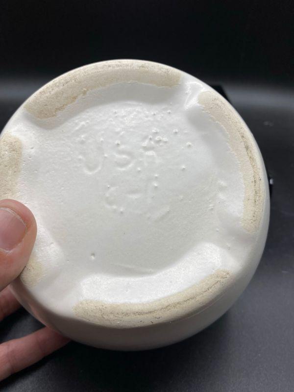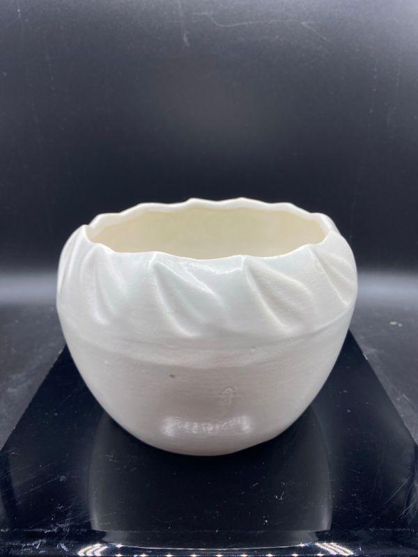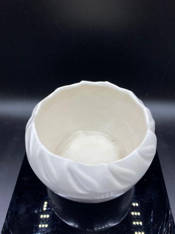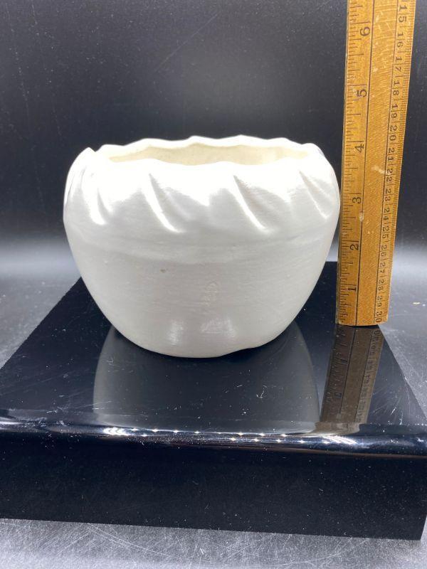 Vintage USA white pottery planter. Has a subtle leaf pattern embossed around the top. Satin finish. Good condition, small flaw in the glaze. Stands about 4" tall.