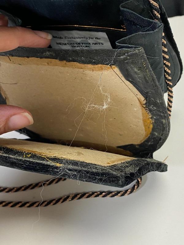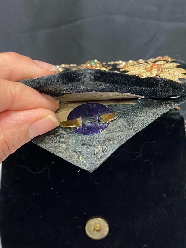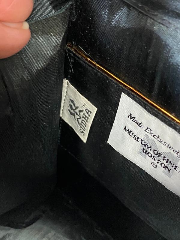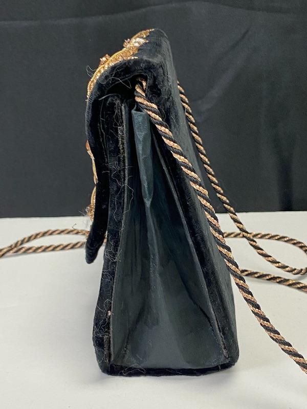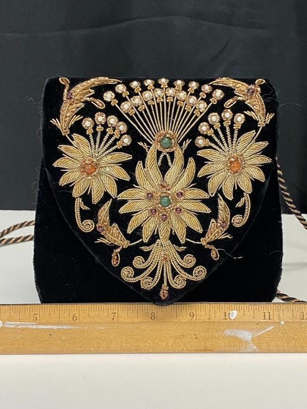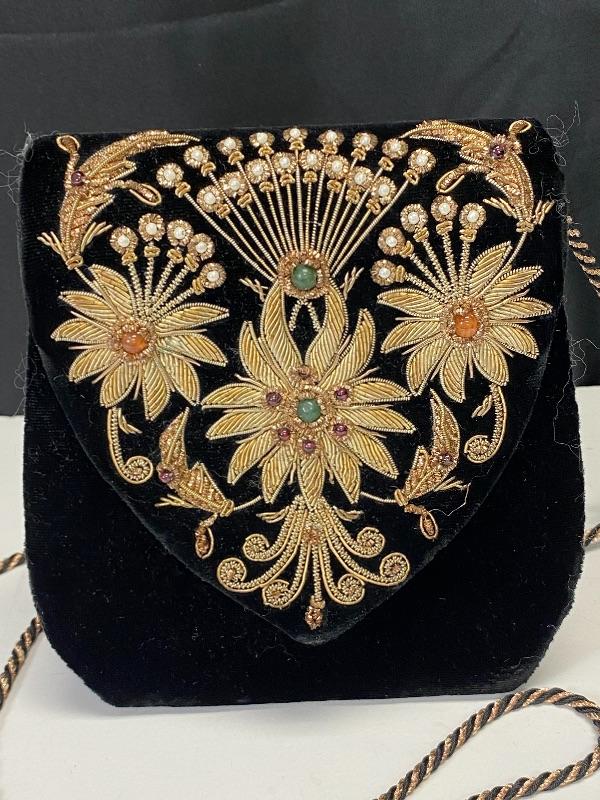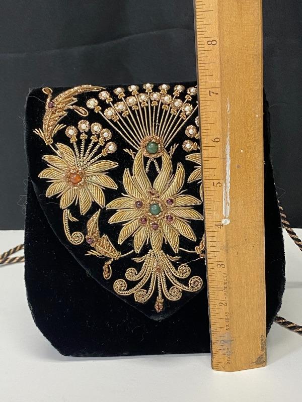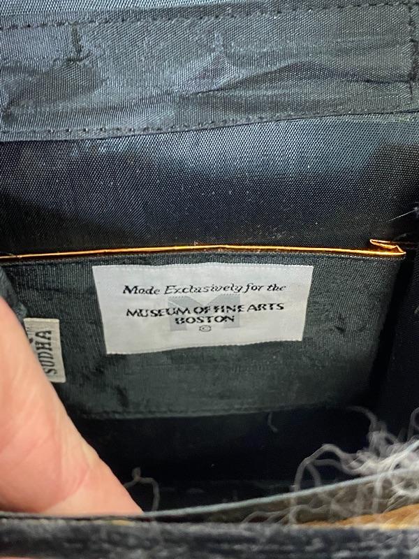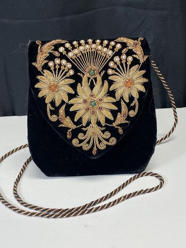 Sudha and The Museum of Fine Arts Boston black velvet purse. Floral embellished flap done with wire and beads. Displays nicely. Does have some issues, needs to be repaired/glued. About 6" size.