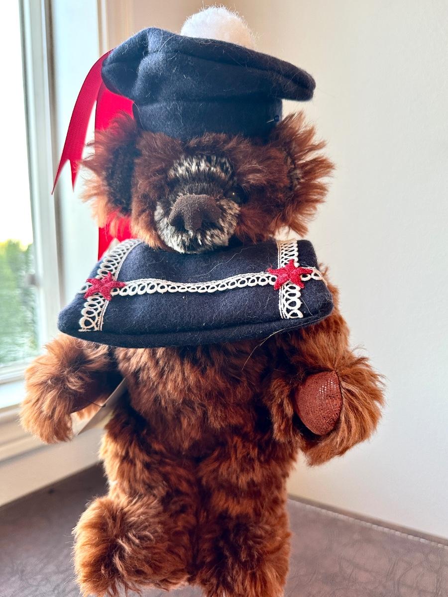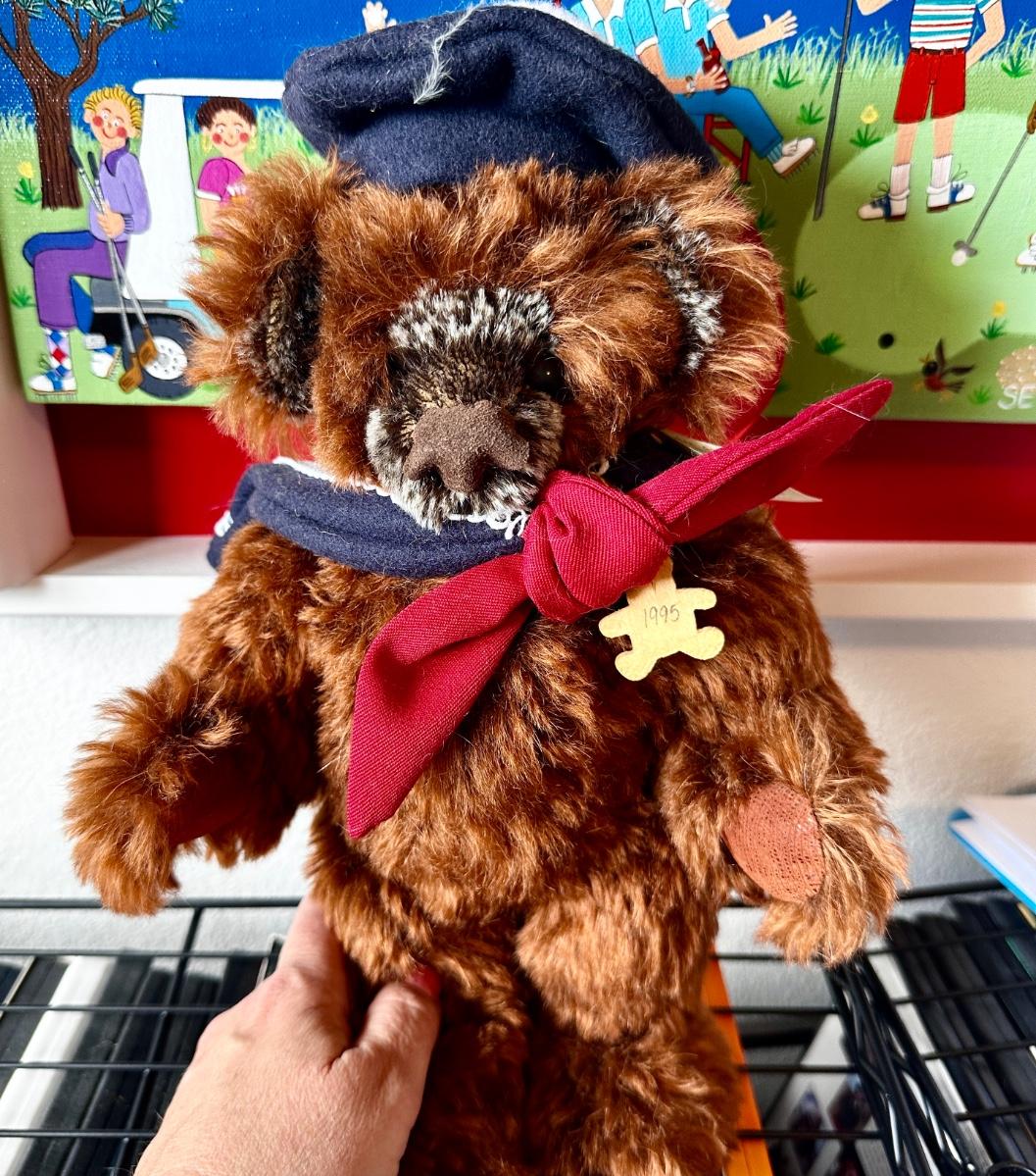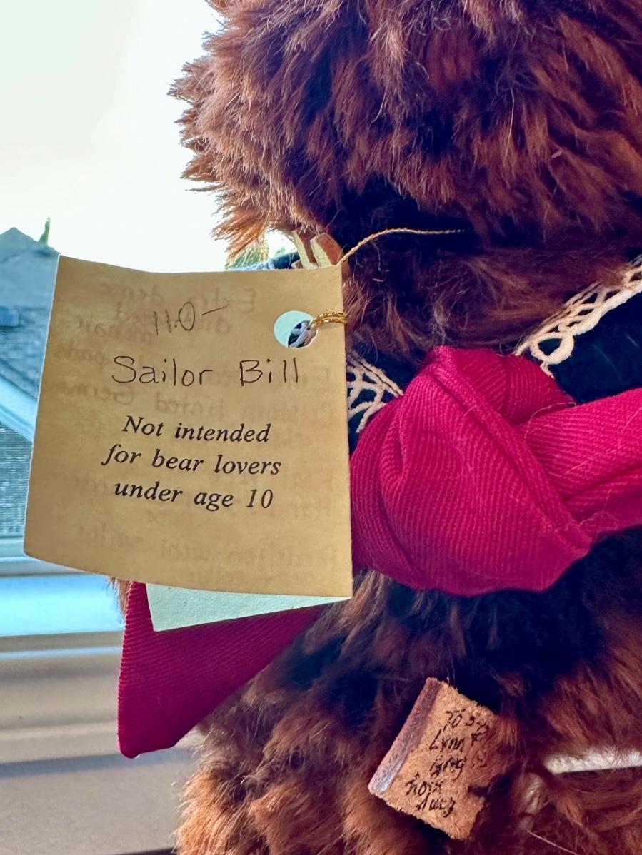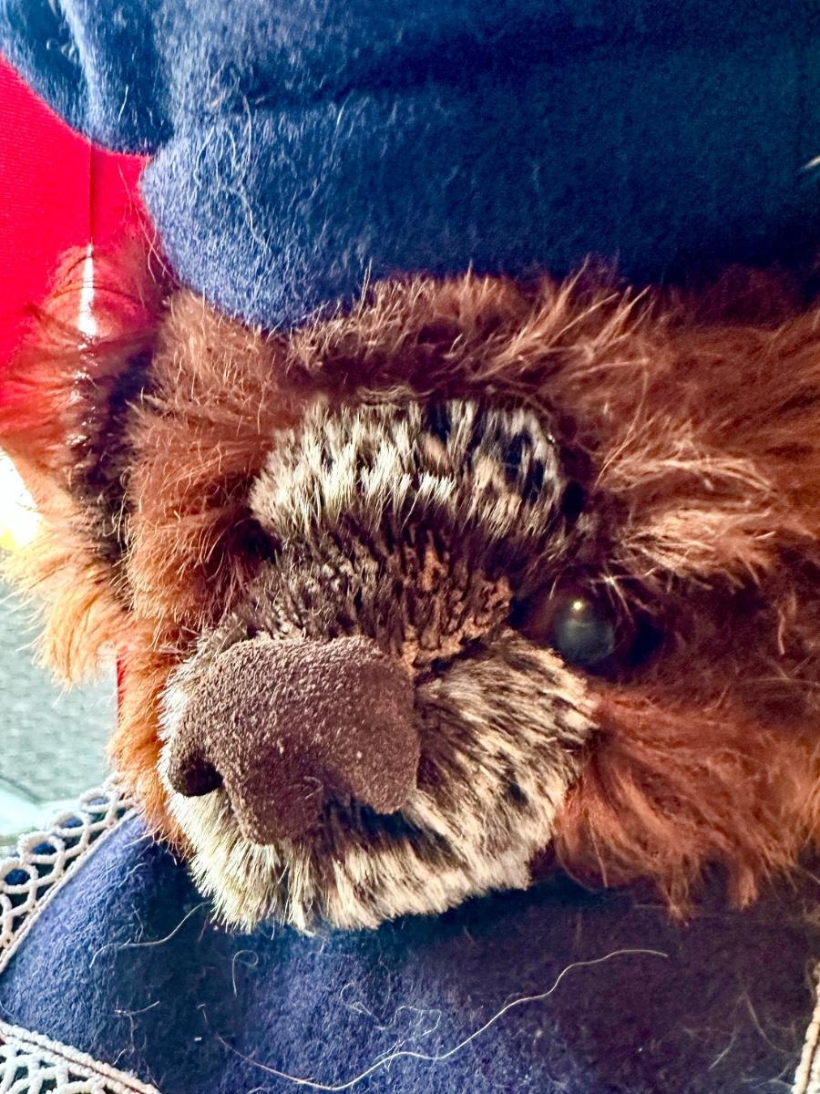 extra-dense distressed mohair, embossed sued pads, custom tinted, German glasss eyes, flat feet, hand-sculpted, sued nose, Pendleton wool sailor cap + collar.10"