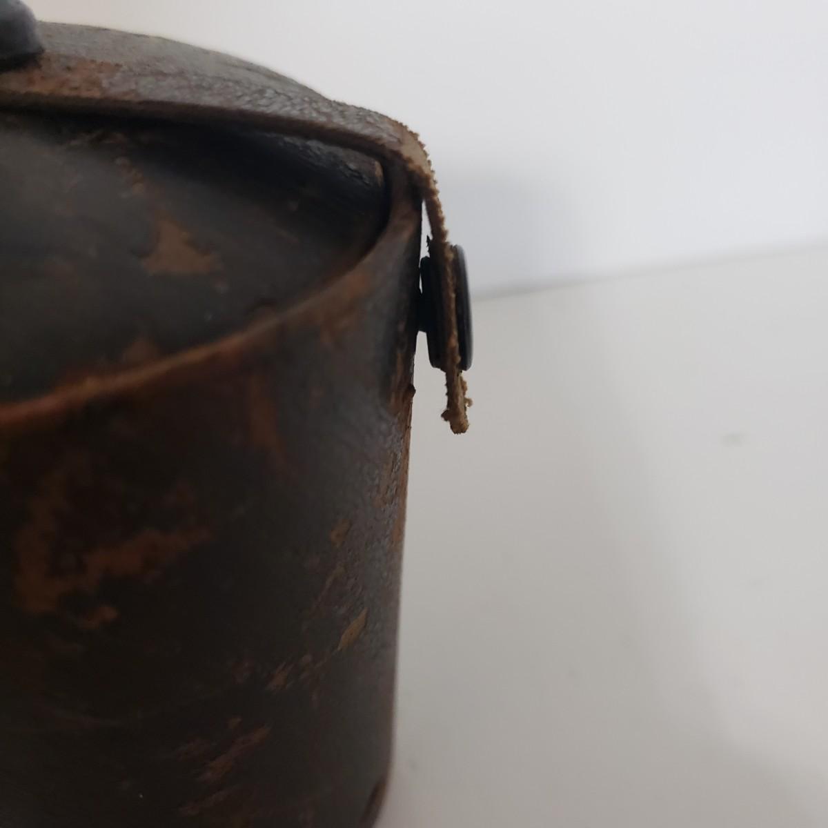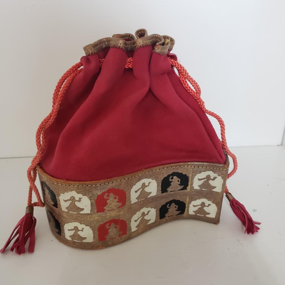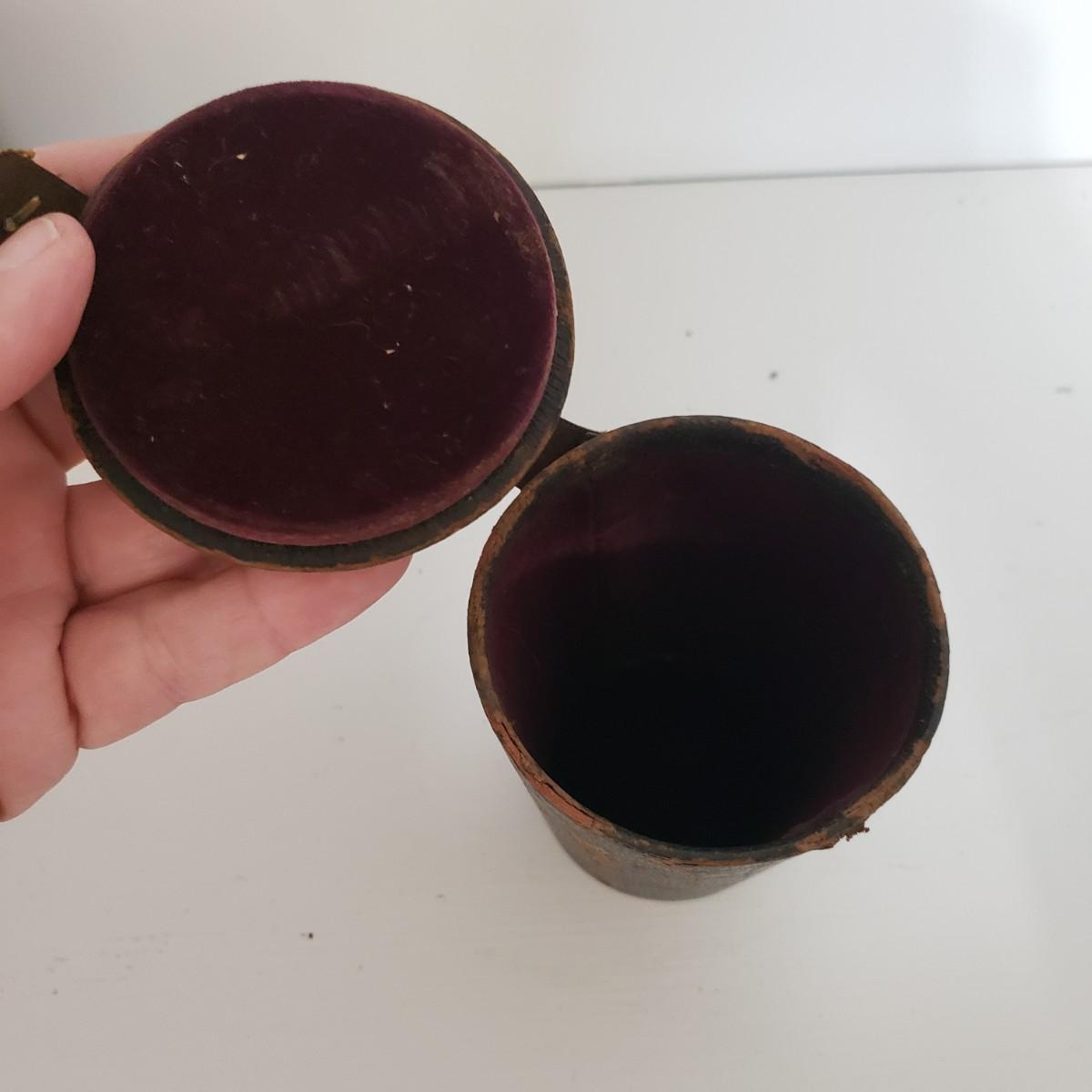 This lot features five unique containers. The wooden circle container has what appears to be a hand painted winter scene. There are small chips around the edges. The smaller wooden circle container measures 2" x 2"H. The small brass box has a sloped inside bottom. The pink suede, hard bottomed pouch, with a draw string handle, measures approximately 6" x 3" x 7"H. The hard bottom appears to be a printed leather. There is a stamped name on the inside, but it seems cut off. The worn black leather pail is lined in a deep red velvet. The one snap is broken, but the prong is still there, for possible repair. The pail measures 3" x 3.5"H. Please see photos for details.