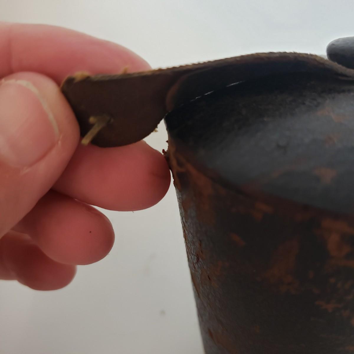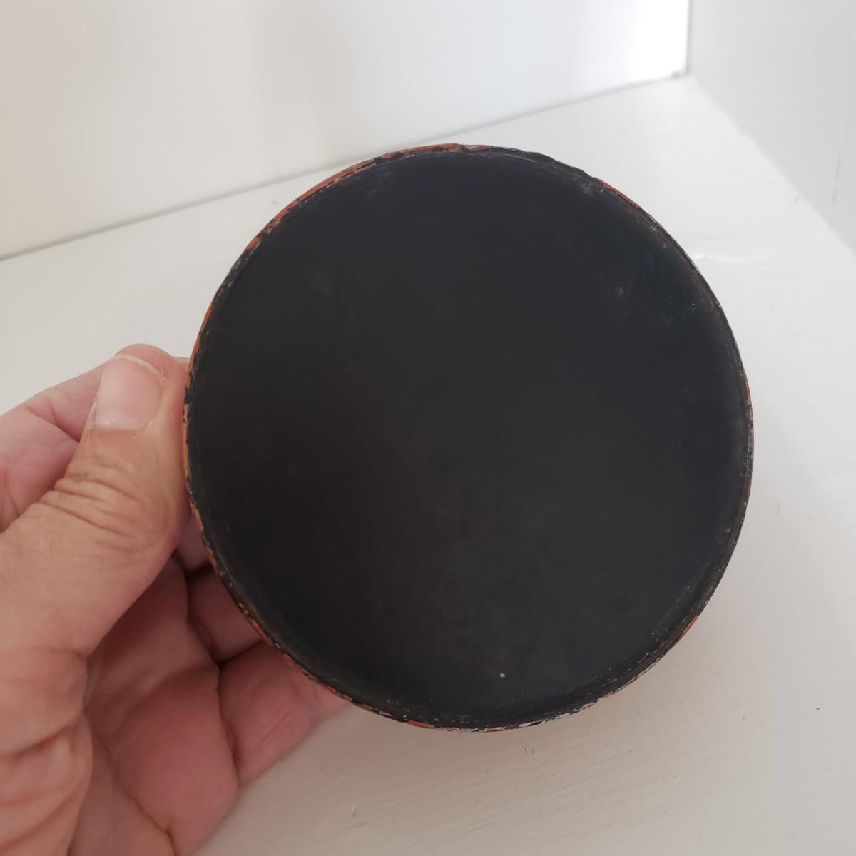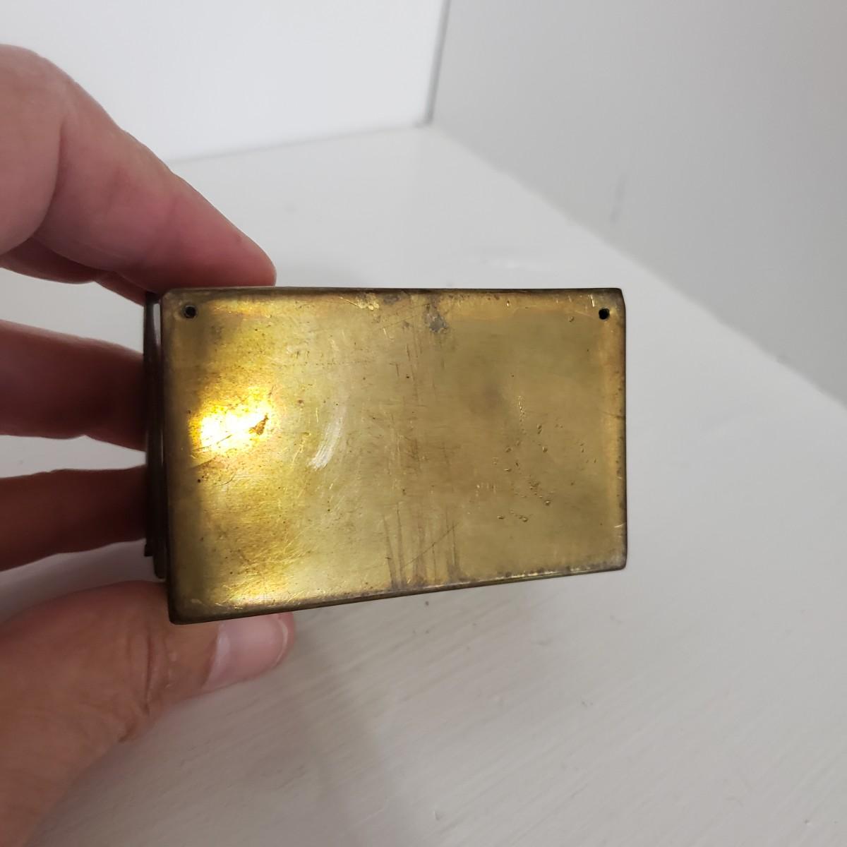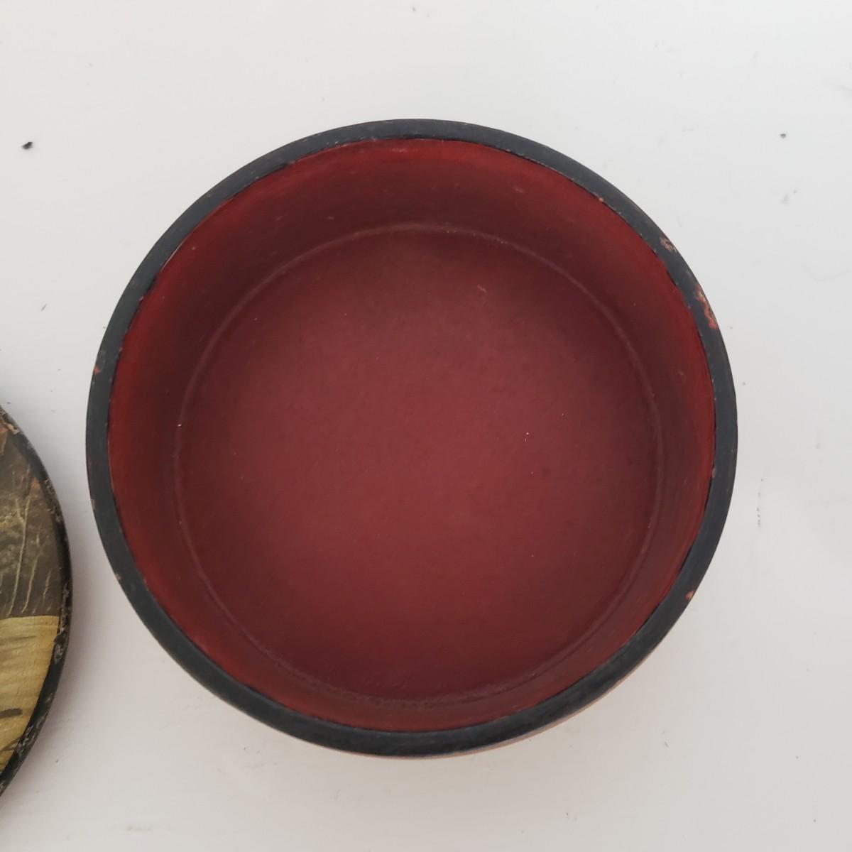 This lot features five unique containers. The wooden circle container has what appears to be a hand painted winter scene. There are small chips around the edges. The smaller wooden circle container measures 2" x 2"H. The small brass box has a sloped inside bottom. The pink suede, hard bottomed pouch, with a draw string handle, measures approximately 6" x 3" x 7"H. The hard bottom appears to be a printed leather. There is a stamped name on the inside, but it seems cut off. The worn black leather pail is lined in a deep red velvet. The one snap is broken, but the prong is still there, for possible repair. The pail measures 3" x 3.5"H. Please see photos for details.