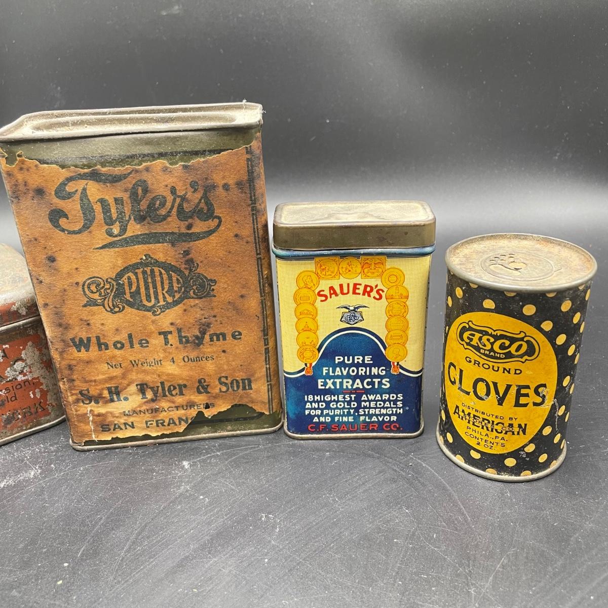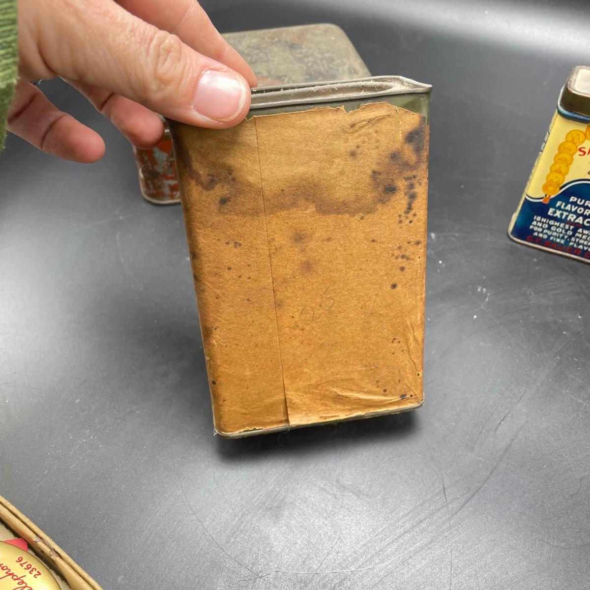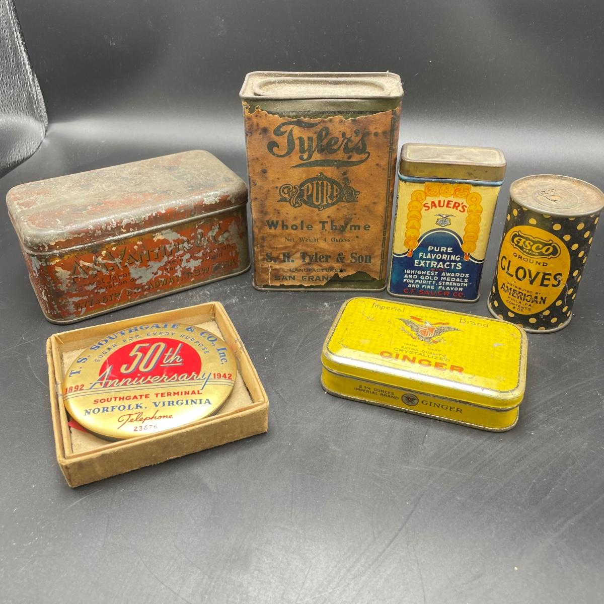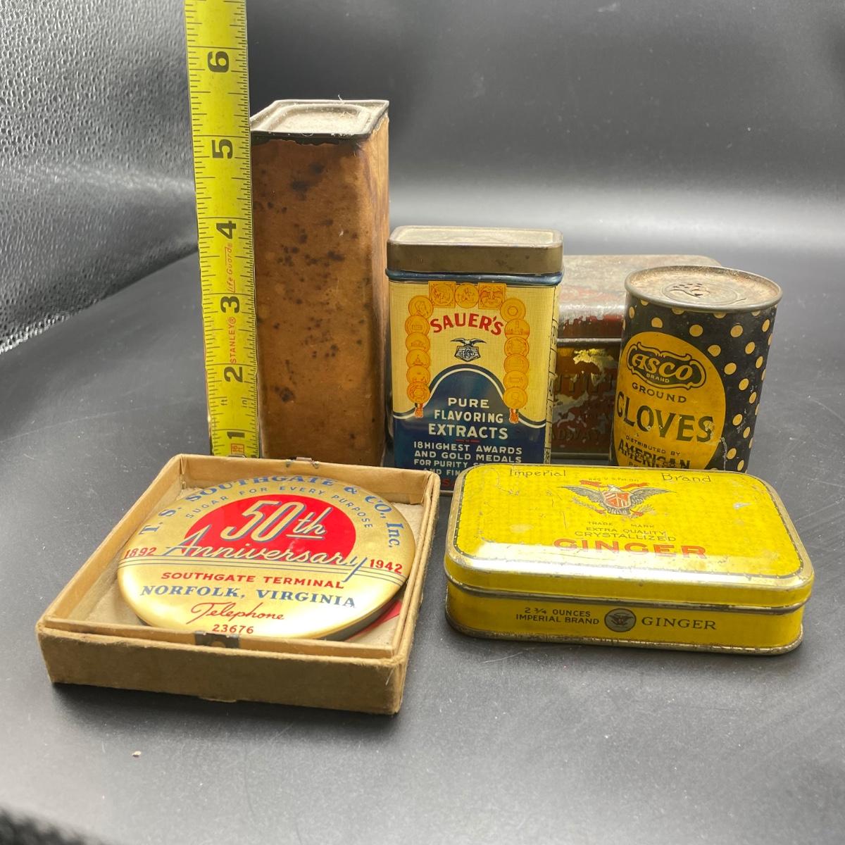 TS Southgate mirror/paperweight with a variety of spices including two clove tins, two ginger tins and a paper covered Tyler’s Whole Thyme. There is a faded Vantines ginger box. There is some weight inside the whole thyme tin and the Sauer’s tin with some aromatic cloves still inside. See images. Shipping available.