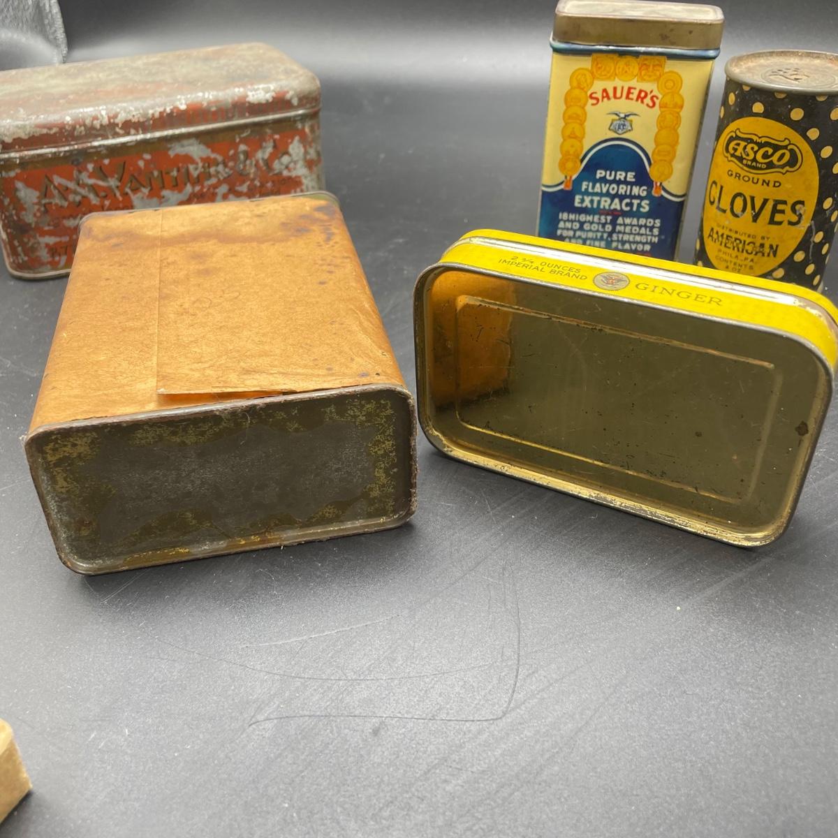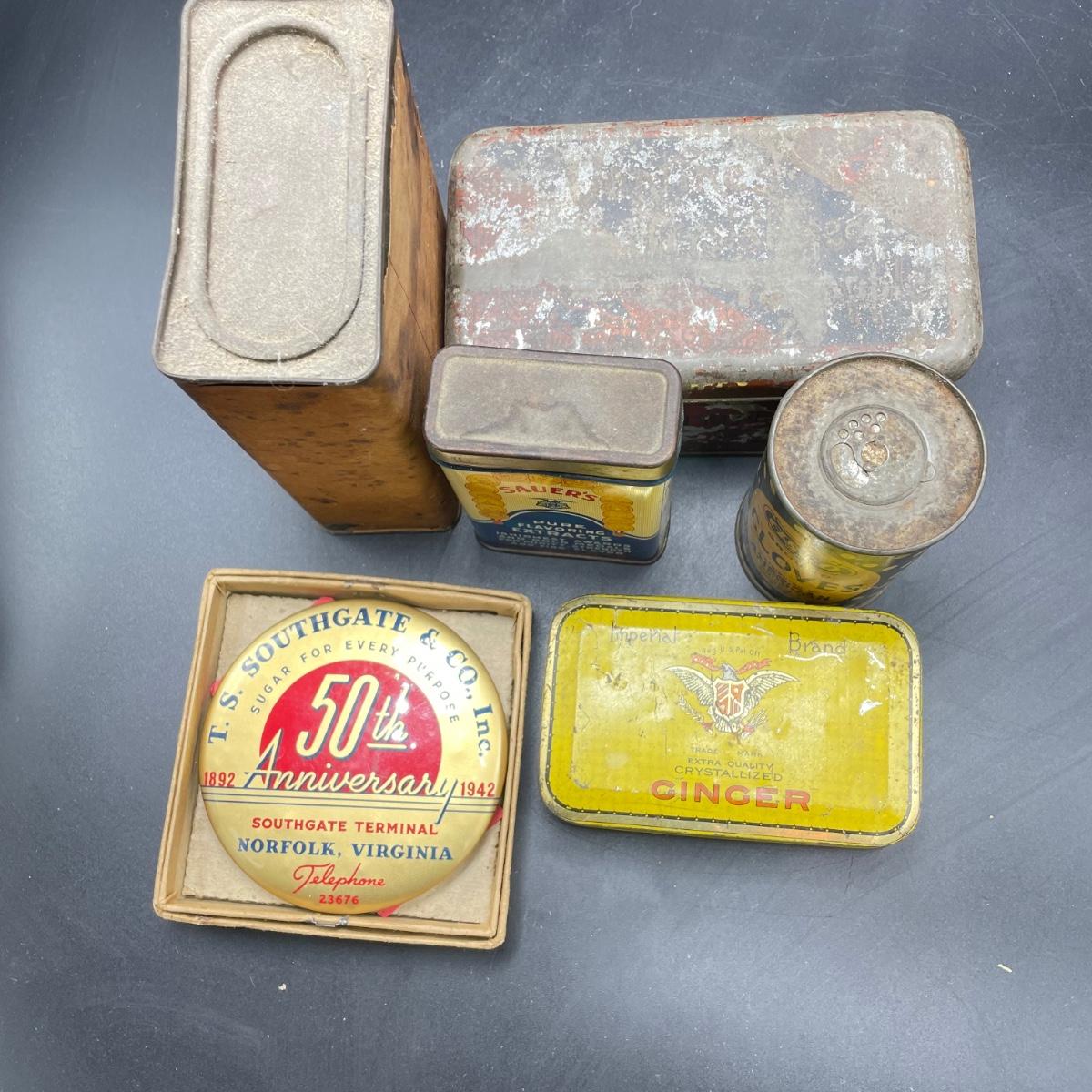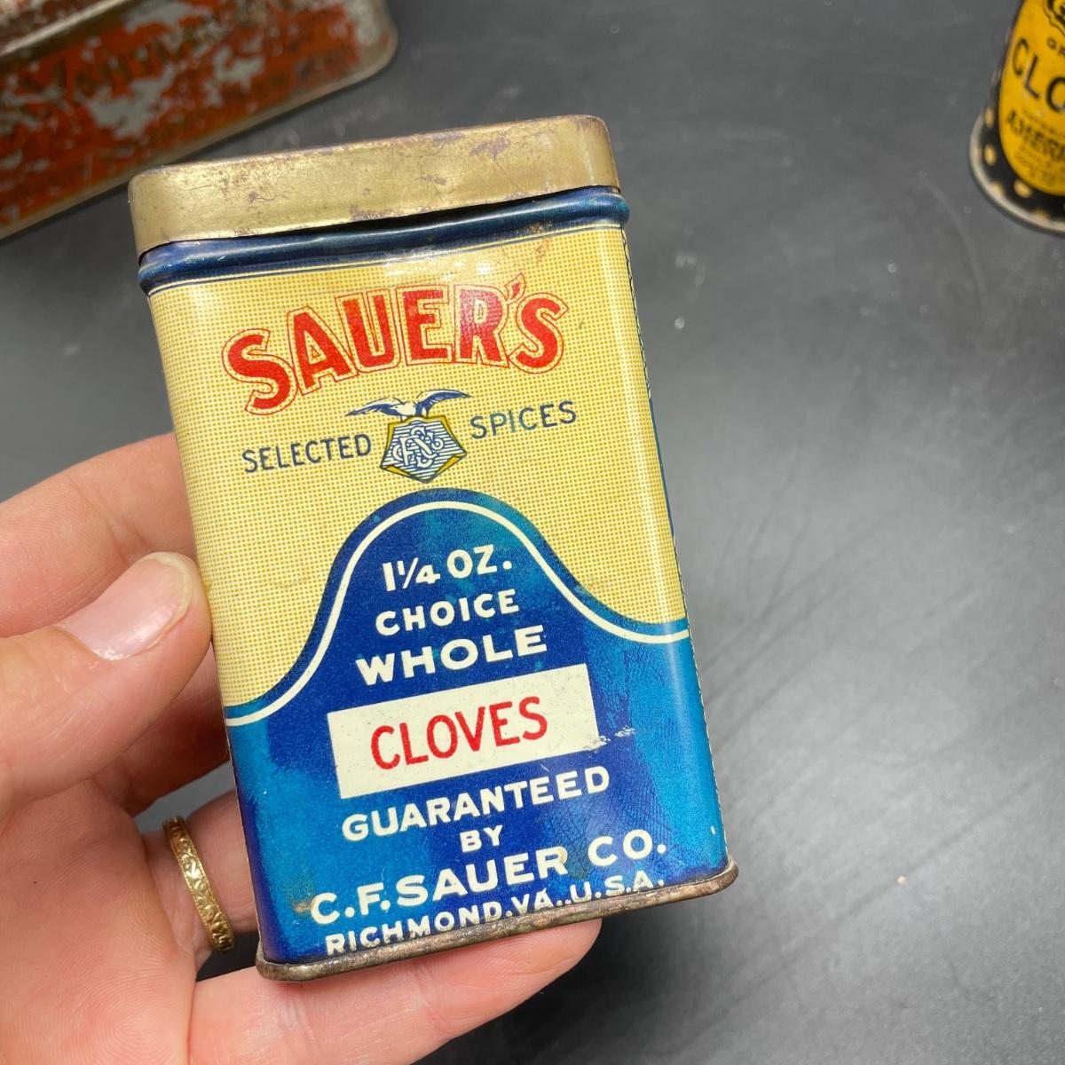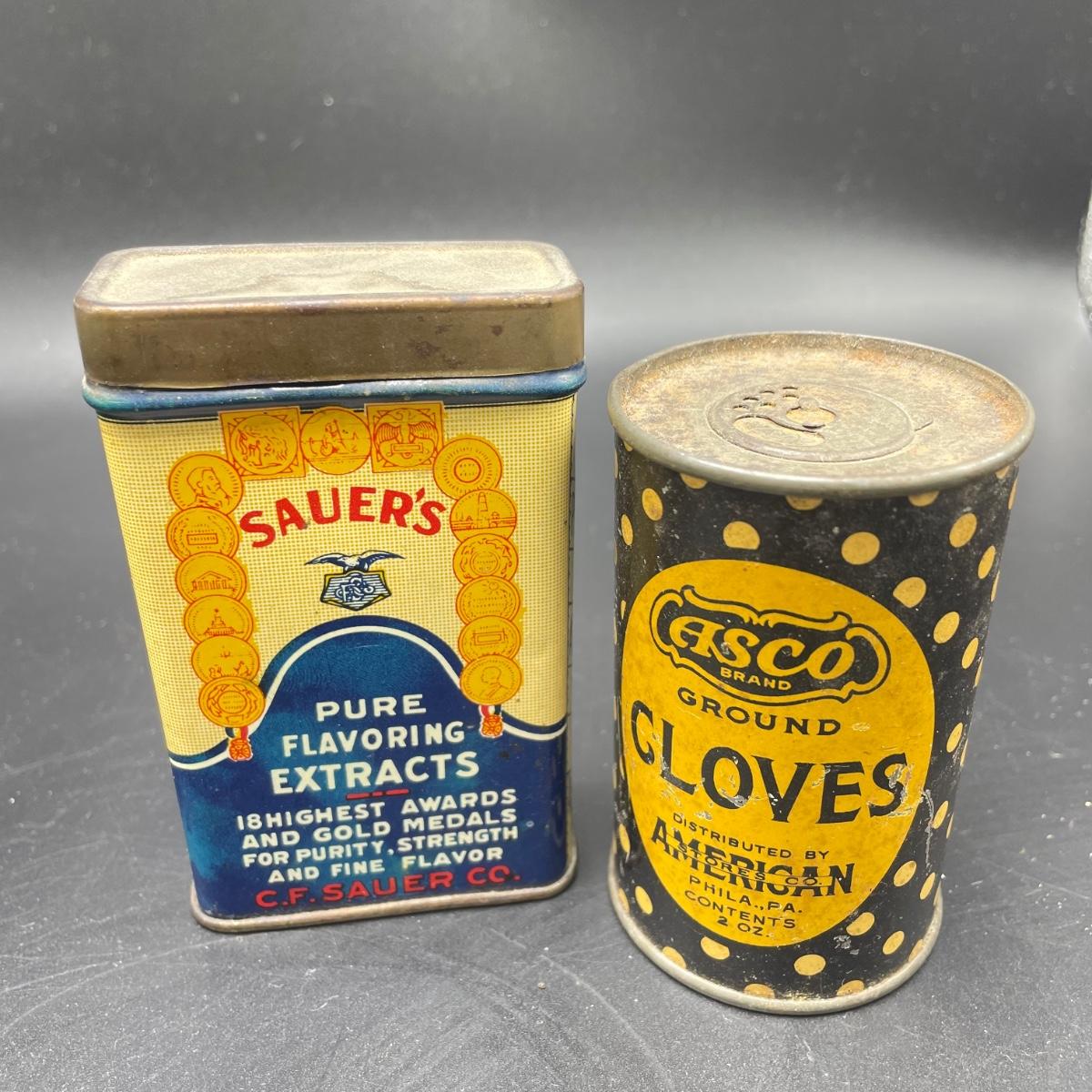 TS Southgate mirror/paperweight with a variety of spices including two clove tins, two ginger tins and a paper covered Tyler’s Whole Thyme. There is a faded Vantines ginger box. There is some weight inside the whole thyme tin and the Sauer’s tin with some aromatic cloves still inside. See images. Shipping available.