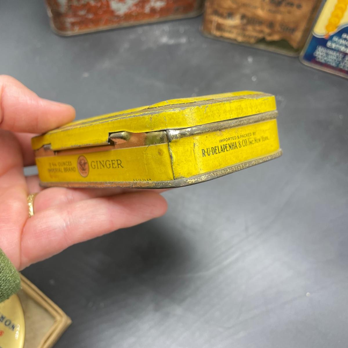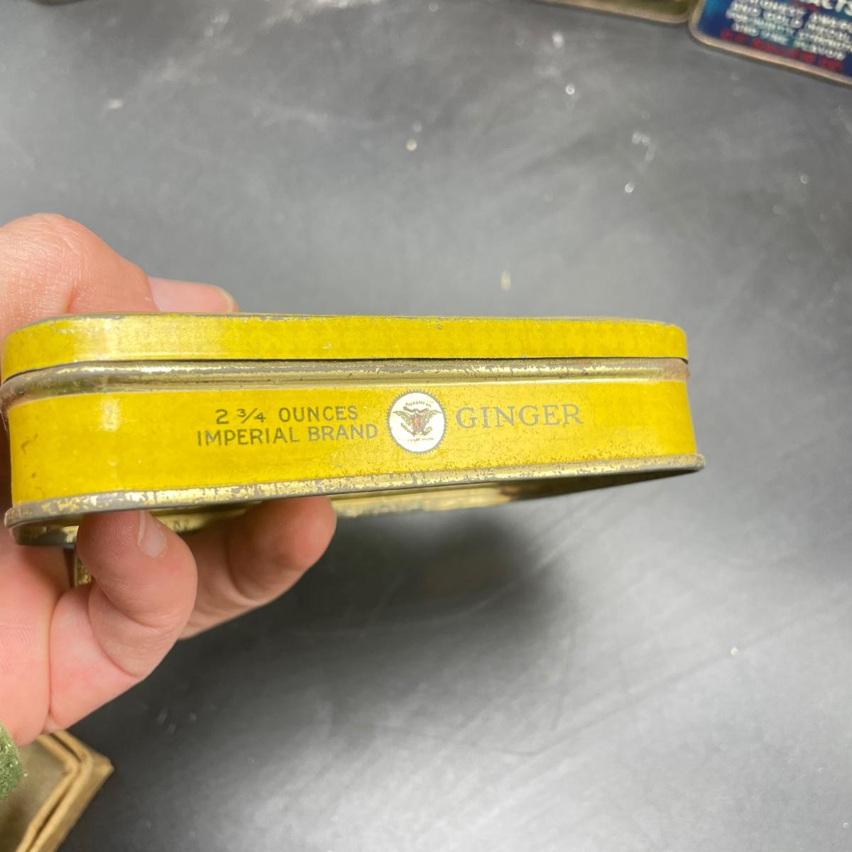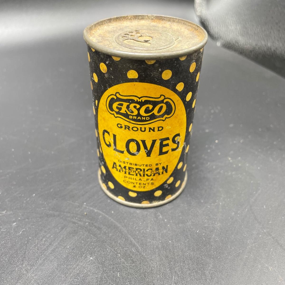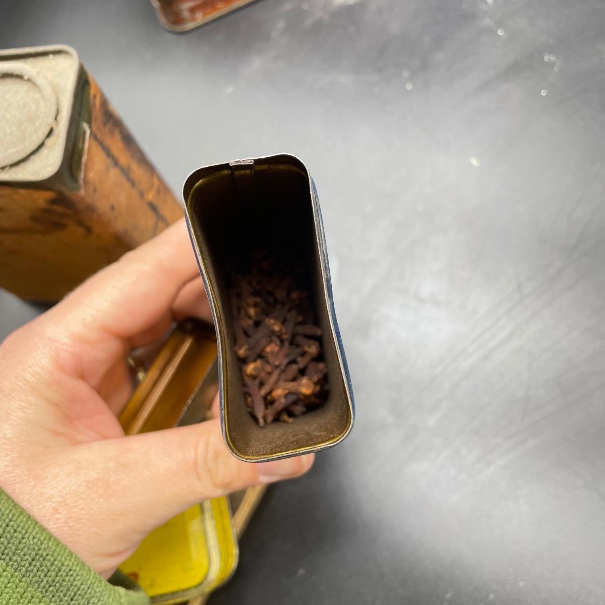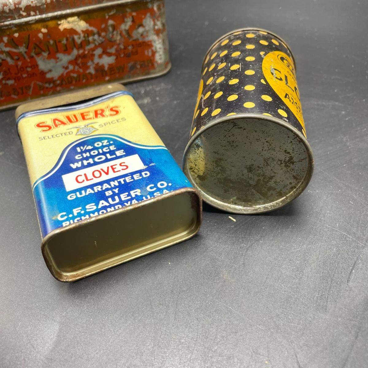 TS Southgate mirror/paperweight with a variety of spices including two clove tins, two ginger tins and a paper covered Tyler’s Whole Thyme. There is a faded Vantines ginger box. There is some weight inside the whole thyme tin and the Sauer’s tin with some aromatic cloves still inside. See images. Shipping available.