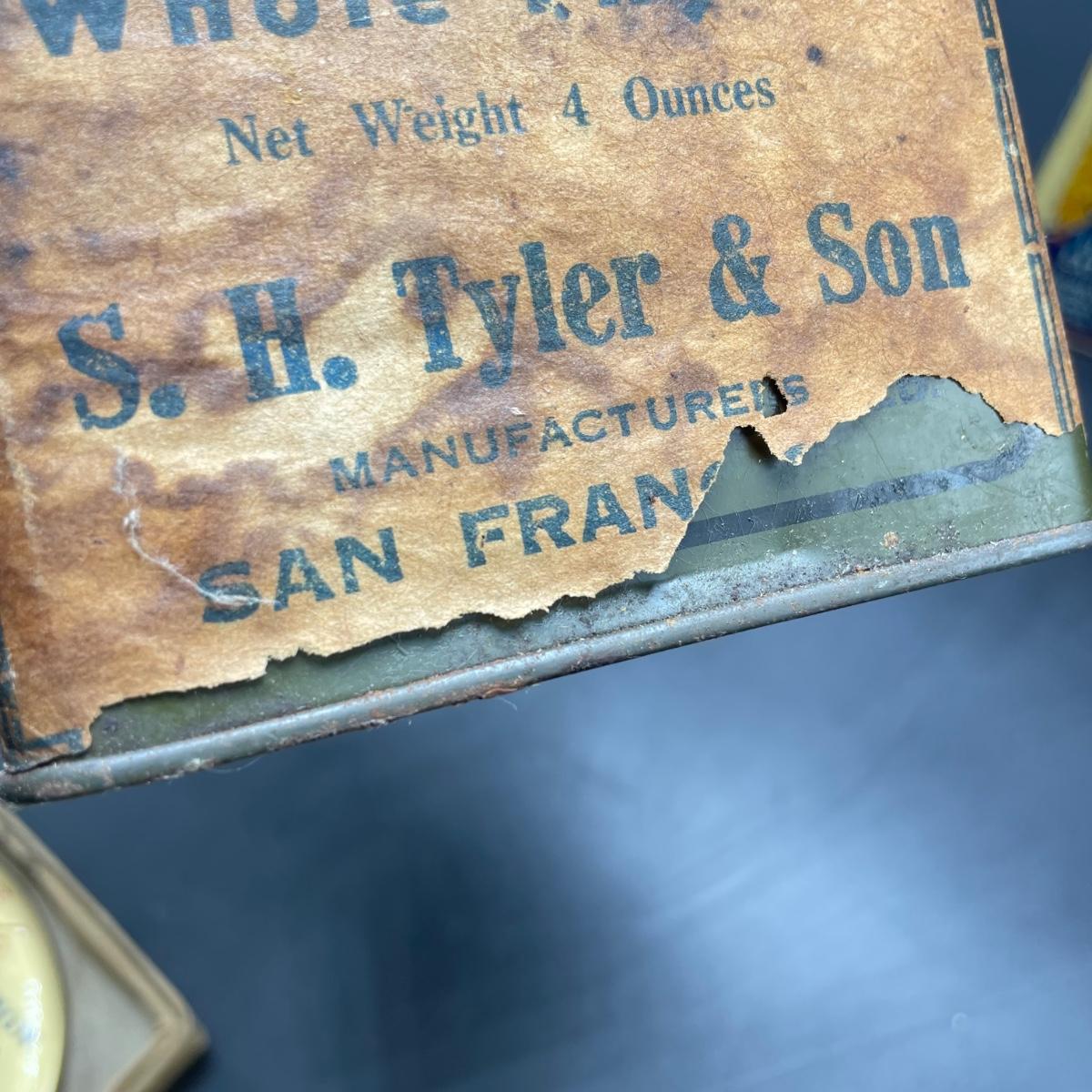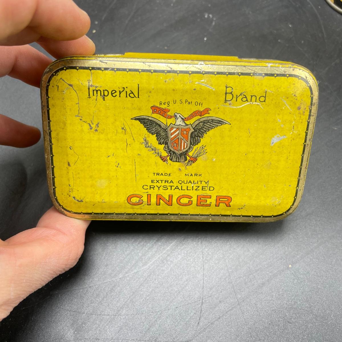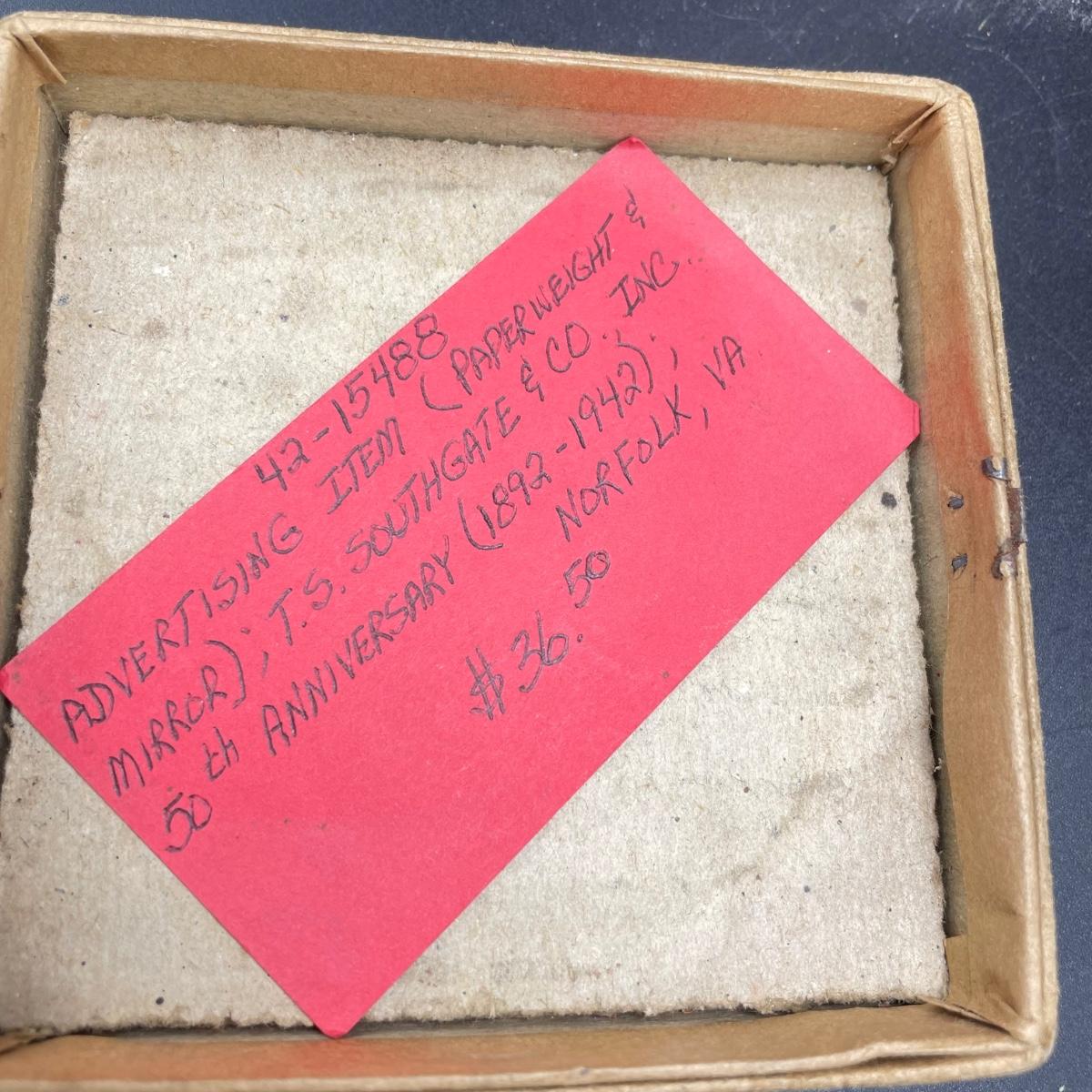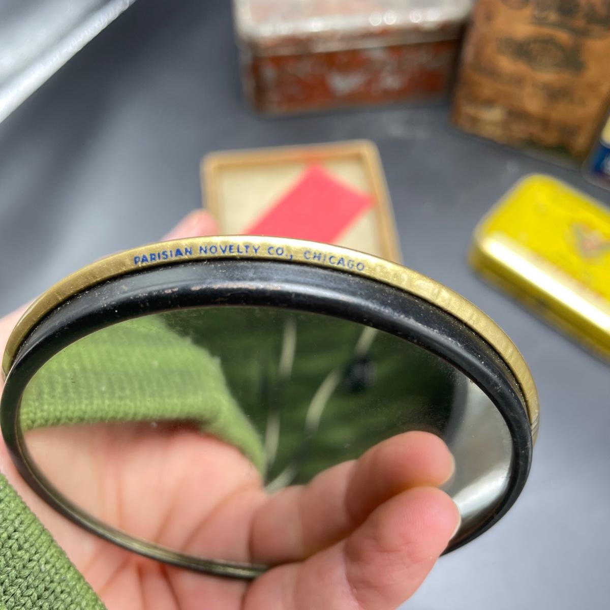 TS Southgate mirror/paperweight with a variety of spices including two clove tins, two ginger tins and a paper covered Tyler’s Whole Thyme. There is a faded Vantines ginger box. There is some weight inside the whole thyme tin and the Sauer’s tin with some aromatic cloves still inside. See images. Shipping available.