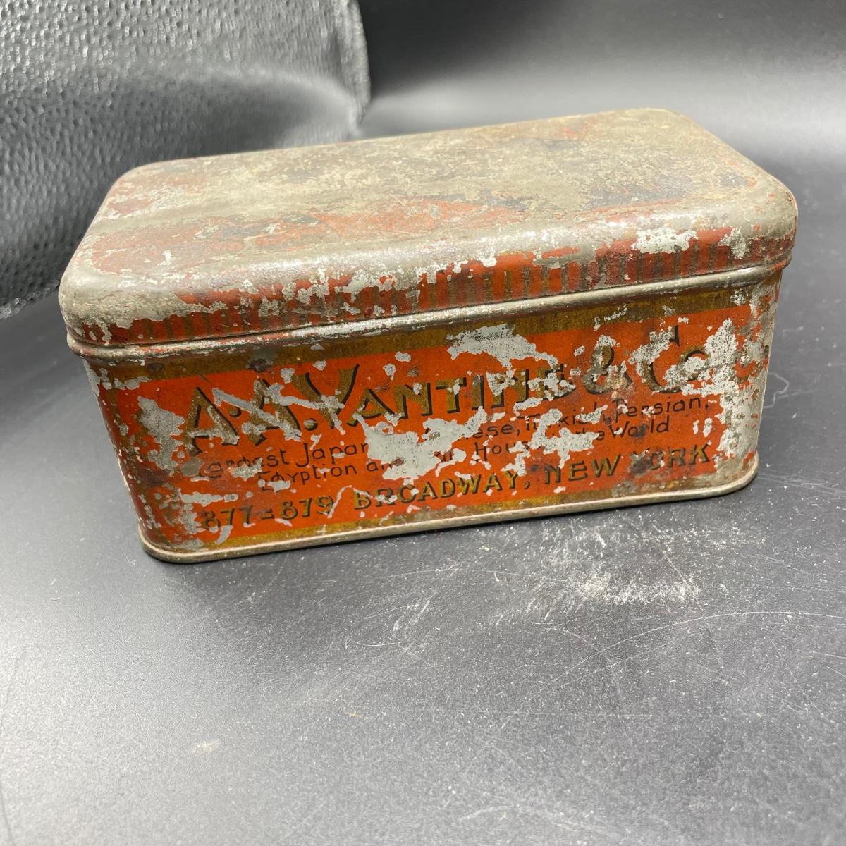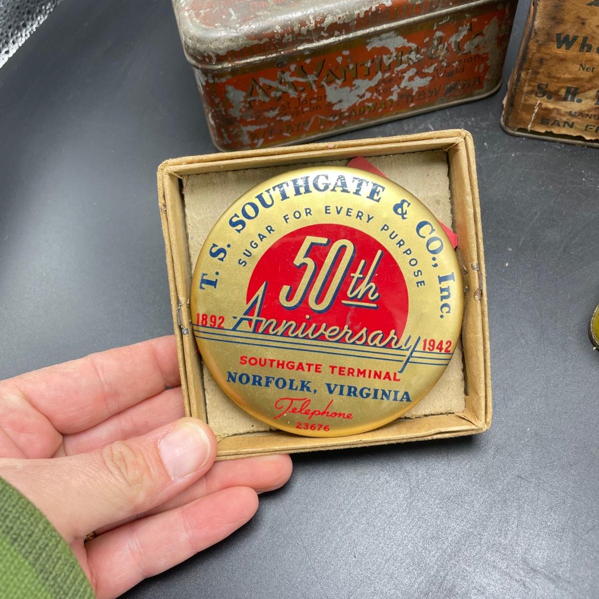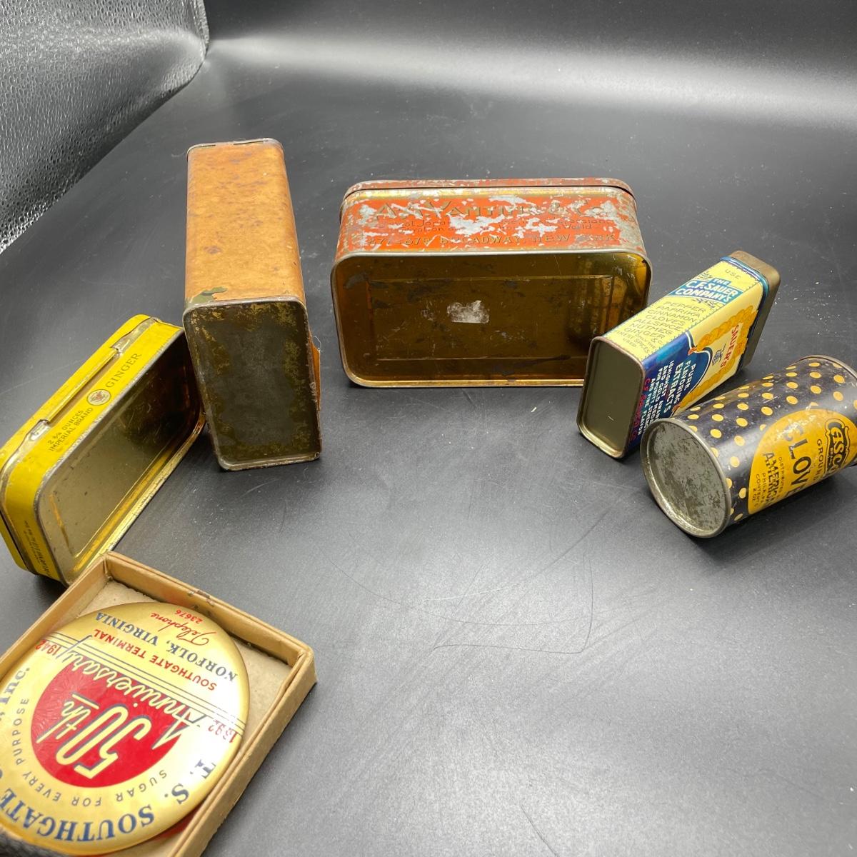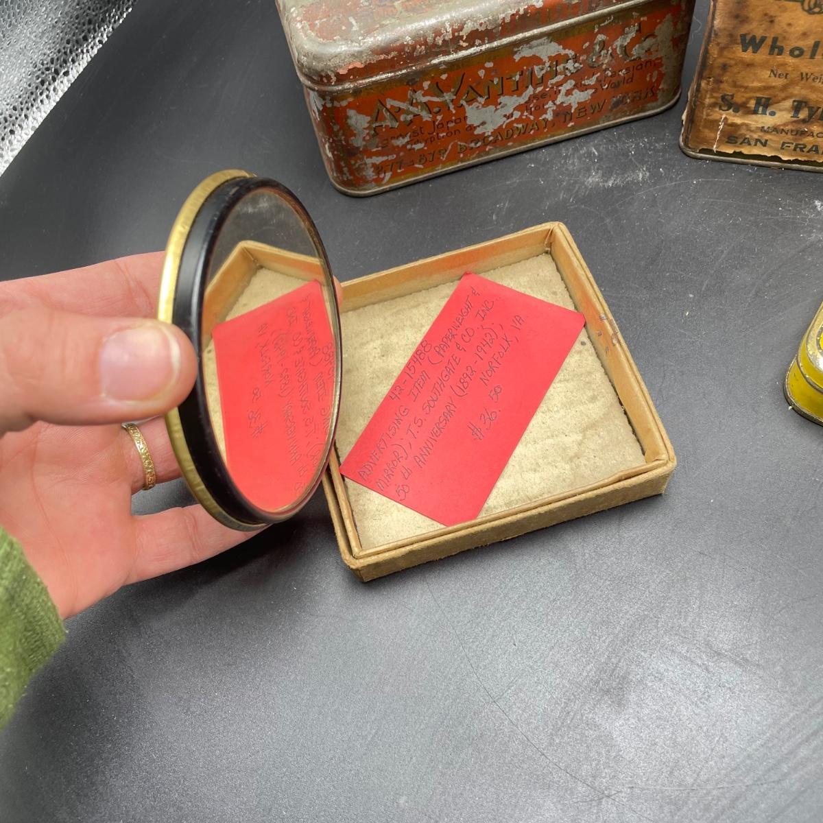 TS Southgate mirror/paperweight with a variety of spices including two clove tins, two ginger tins and a paper covered Tyler’s Whole Thyme. There is a faded Vantines ginger box. There is some weight inside the whole thyme tin and the Sauer’s tin with some aromatic cloves still inside. See images. Shipping available.