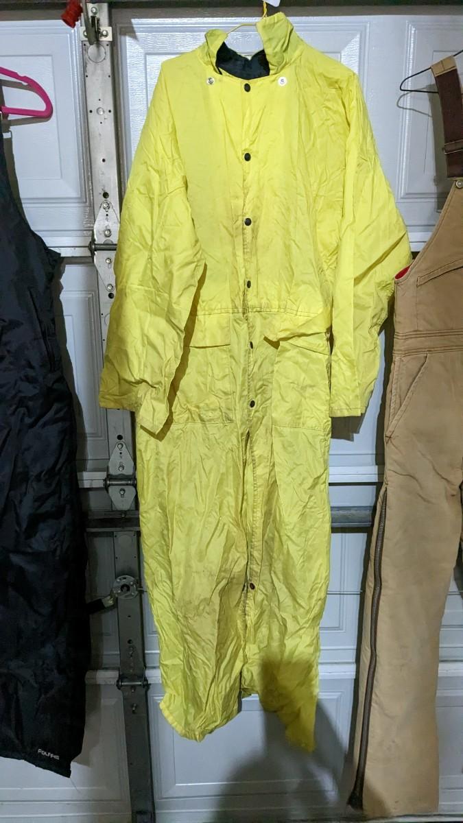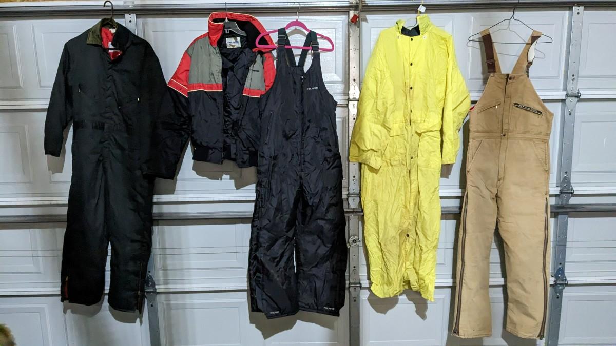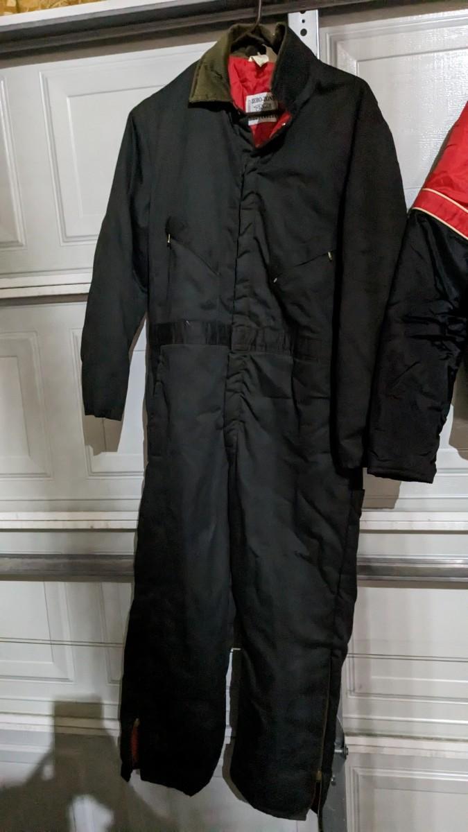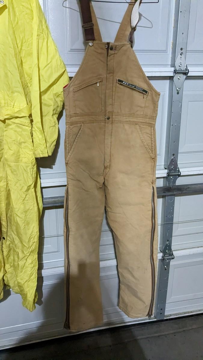 Key Imperial Aristocrat of Outerwear Carhartt style coveralls, Medium Long- pockets show wear, in otherwise great shape. Polaris wno overalls and coat, pants are medium, coat is Large Long and has trouble zipping, and Zero Zone work suit. Also includes long large poncho. All useable and nice vintage pieces. 2604