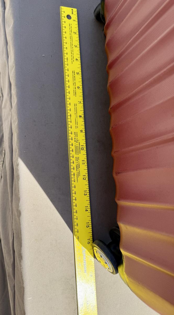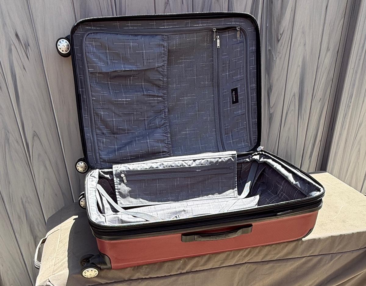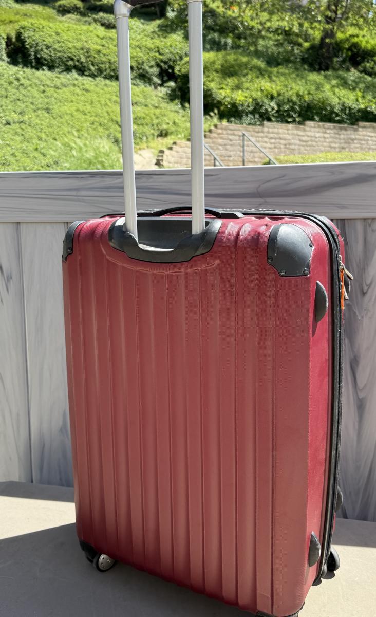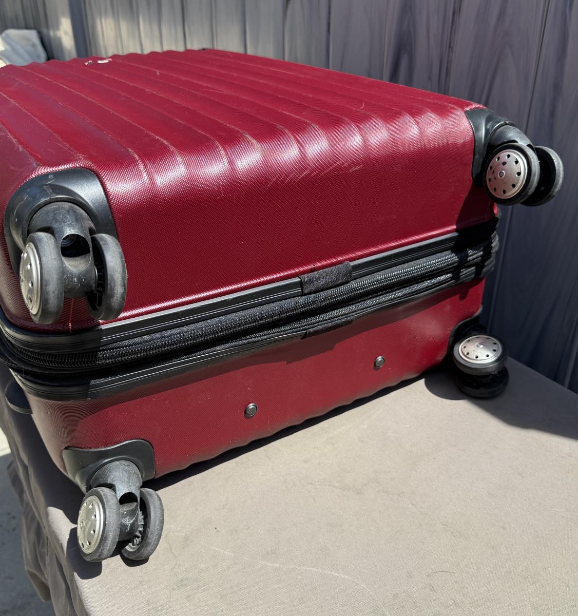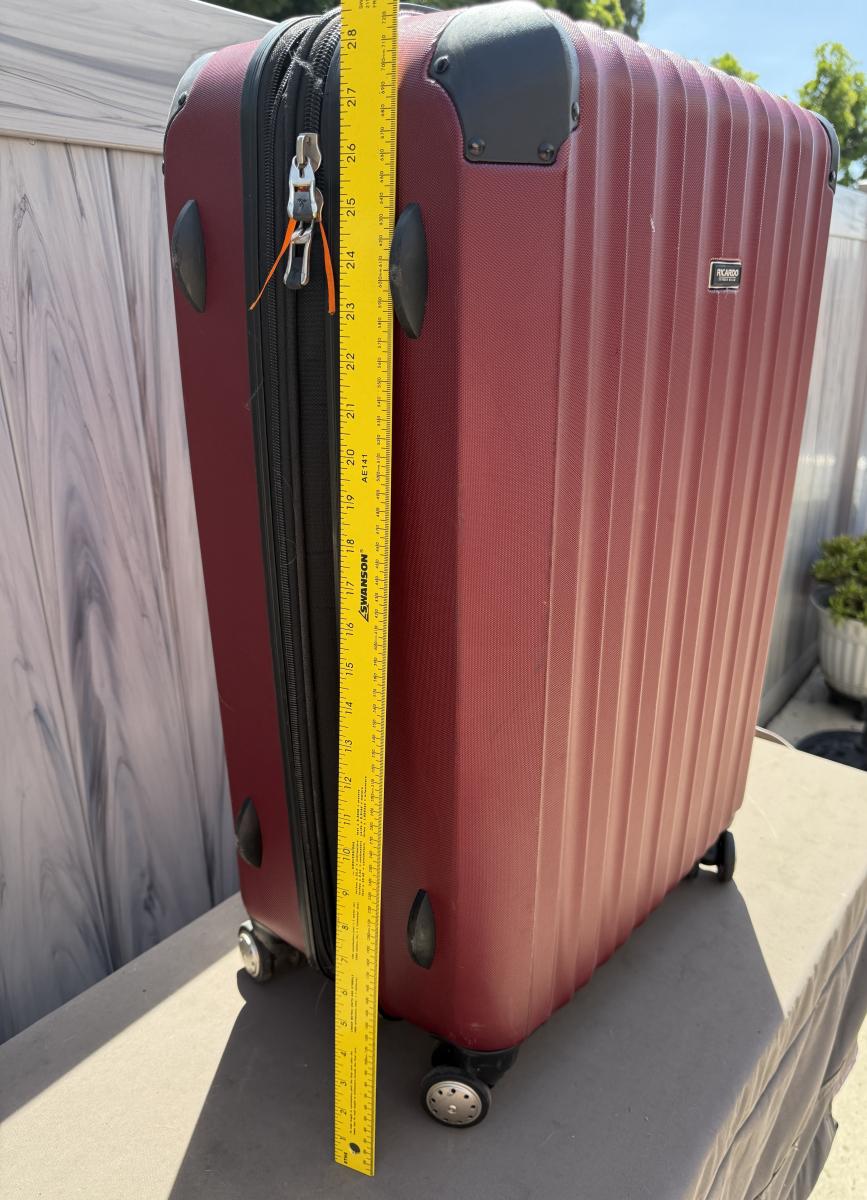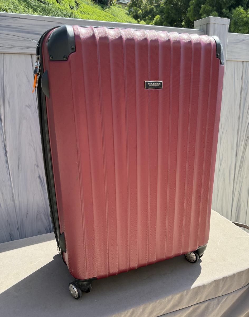 Red Ricardo Beverly Hills 27" expandable check-in spinner-style suitcase. 4 spinner wheels, zero effort to roll, riveted corner guards, retractable handle. Expandable for added space when needed. Some wear marks from use, but in overall very good condition.