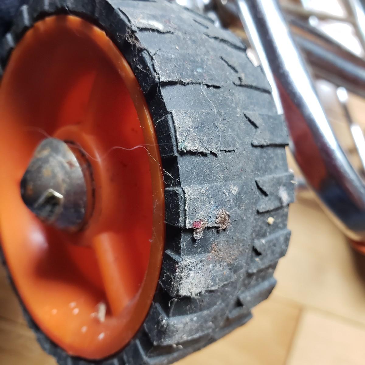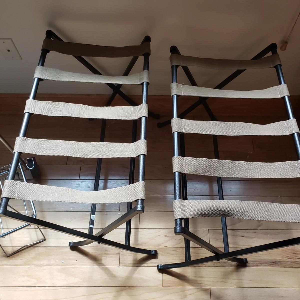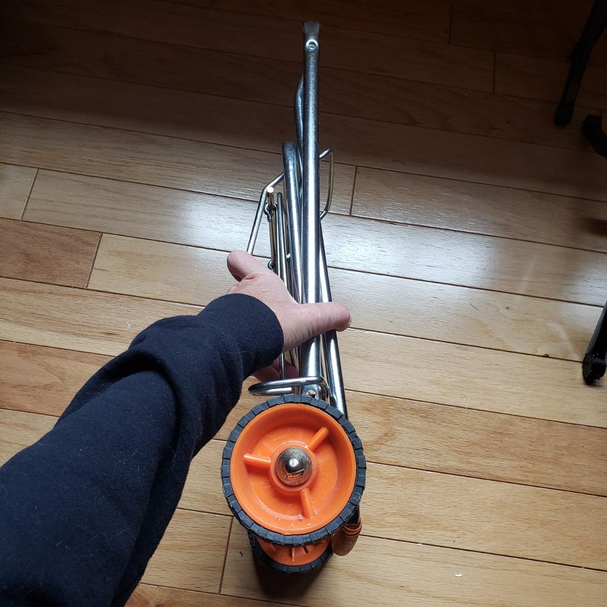 This lot has two identical luggage racks that measure 28" x 16" x 22"H. They are made of metal and thick canvas straps. The trolley that comes in a vinyl storage bag is made by Concorde. The other trolley with an orange plastic grip measures 12" x 14" x 36"H and folds down to 21" x 12" x 4"H.