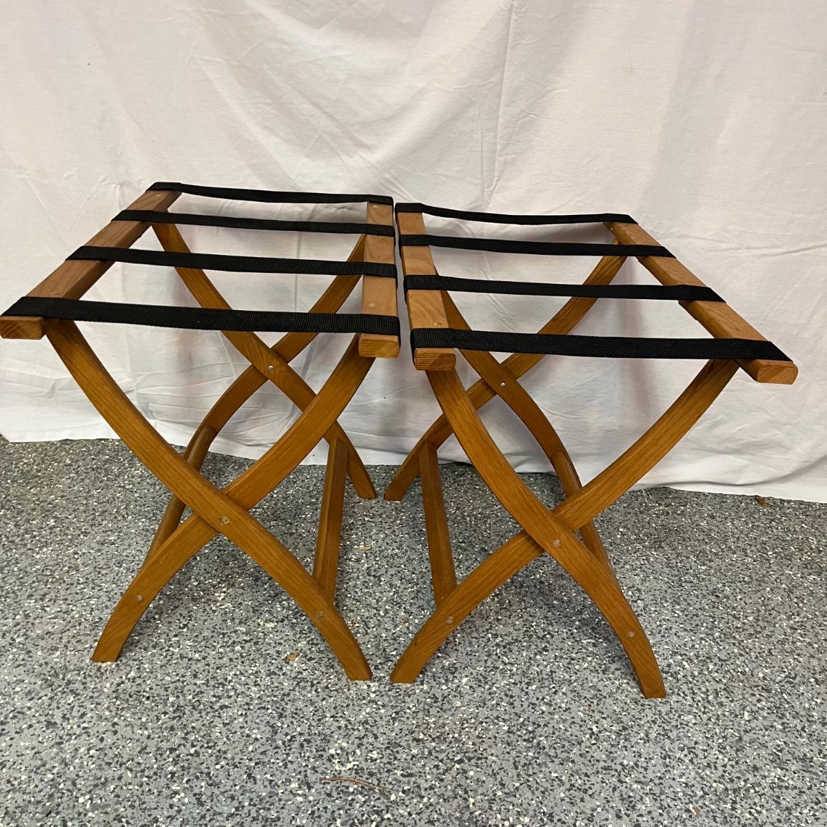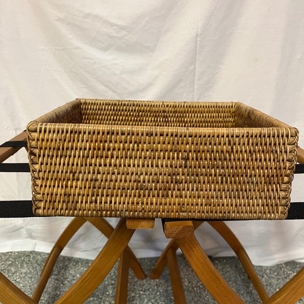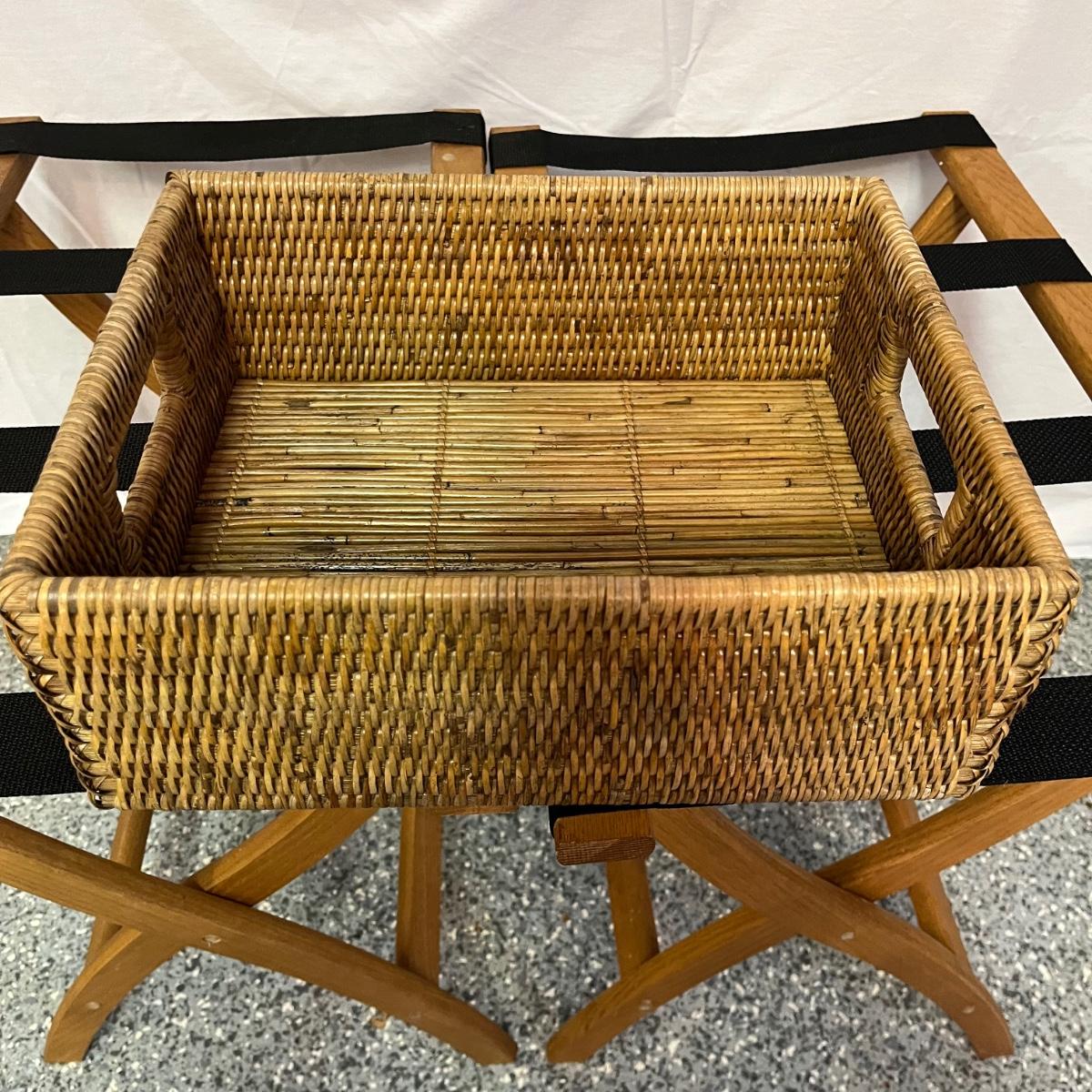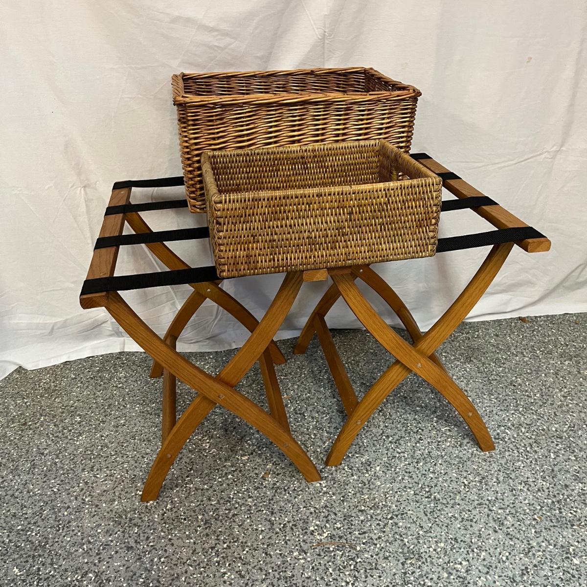 Lot includes two folding wooden suitcase stands with black webbing and two woven baskets. Largest basket measures 15” x 18” x 9”H.
