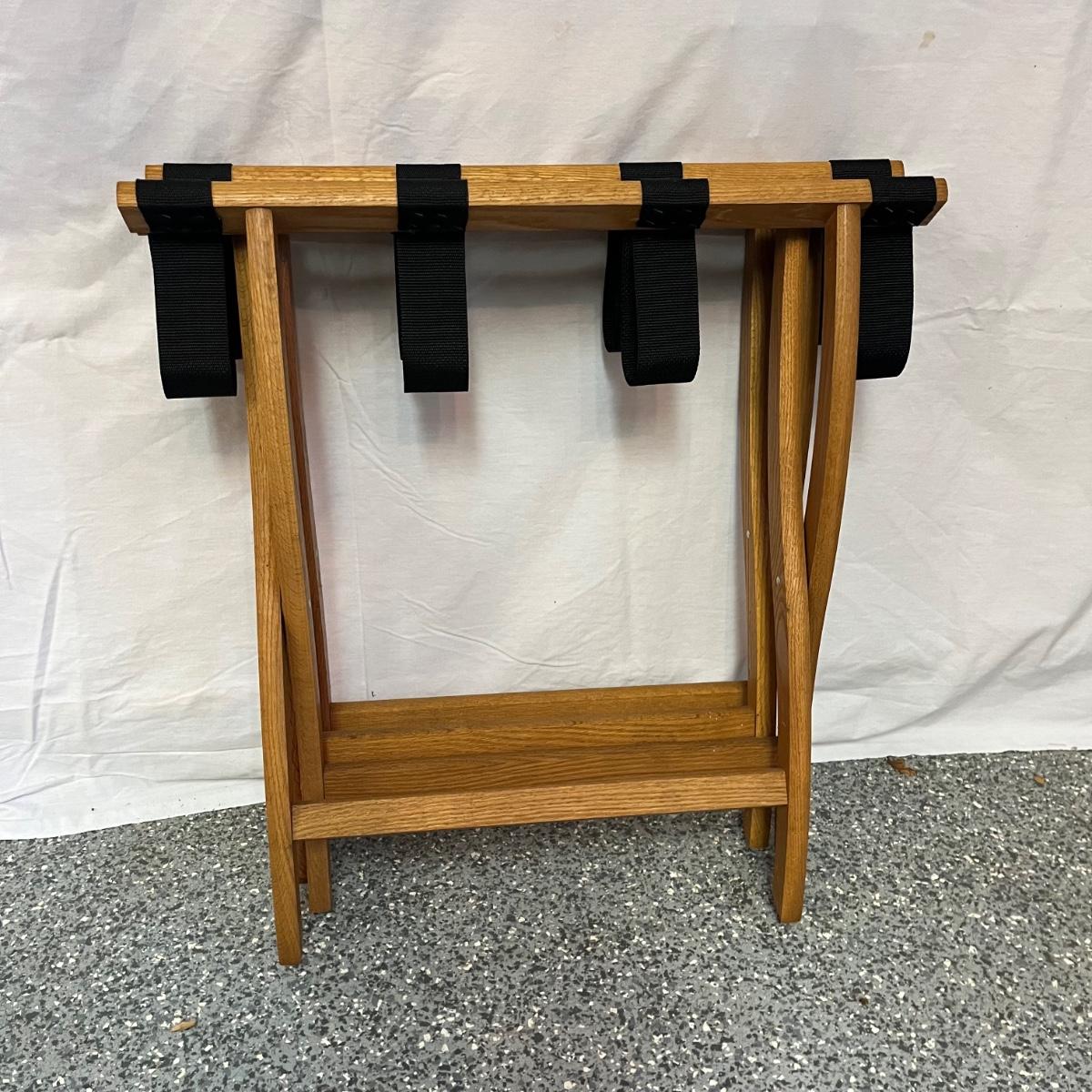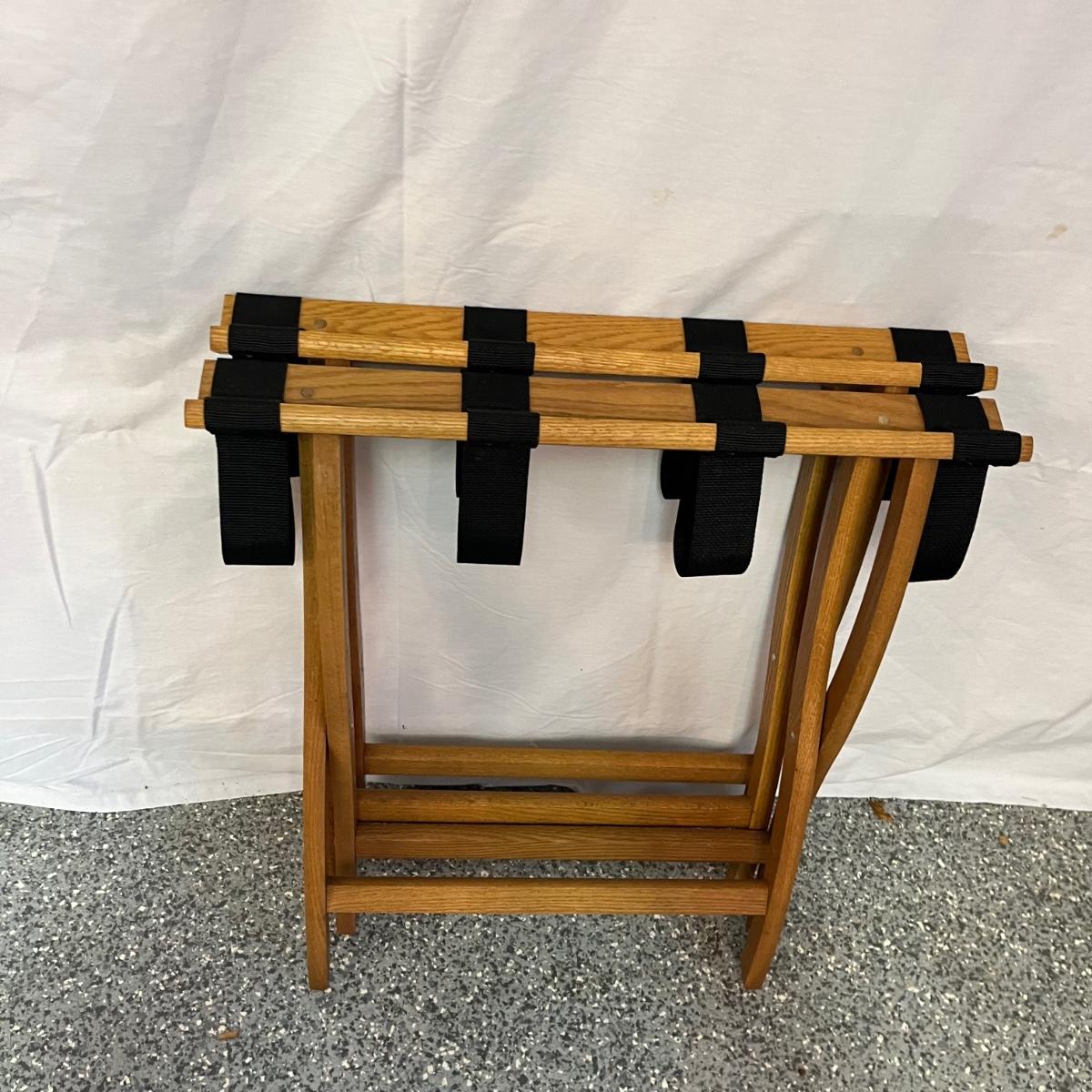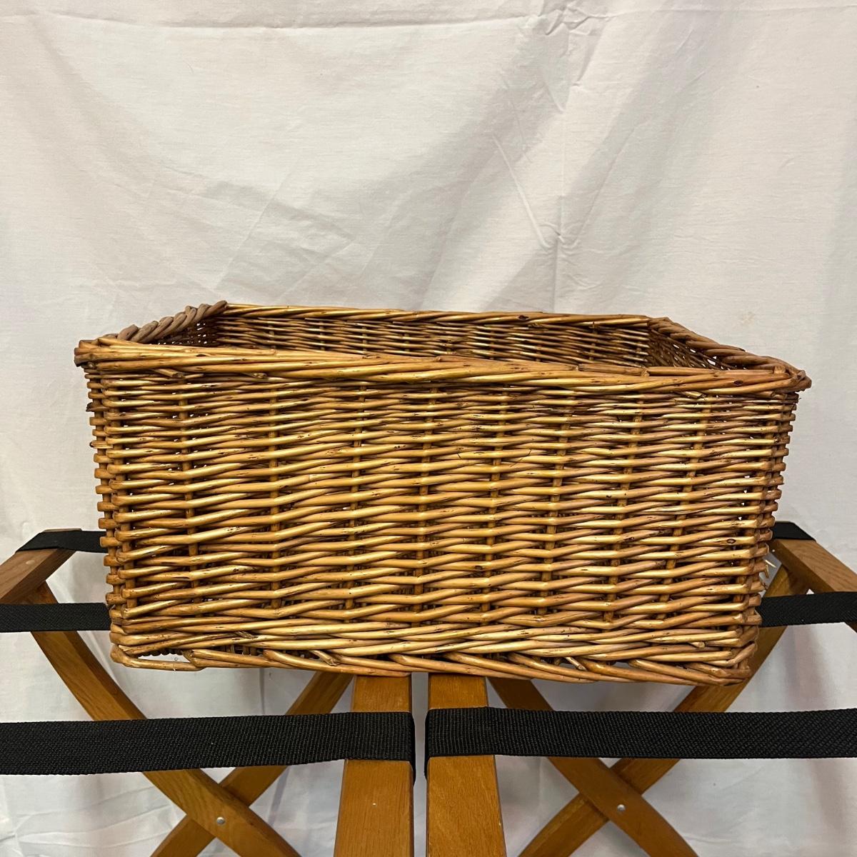 Lot includes two folding wooden suitcase stands with black webbing and two woven baskets. Largest basket measures 15” x 18” x 9”H.