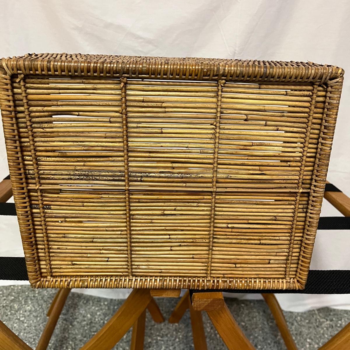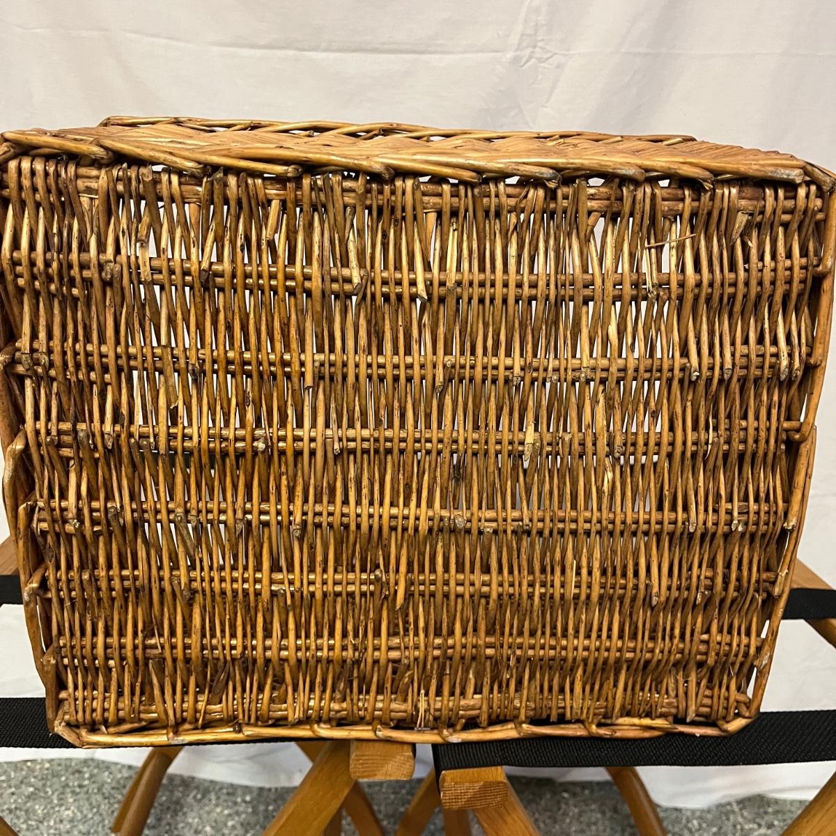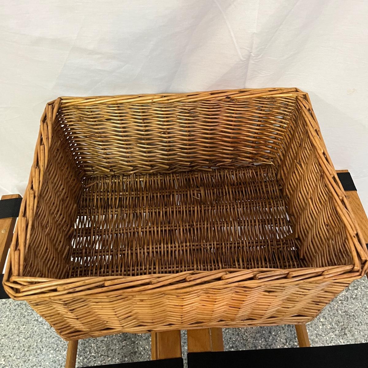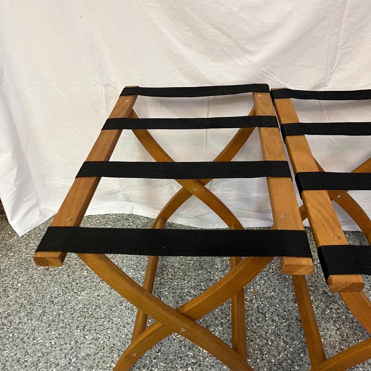 Lot includes two folding wooden suitcase stands with black webbing and two woven baskets. Largest basket measures 15” x 18” x 9”H.