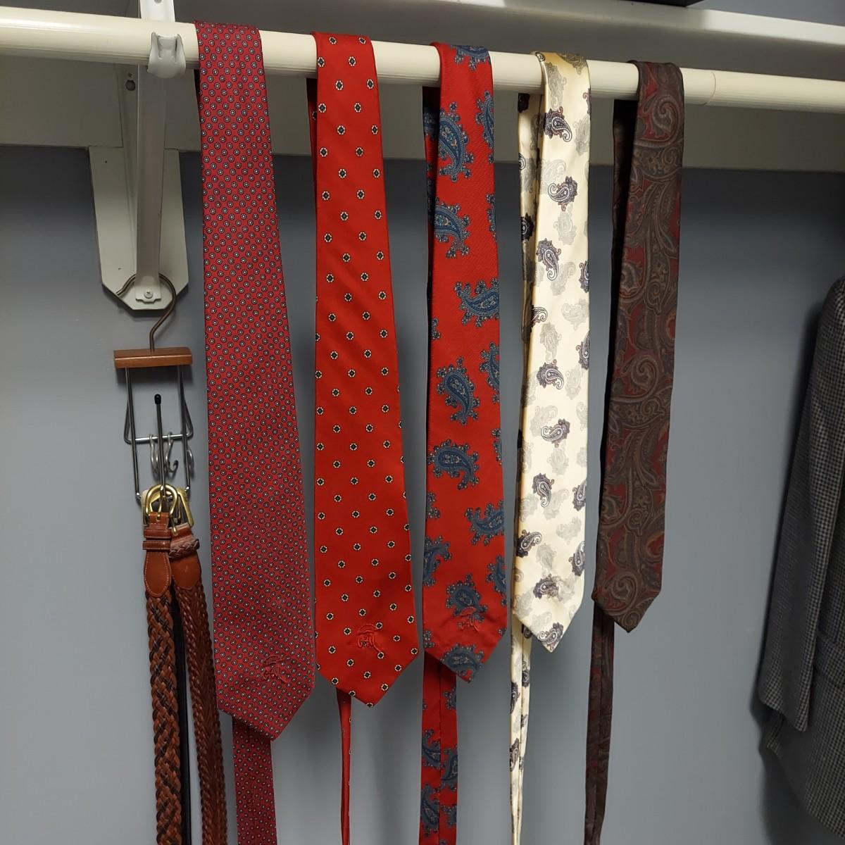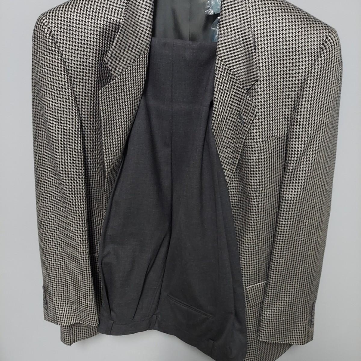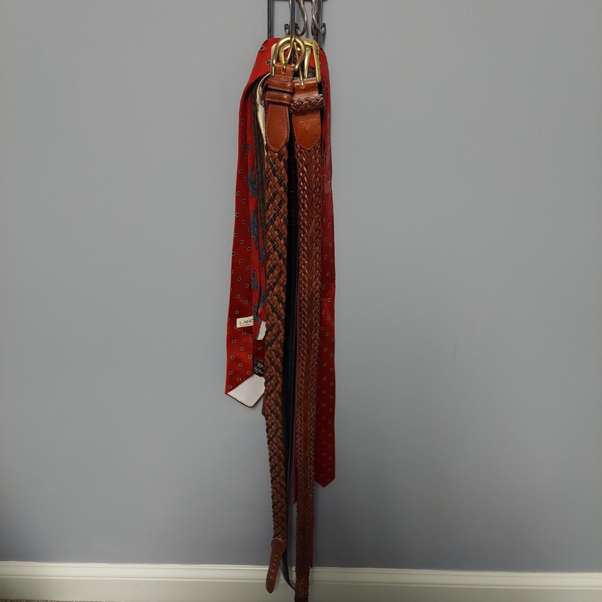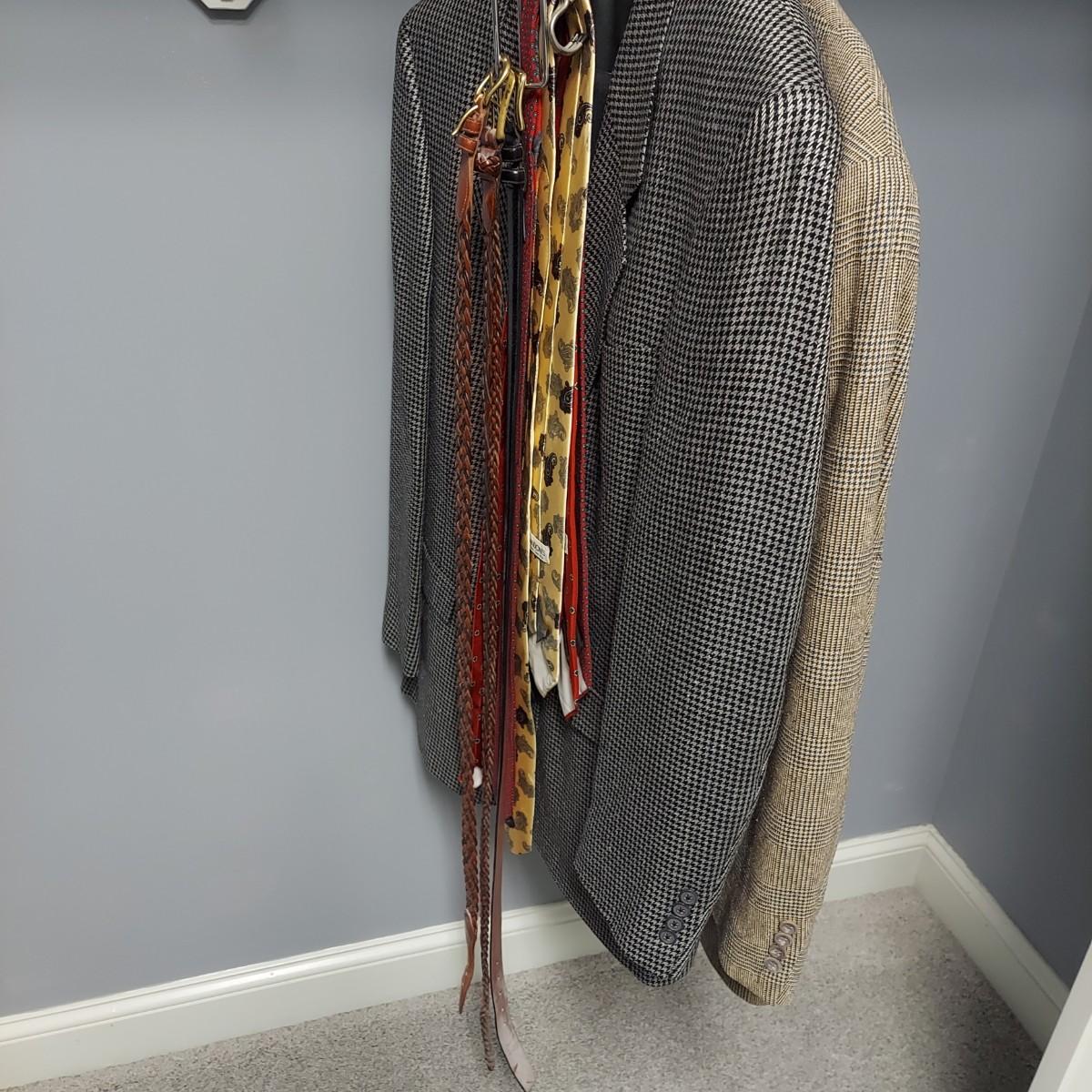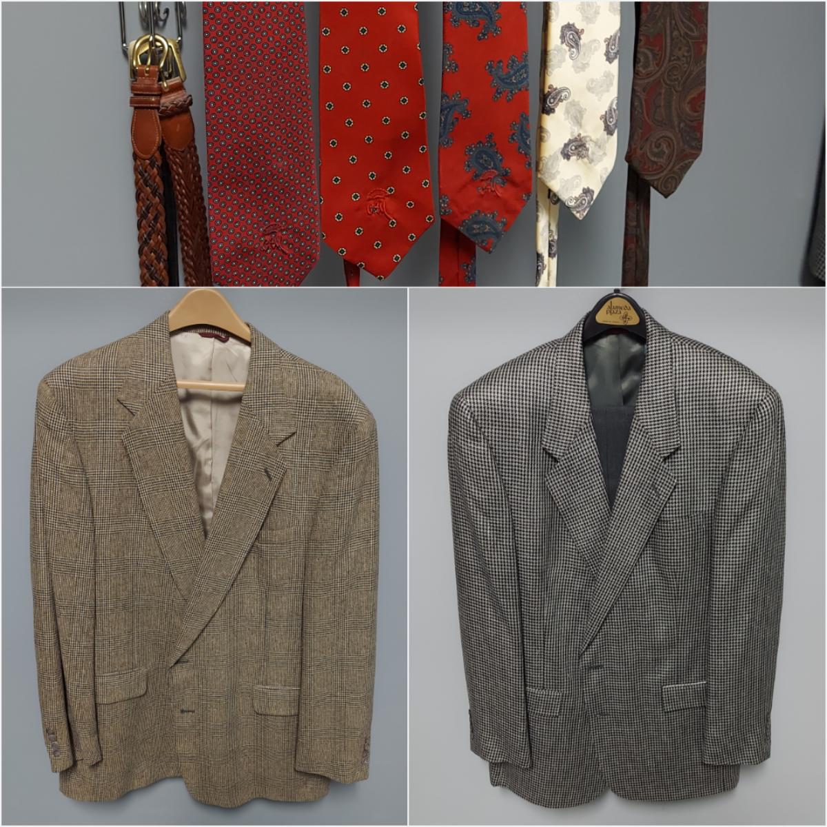 Lot includes pants and a jacket by Hart Shaffner & Marx. Sizes are unmarked. Pants appear to be roughly a 36 waist. Jacket fits Large to XL. Also includes a jacket by Briar Traditional Apparel, five ties and three leather belts. One belt is Coach brand. Please see photos for details. Shipping available