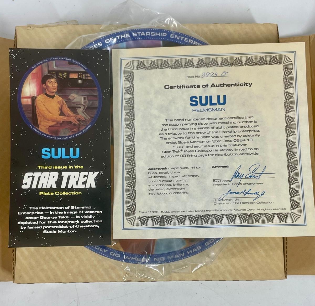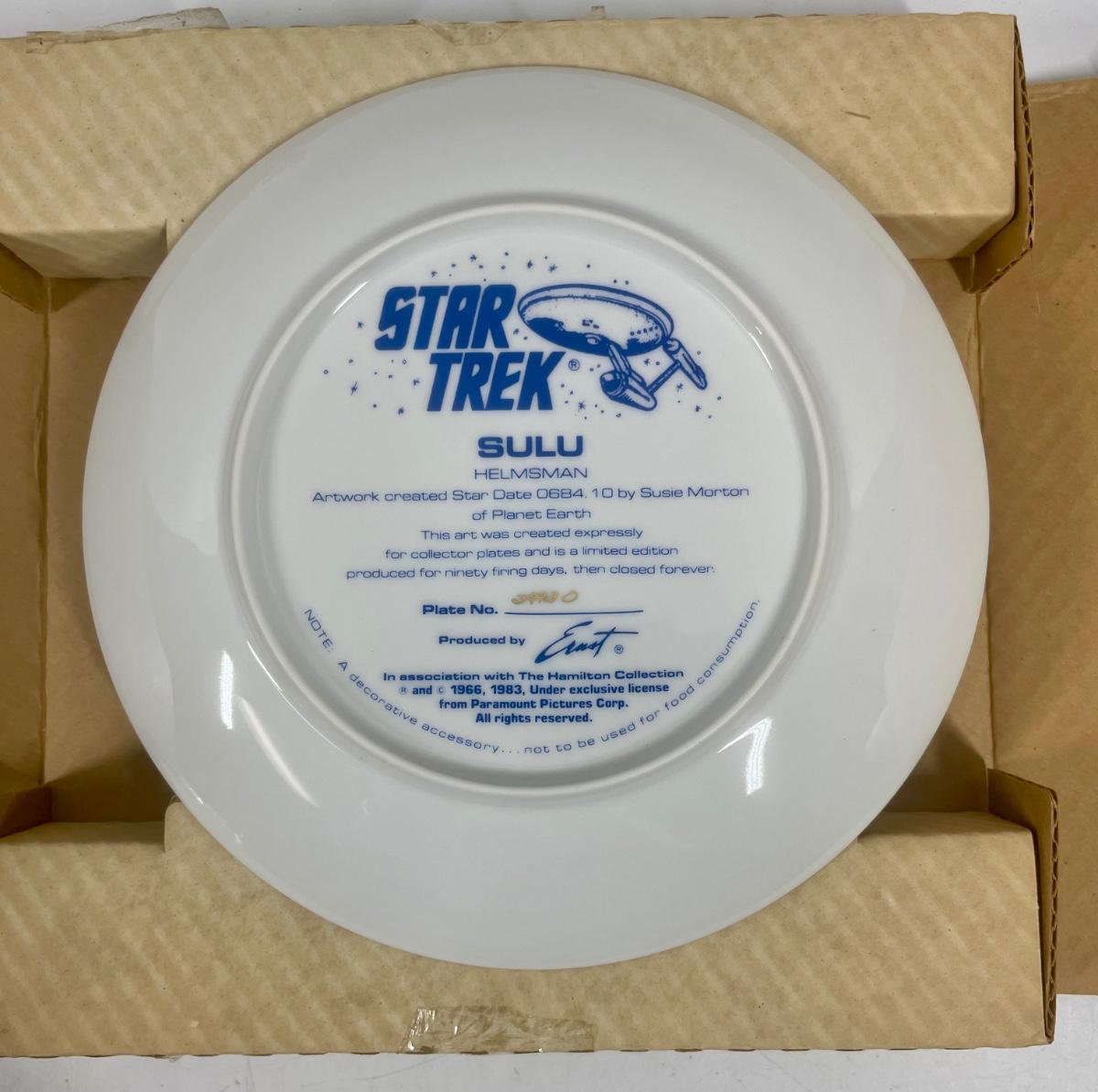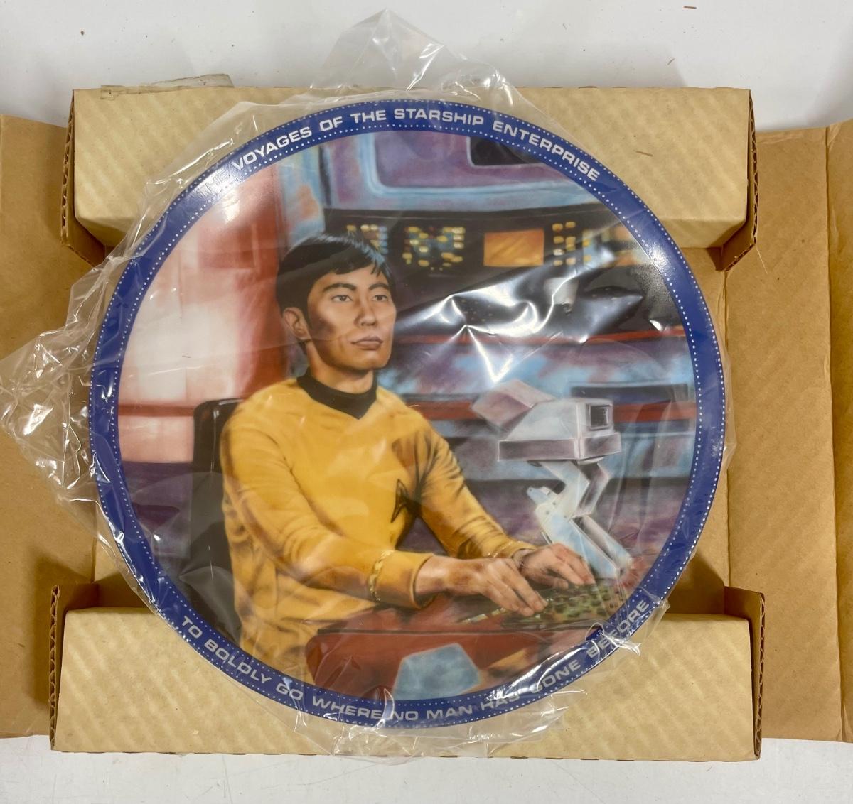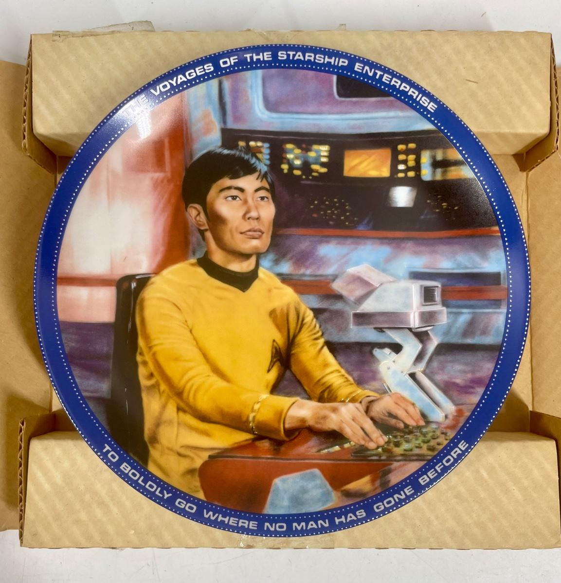 8 1/2” Star Trek Collector plate from 1984. Image of Lt. Sulu at his station on the Bridge. With certificate of authenticity, In original shipping box. Part of a set of 9, see other auctions for more.
