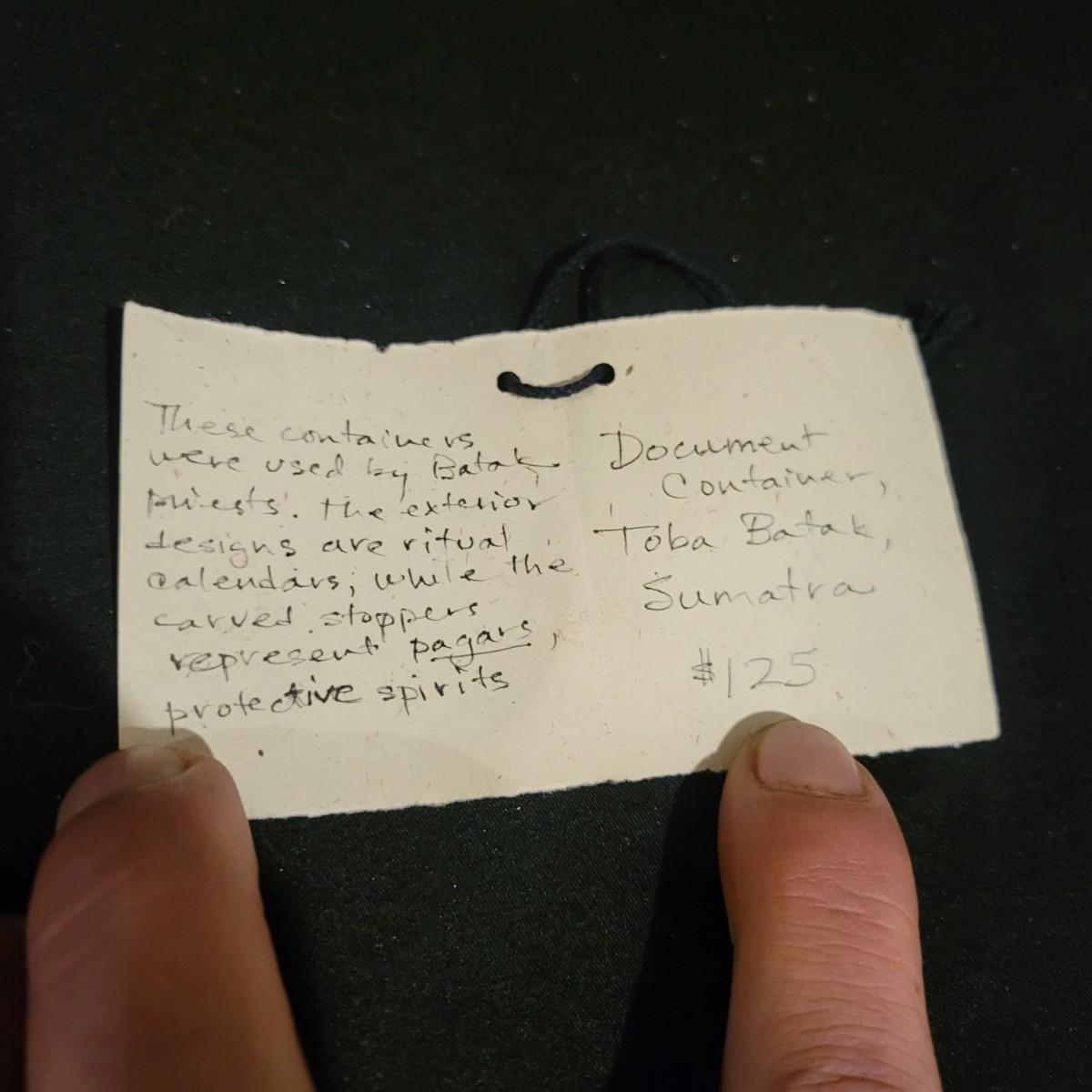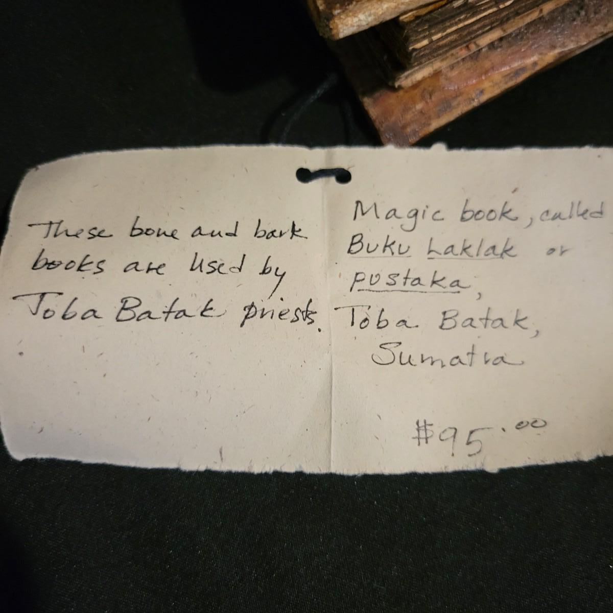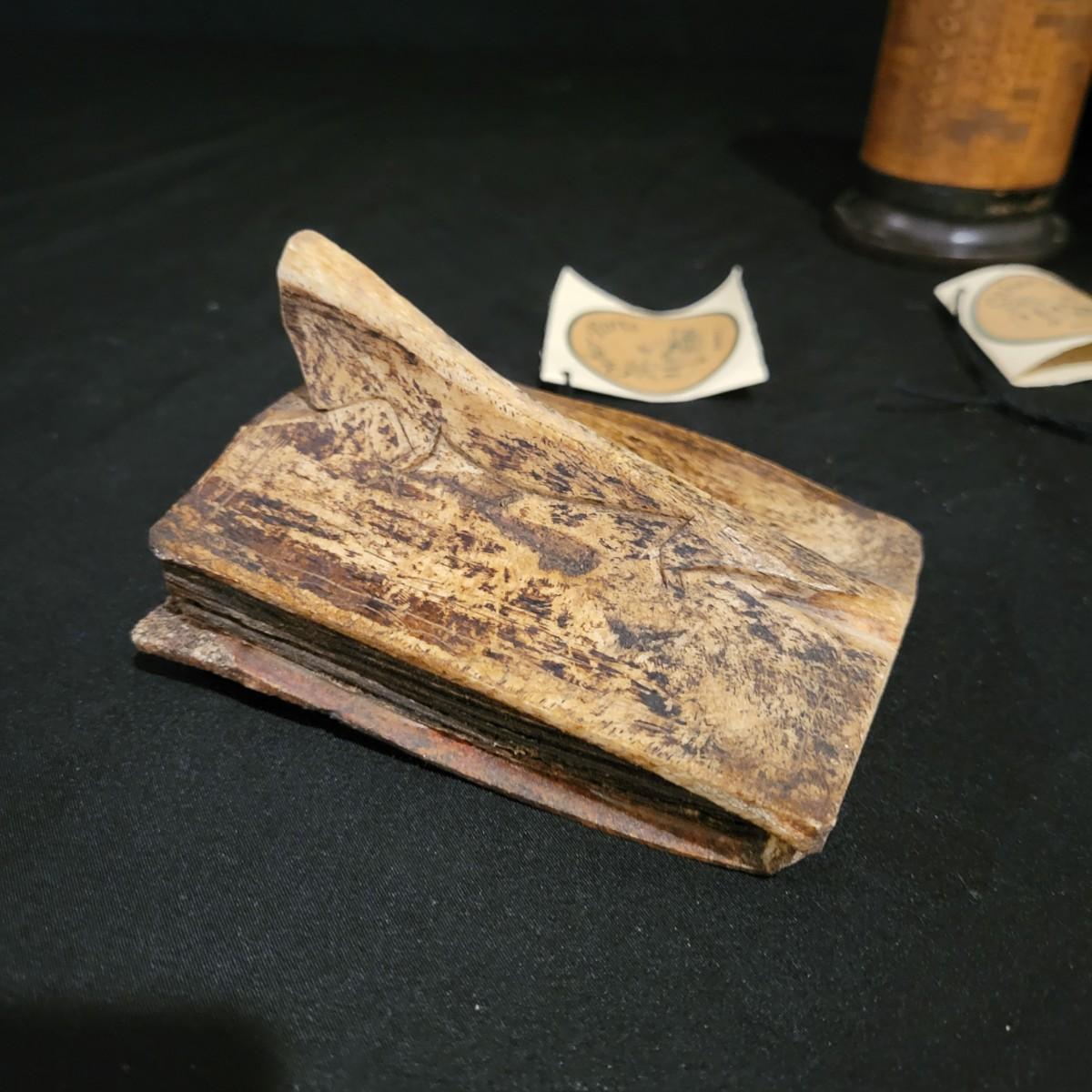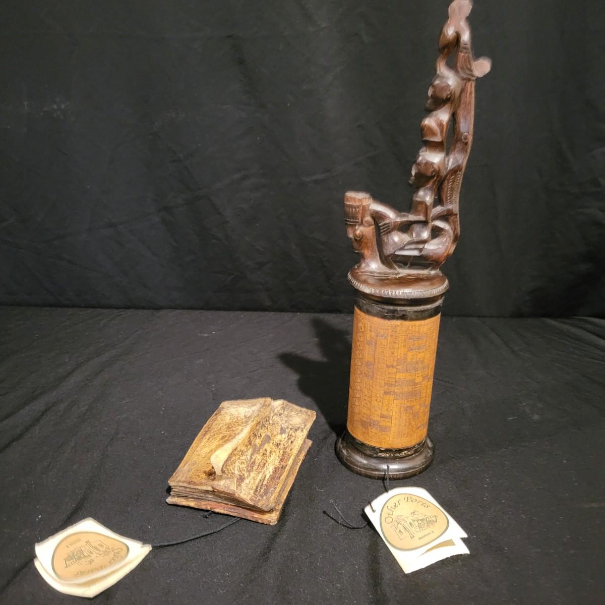 Sumatra bark book has a bone-like material as its cover with bark sheets. The top bone-like piece has detached from the book. Also includes a document container made of wood with intricate engravings and a carved sticker. It measures approximately 3"D x 14.5"H. Local pickup only.