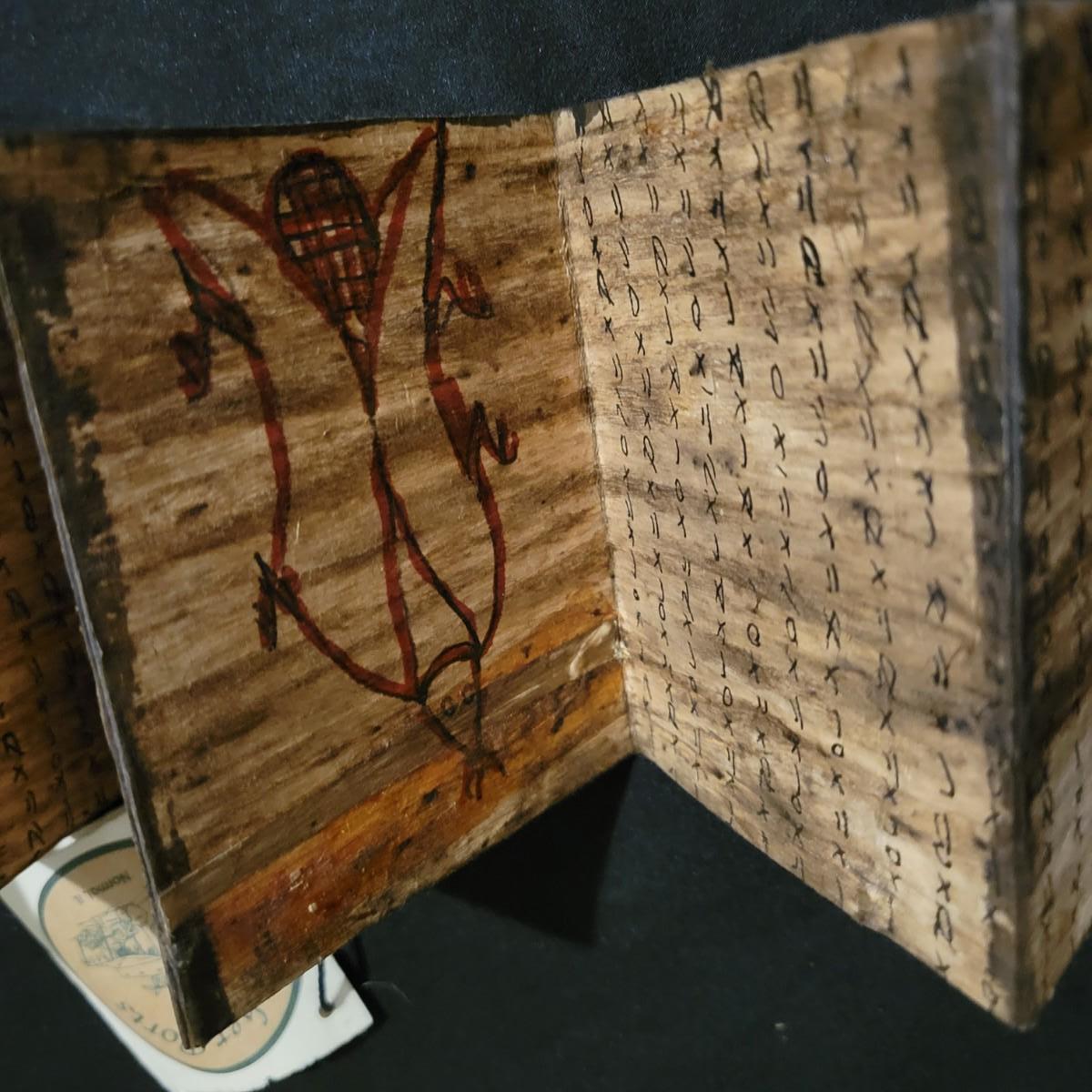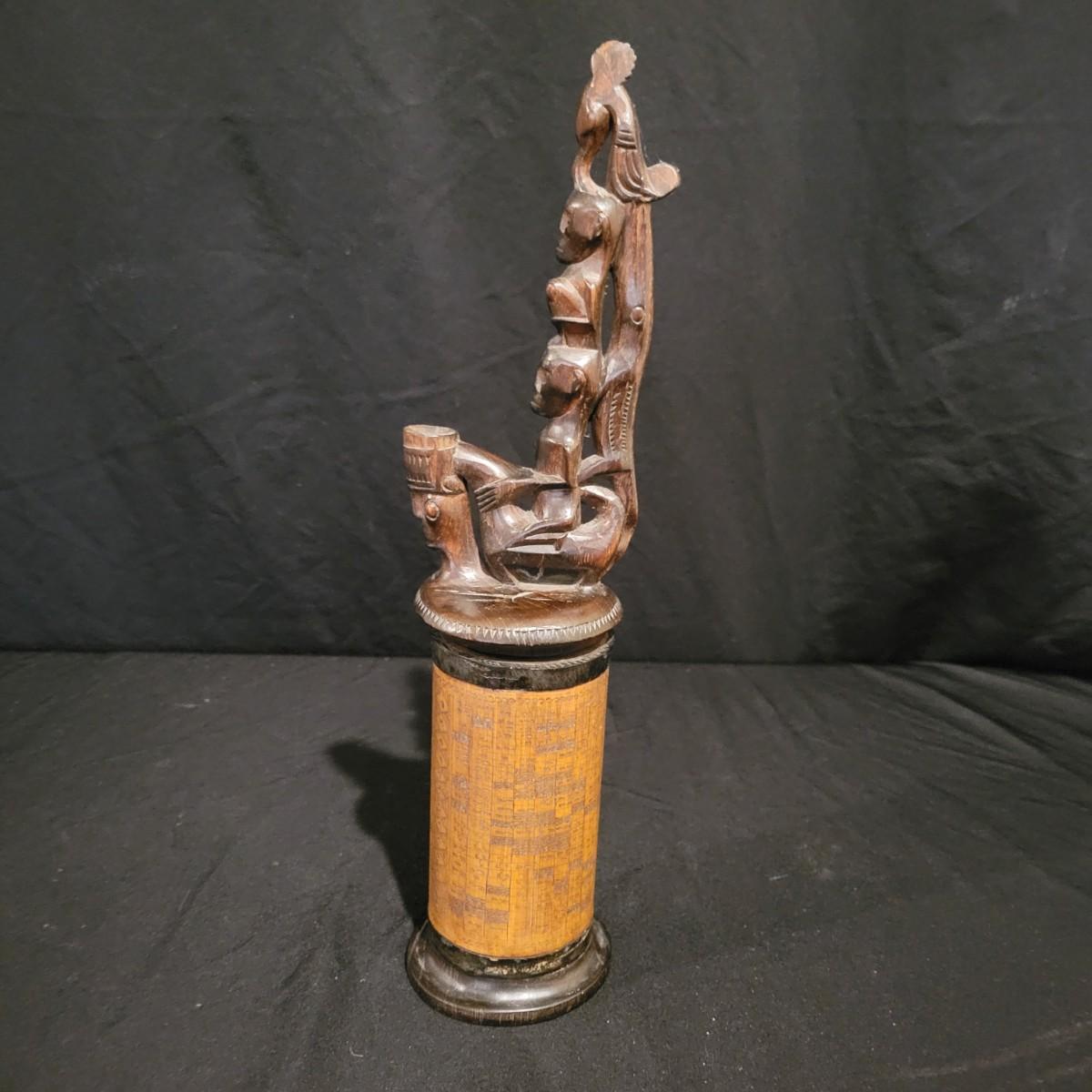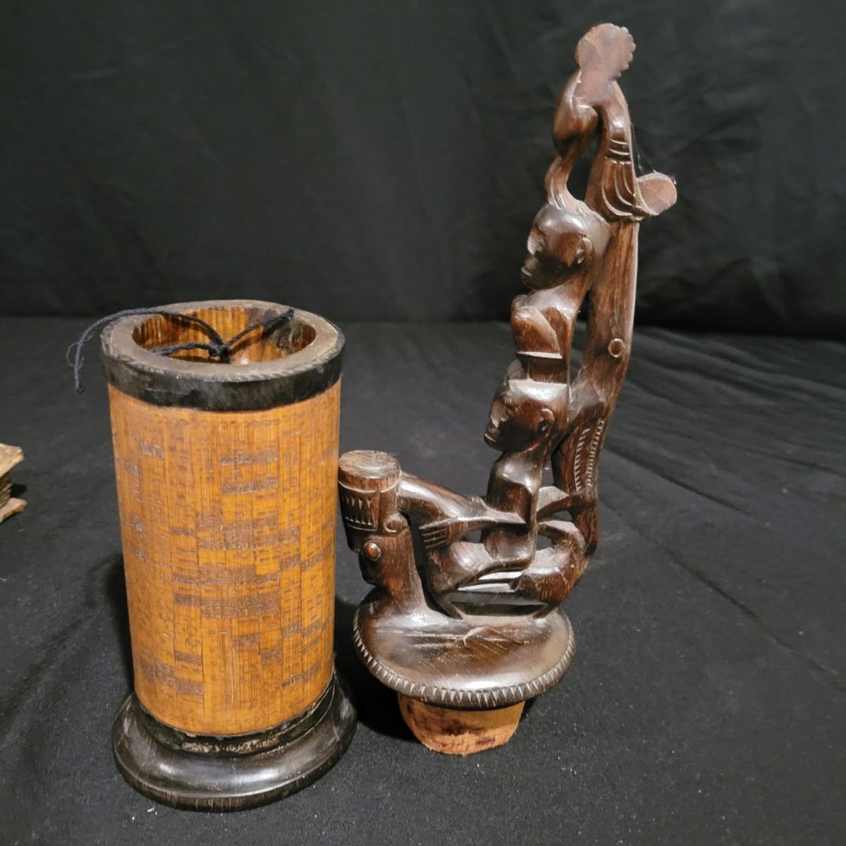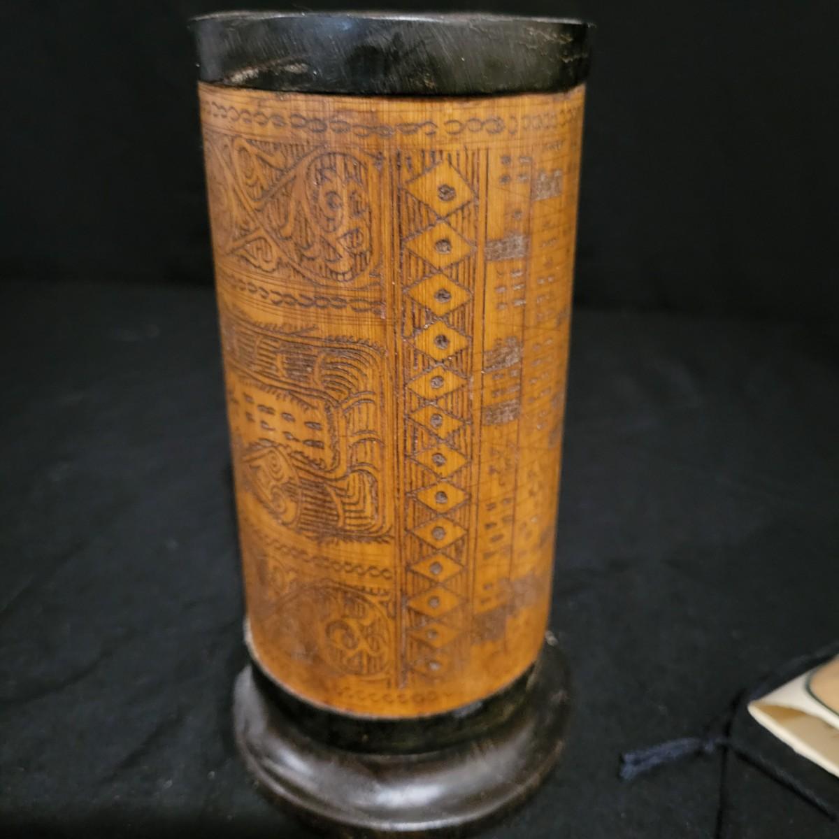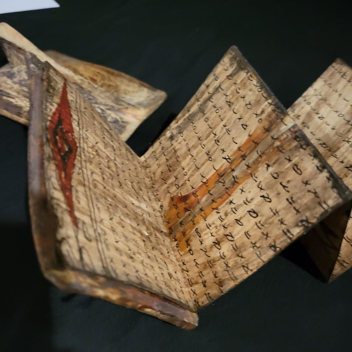 Sumatra bark book has a bone-like material as its cover with bark sheets. The top bone-like piece has detached from the book. Also includes a document container made of wood with intricate engravings and a carved sticker. It measures approximately 3"D x 14.5"H. Local pickup only.