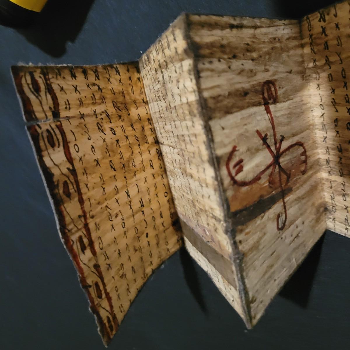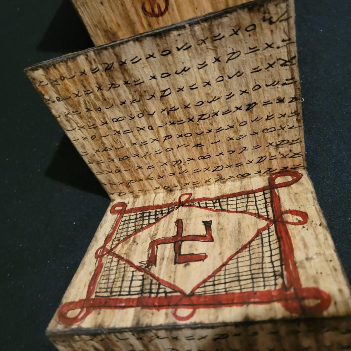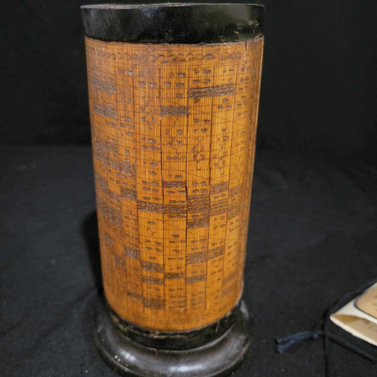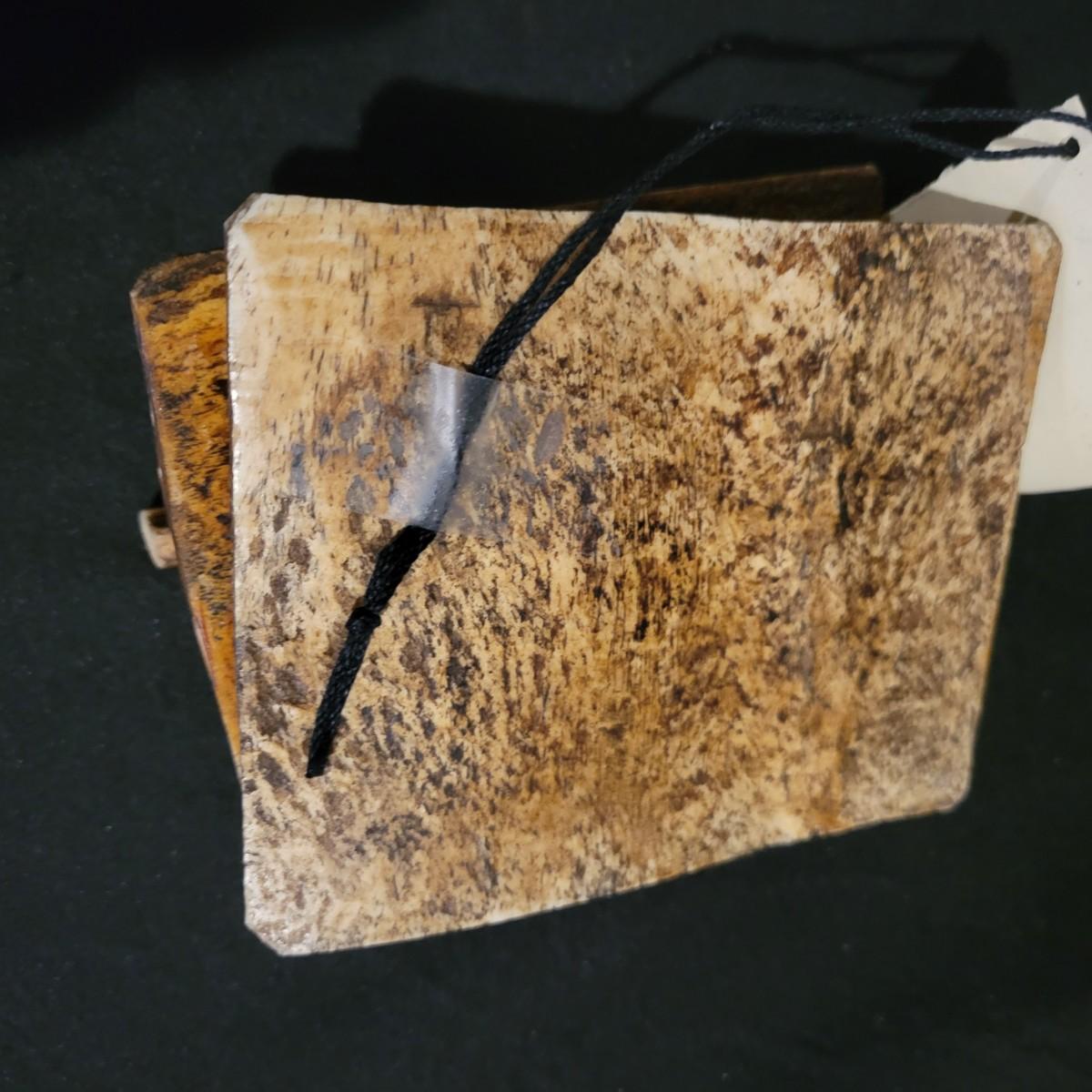 Sumatra bark book has a bone-like material as its cover with bark sheets. The top bone-like piece has detached from the book. Also includes a document container made of wood with intricate engravings and a carved sticker. It measures approximately 3"D x 14.5"H. Local pickup only.