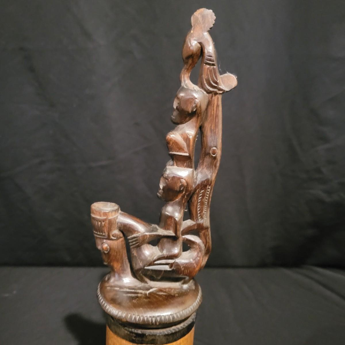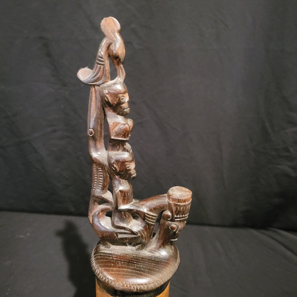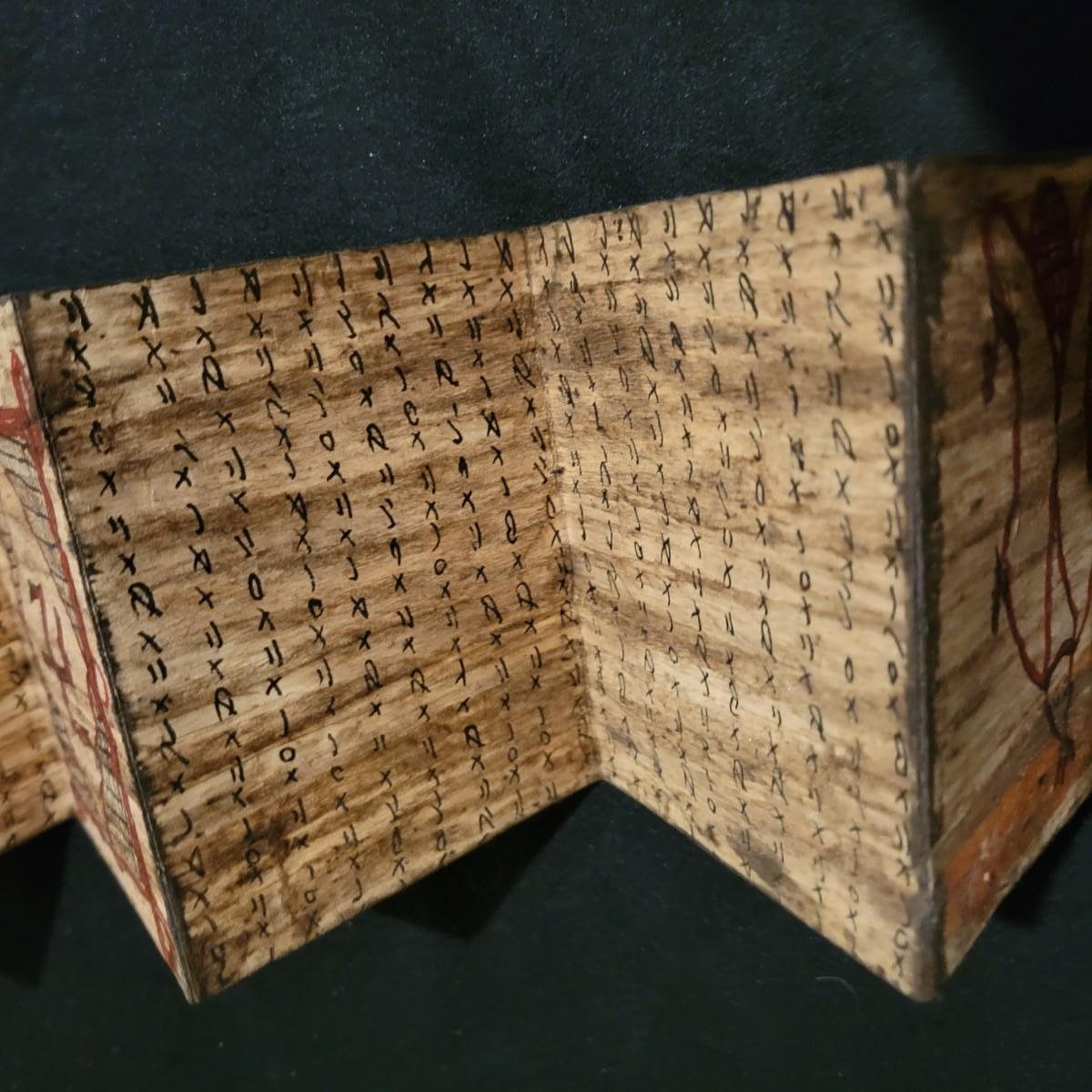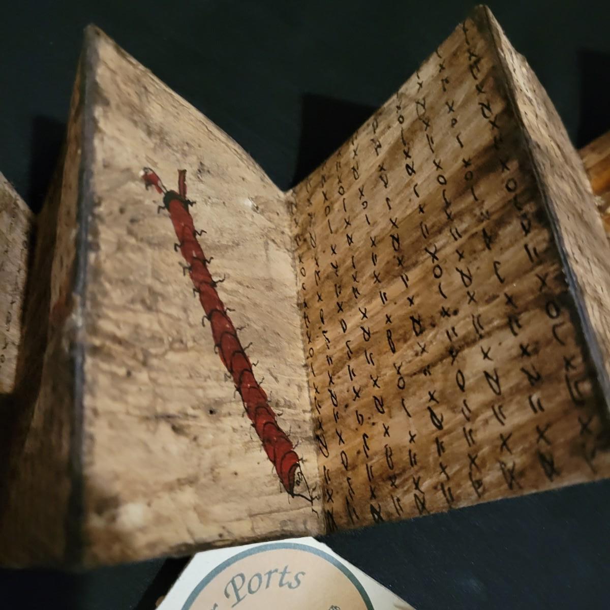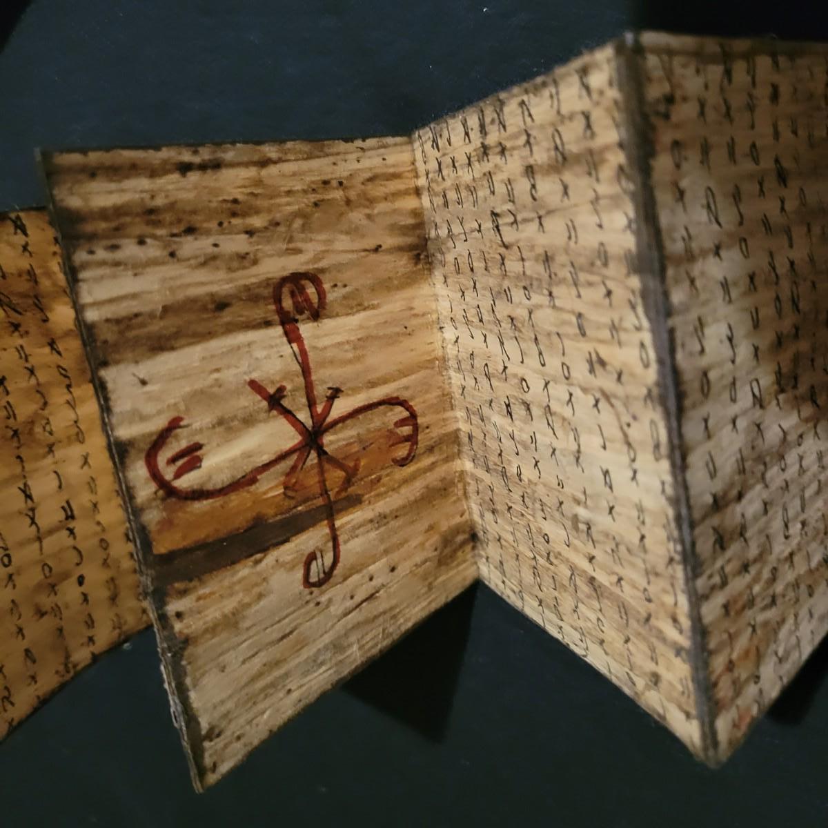 Sumatra bark book has a bone-like material as its cover with bark sheets. The top bone-like piece has detached from the book. Also includes a document container made of wood with intricate engravings and a carved sticker. It measures approximately 3"D x 14.5"H. Local pickup only.