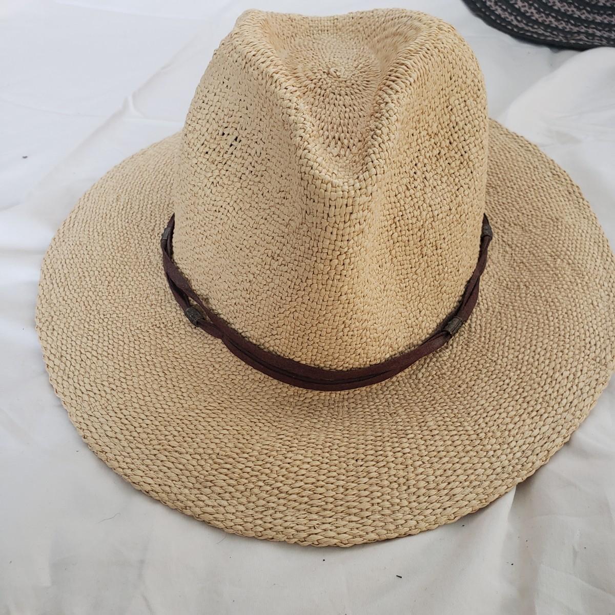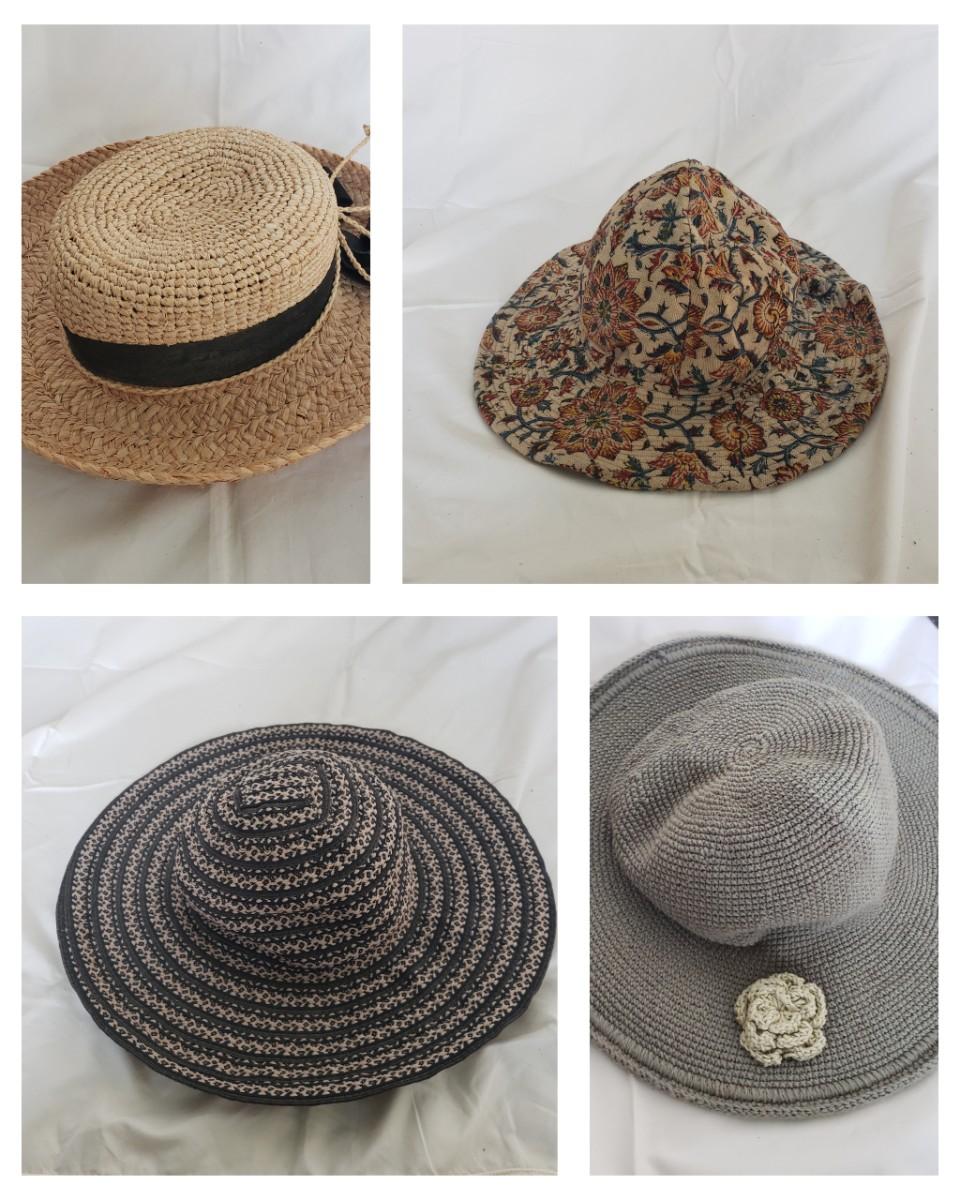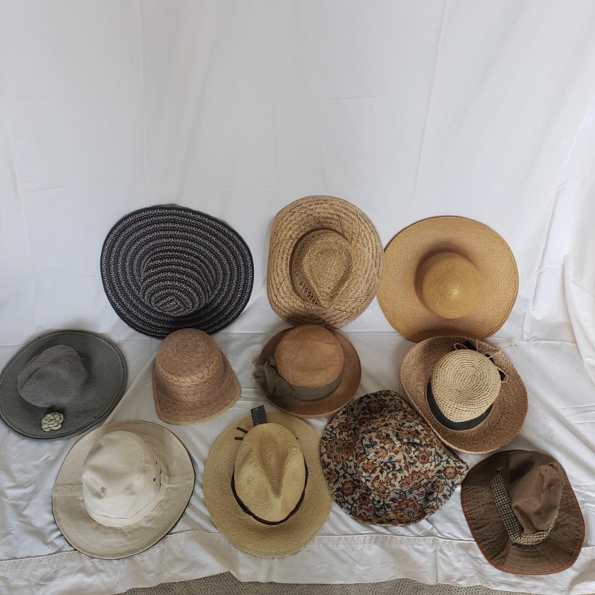 Summer is around the corner! You'll find one at least out this 11 piece lot! The hat's materials range from straw to cotton, even paper! Some hats are one size fits all. The boho flowered cotton hat insides measure 7" x 7". Some hats have a foam strip placed inside the brim. The foams is disintegrating, see pictures.