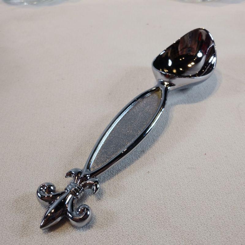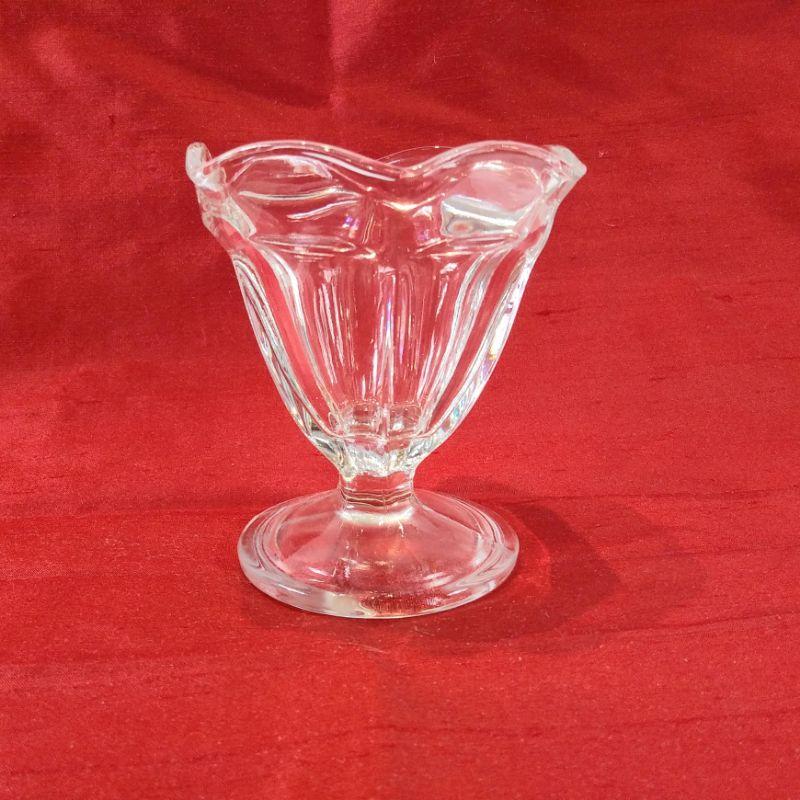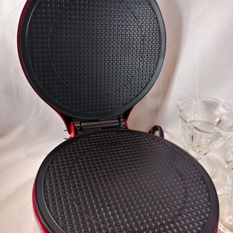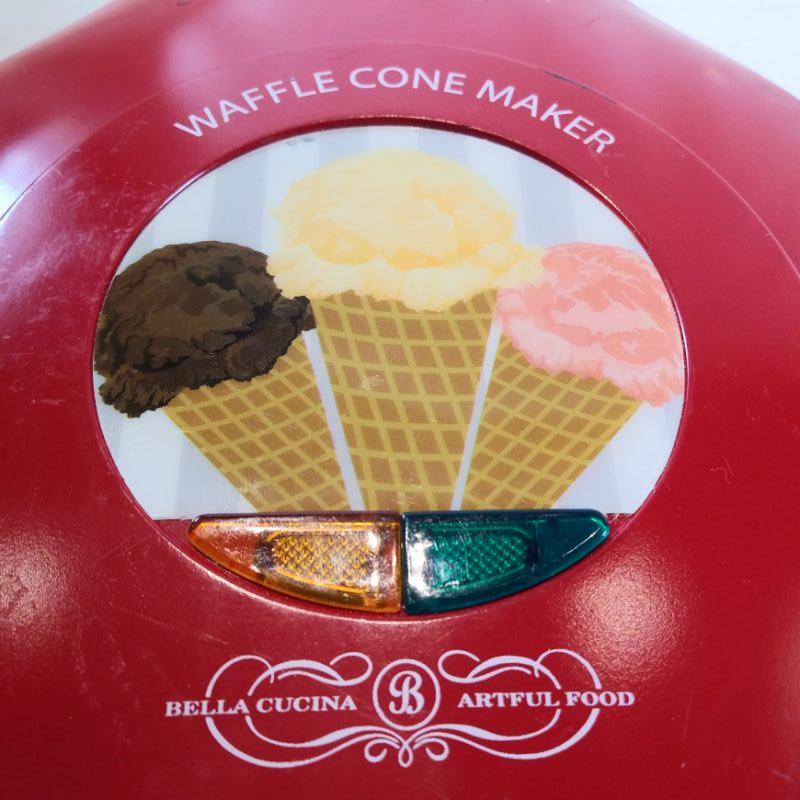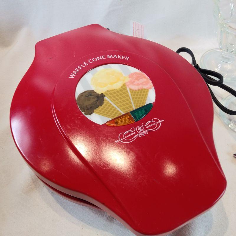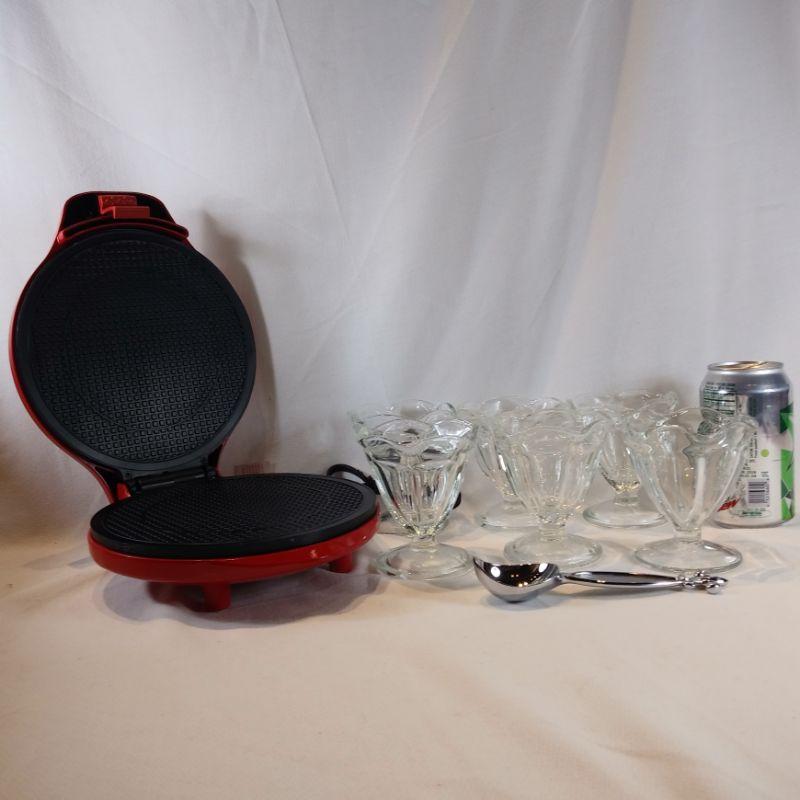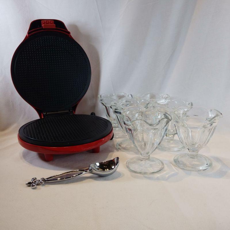 And the living is easy. Especially with this fun grouping of an electric Waffle Cone Maker, 6 glass ice cream Sundae cups and a Fleur de Lis ice cream scoop. The waffle maker is an unused store display - it was manufactured by Bellacucina Artful Food. It has a few surface scratches on top consistent with being a store display. The unit powers on and gets hot. It is 8-1/2-inches wide X 10-3/4-inches long. The six clear glass ice cream cups are 4-inches tall X 3-1/2-inches in diameter. No chips or cracks. The new ice cream scoop is 6-1/2-inches long. All items are in very good shape and ready to use. Time for an ice cream party!