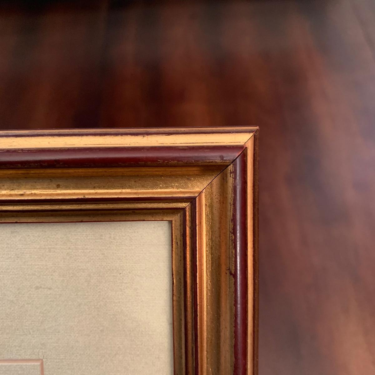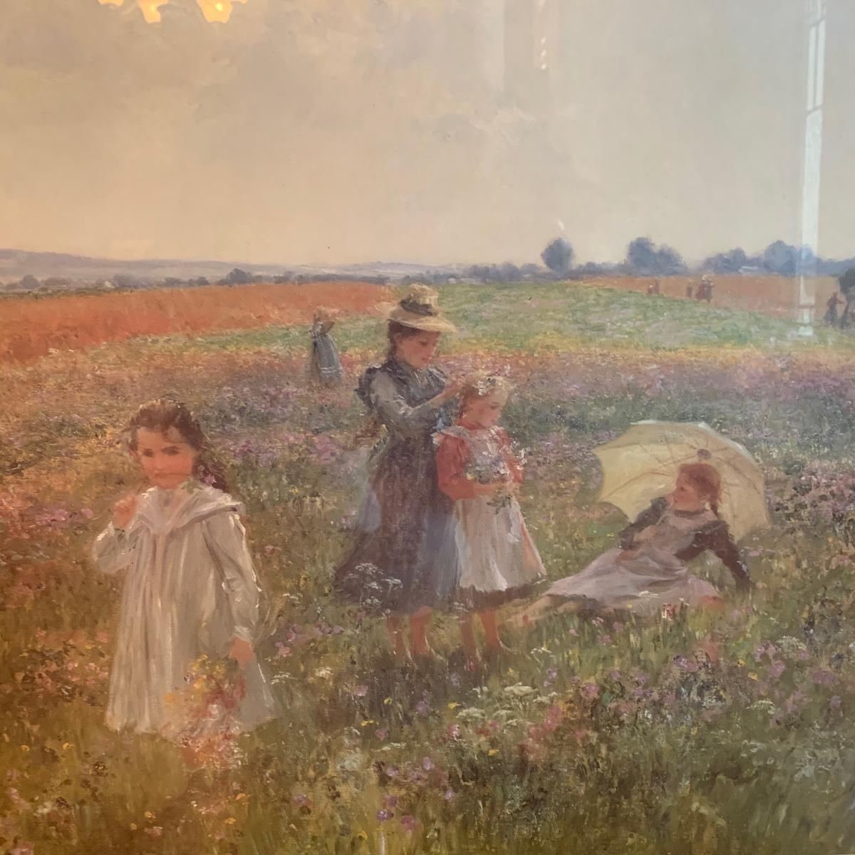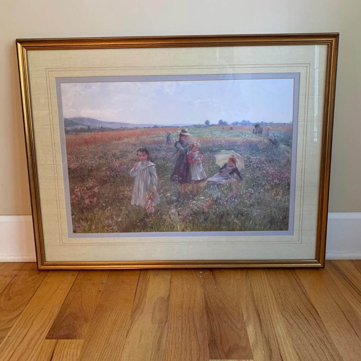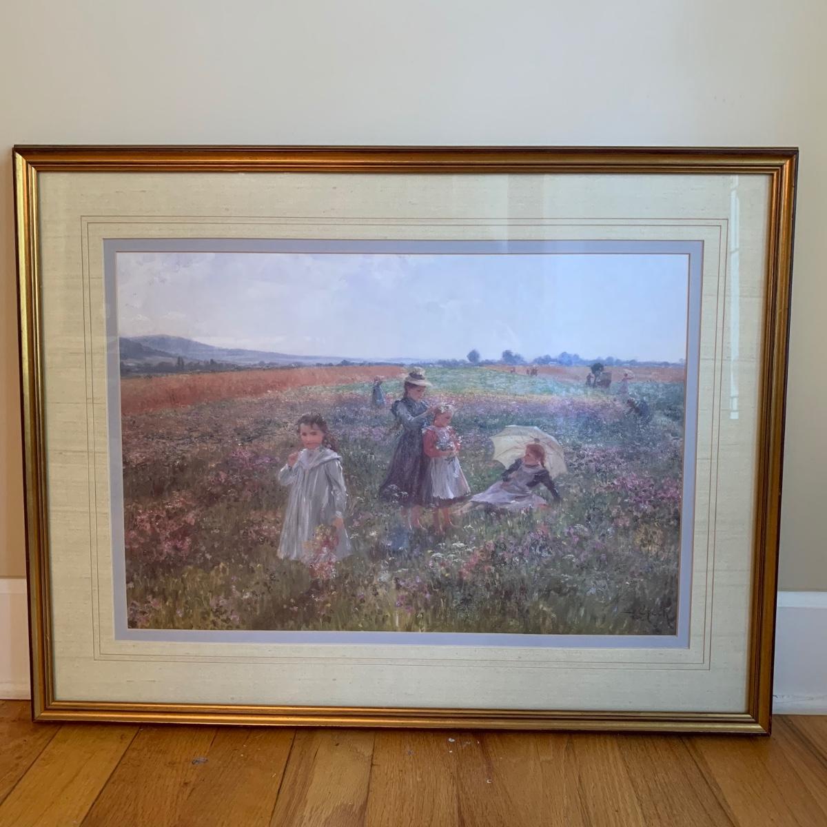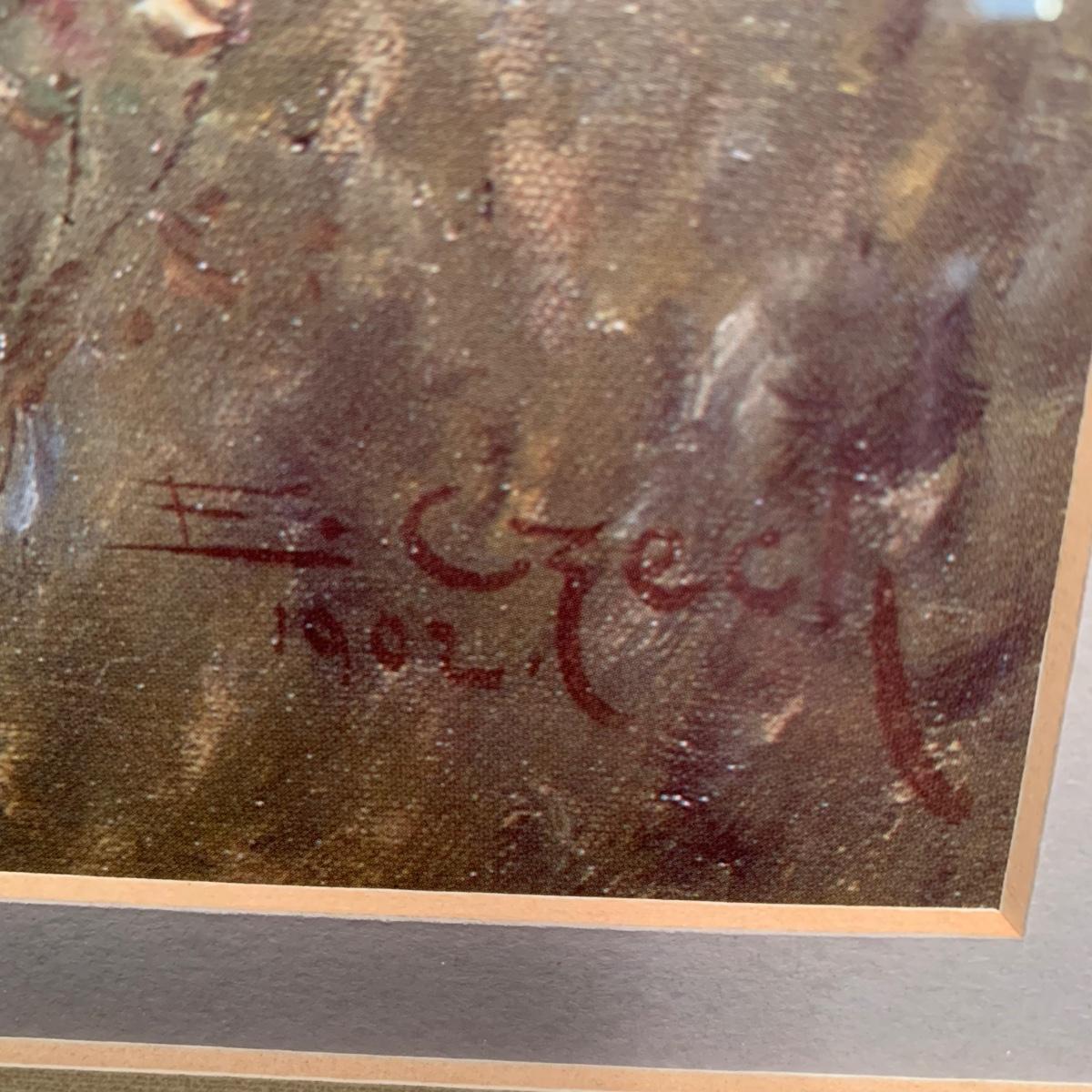 Matted and framed oil on canvas print of Summer’s Day by Emil Czech. Print is behind glass and frame is gold painted plastic. Signature reads, “E. Czech 1902”. Frame measures, 30.5”L x 23.5”W. This lovely piece appears to be in good condition and is sure to light up any space it’s introduced to.