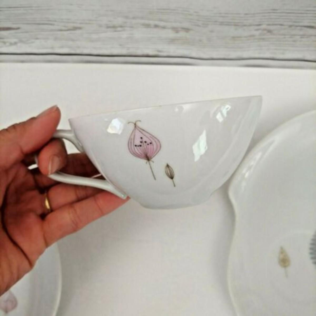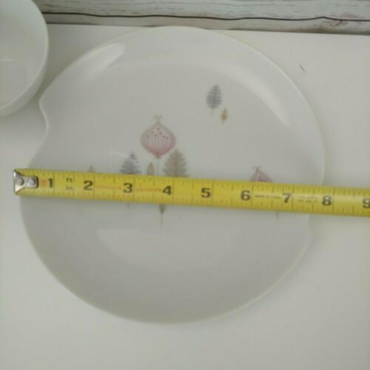 Absolutely gorgeous and adorable MCM Japanese China Snack Plate Tea Plate along with Tea Cup. Plate has spot to fit tea cup perfectly into. Floral and tree design (pink blue and green).
