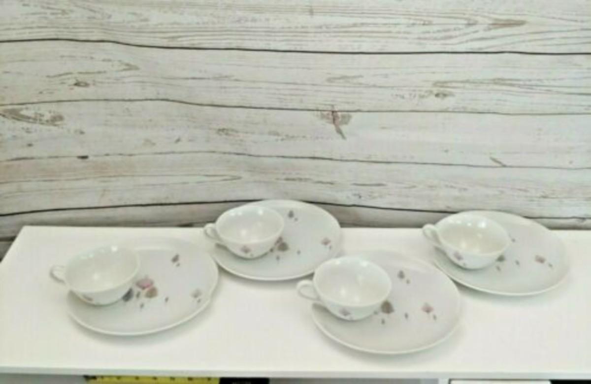 Listing is for a set of 4 Snack Plates and 4 tea cups. In great vintage condition, except 1 tea cup has a chip on the edge (check photo).