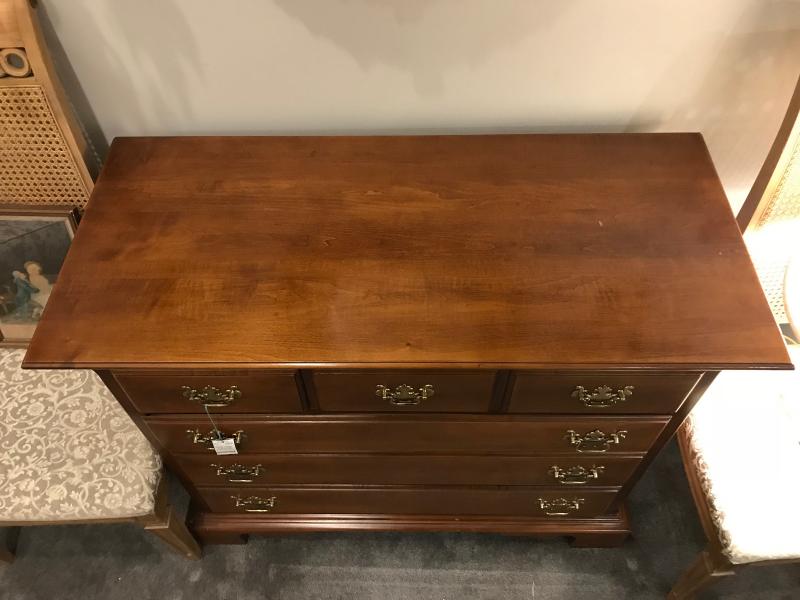 Beautiful solid cherry bachelor's chest by Sumter Cabinet Company. Nicely moulded trim, bracket feet, and lovely brasses. Three small dovetailed drawers over three large dovetailed drawers. 19" x 42" x 35 1/2" H.