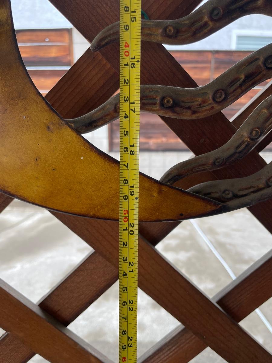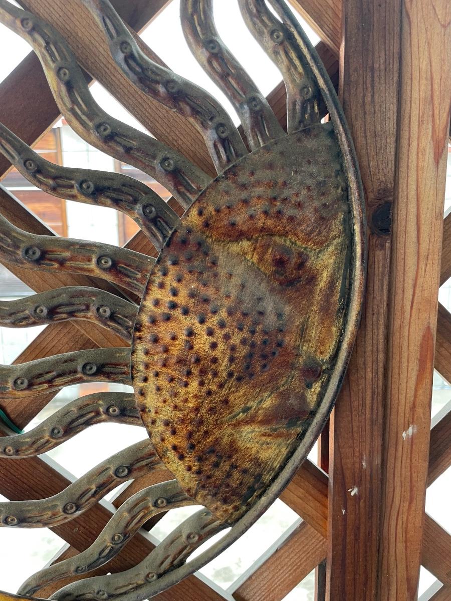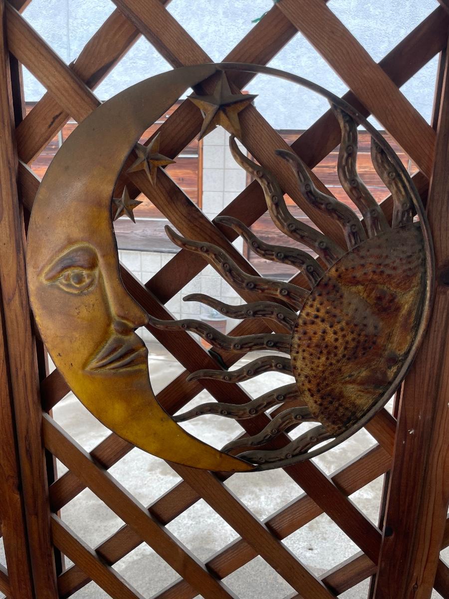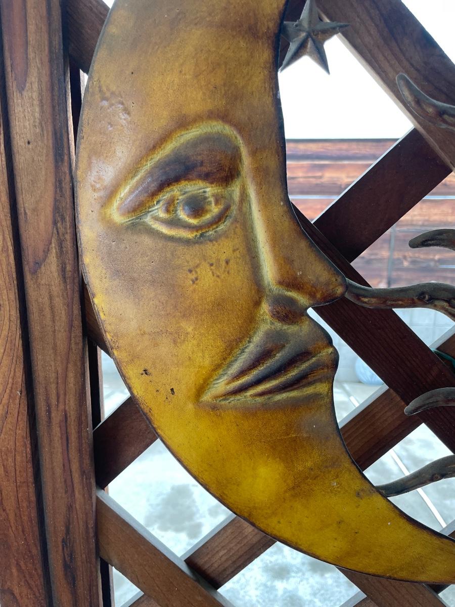 Metal round wall art wit a crescent man in the moon image on one side and the son on the other side.