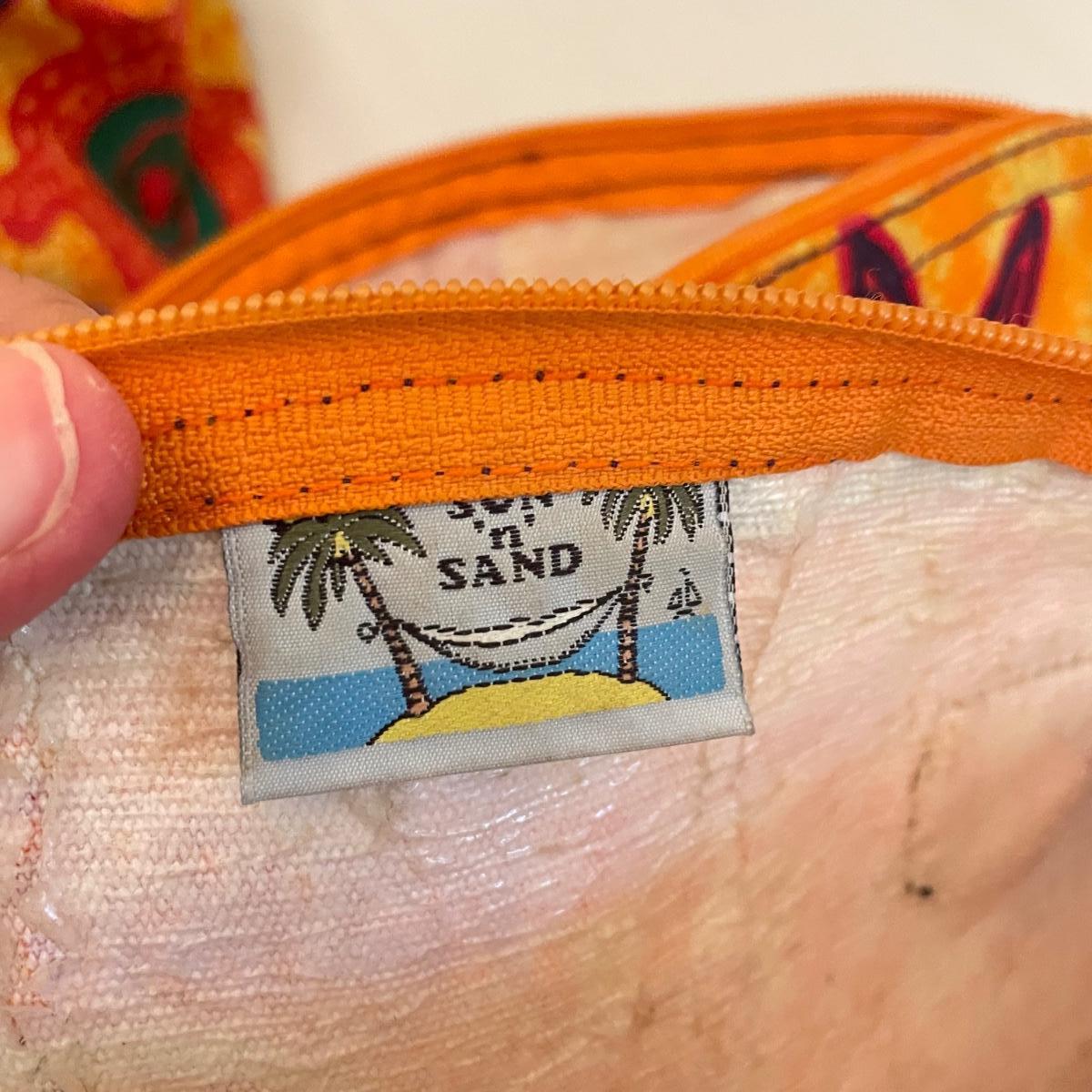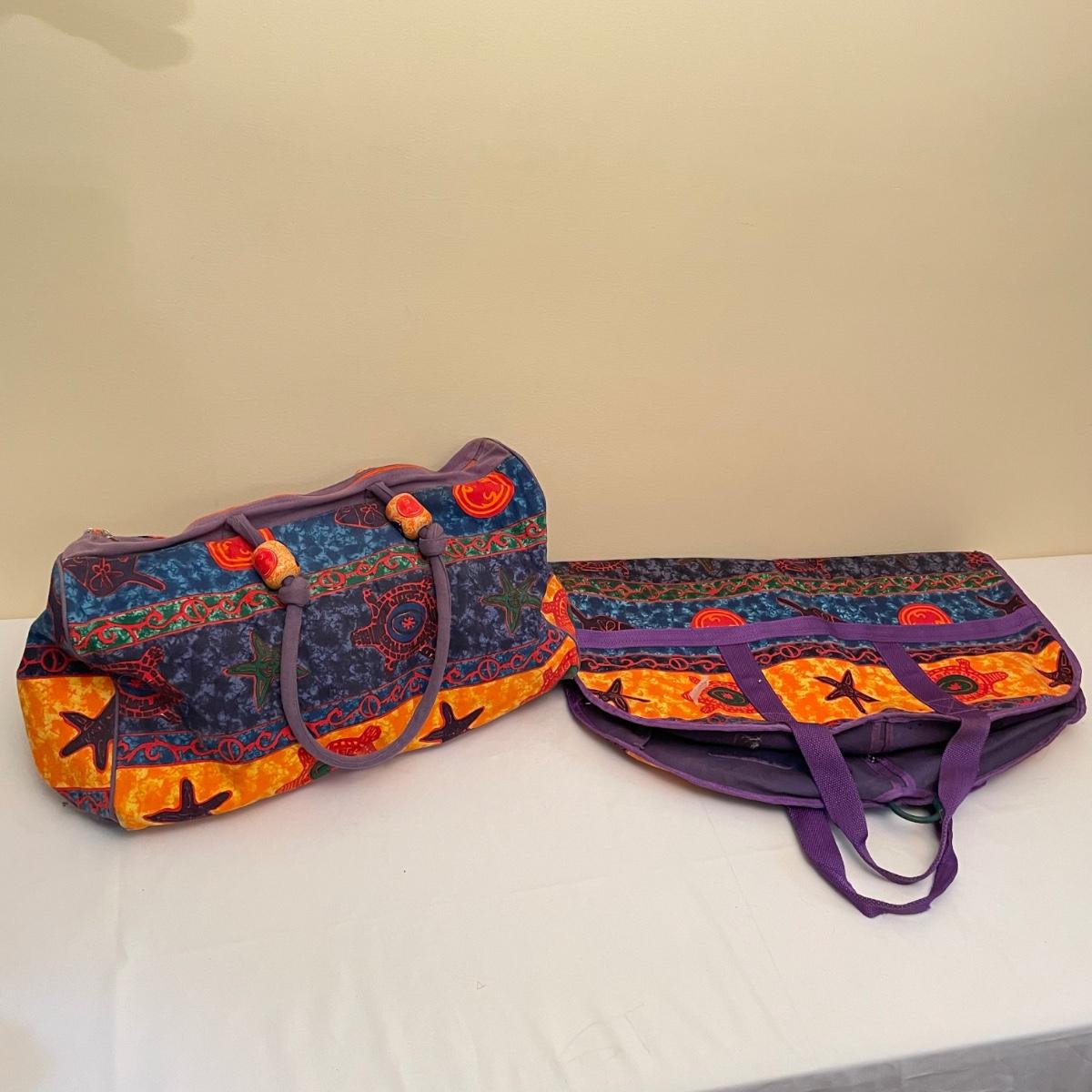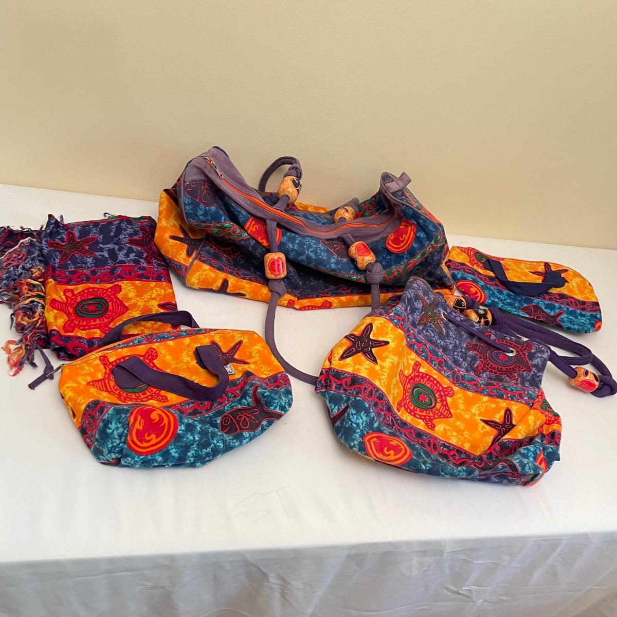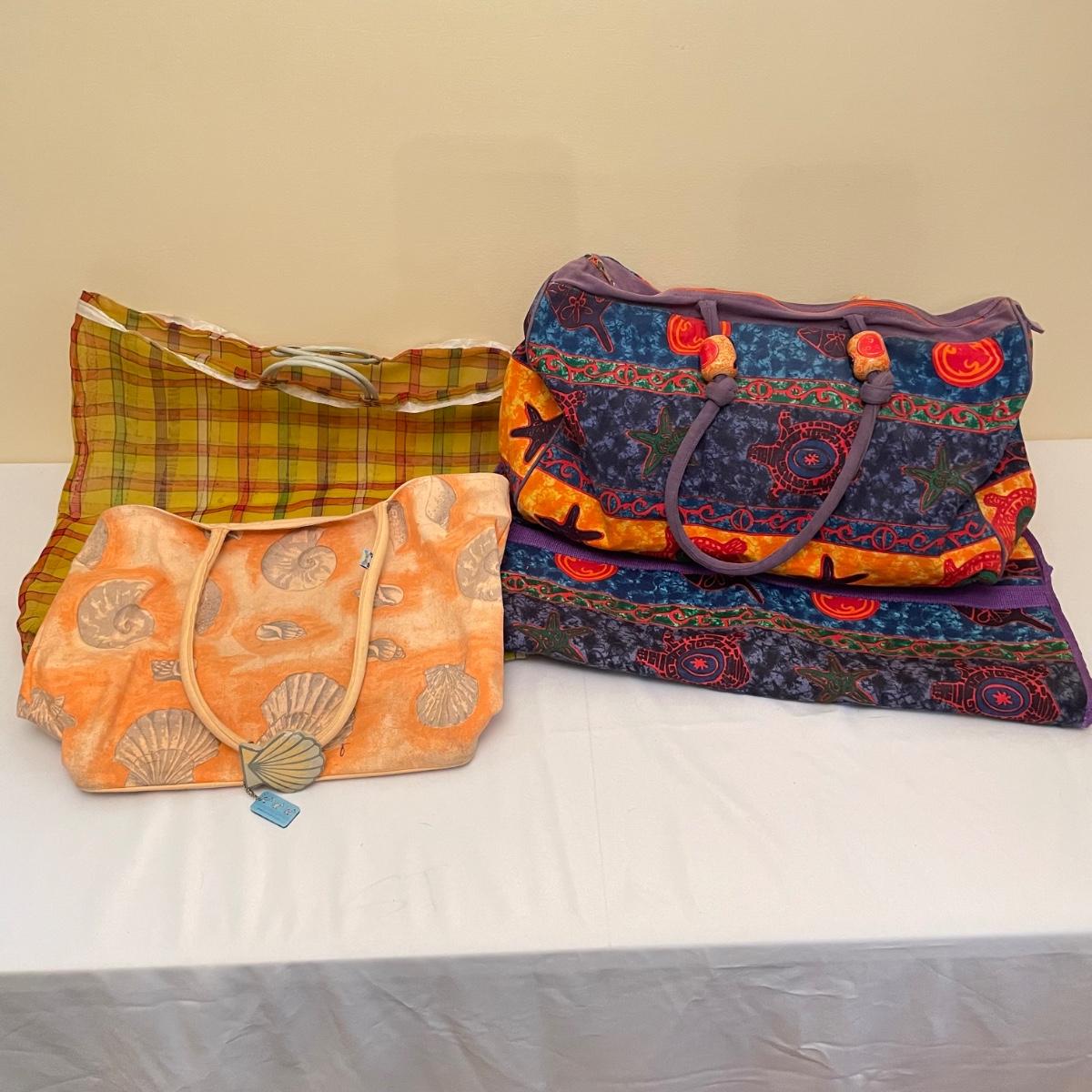 A six-piece set by Sun and Sand includes a sarong, large and small totes and bags plus a small garment bag. Lot also includes a large mesh tote that feels like plastic and another shell bag by Sun and Sand. Items show some fading and a couple need a good cleaning. See images. The yellow mesh tote measures 24” x 23” while lying flat, the garment bag laid out measures 27” x 36”. Local pick up only.