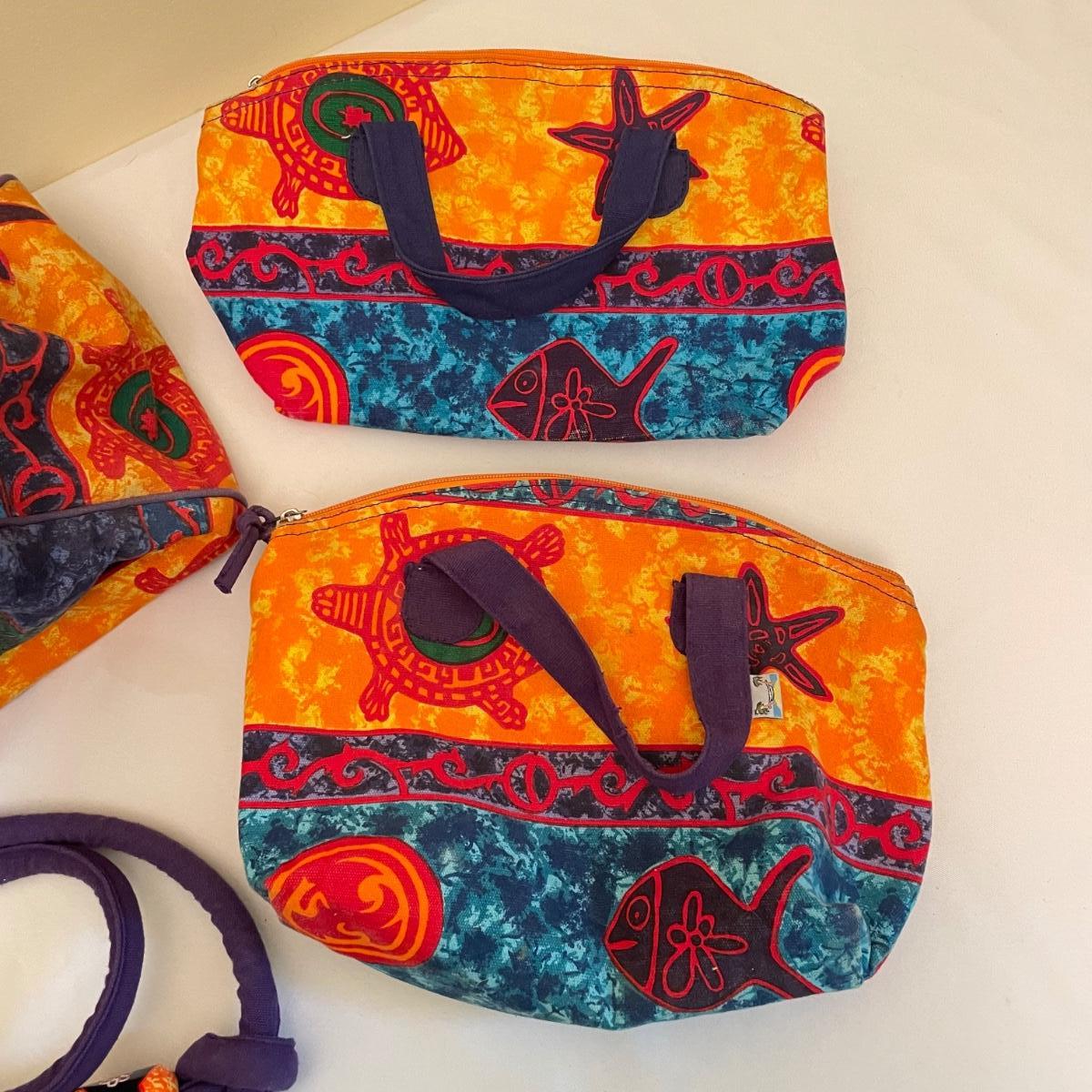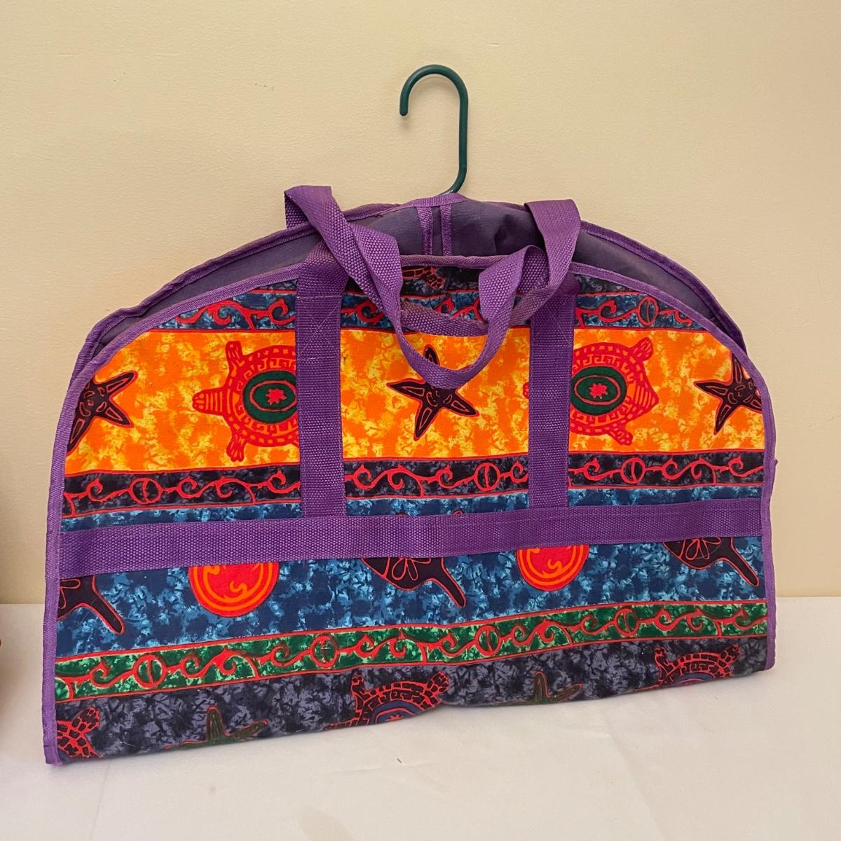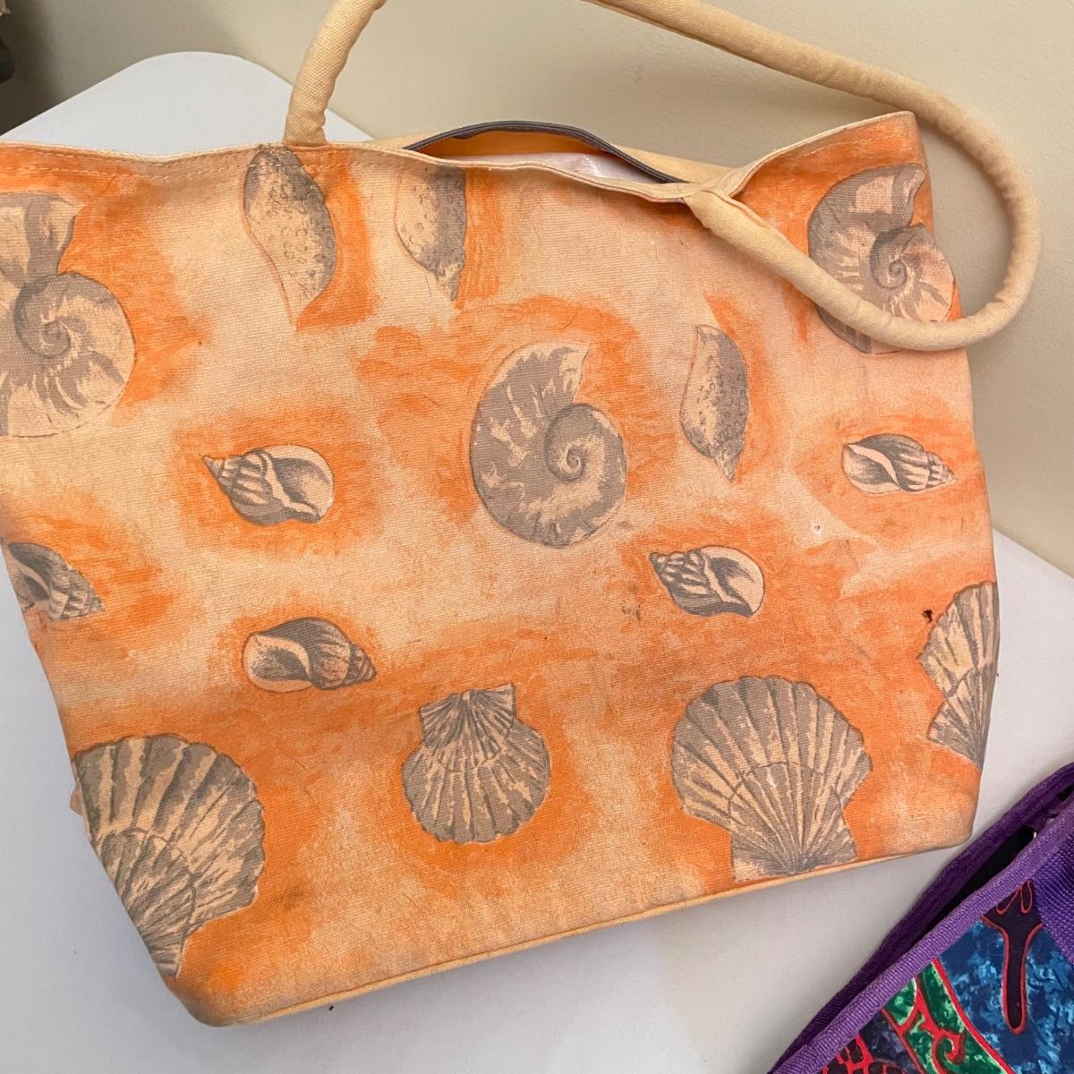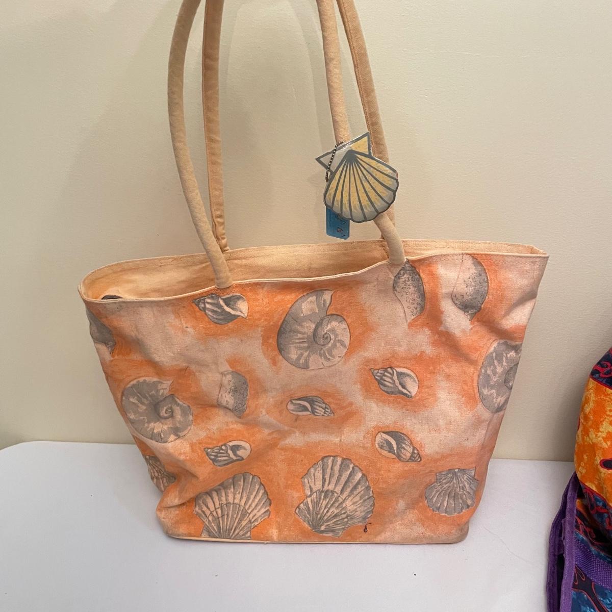 A six-piece set by Sun and Sand includes a sarong, large and small totes and bags plus a small garment bag. Lot also includes a large mesh tote that feels like plastic and another shell bag by Sun and Sand. Items show some fading and a couple need a good cleaning. See images. The yellow mesh tote measures 24” x 23” while lying flat, the garment bag laid out measures 27” x 36”. Local pick up only.