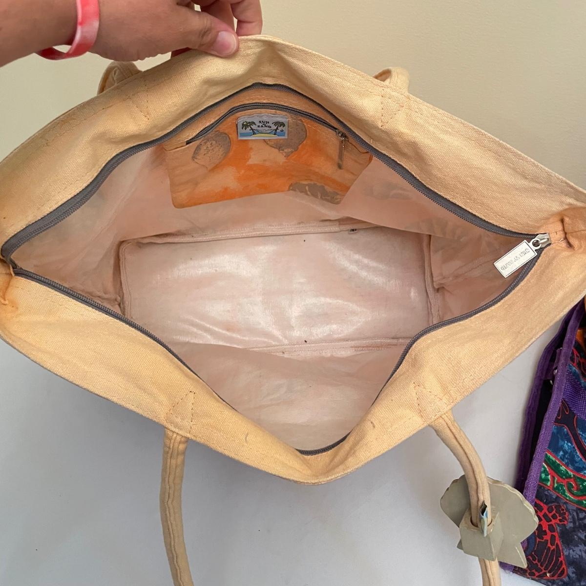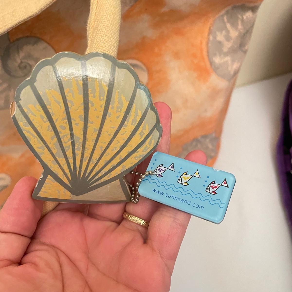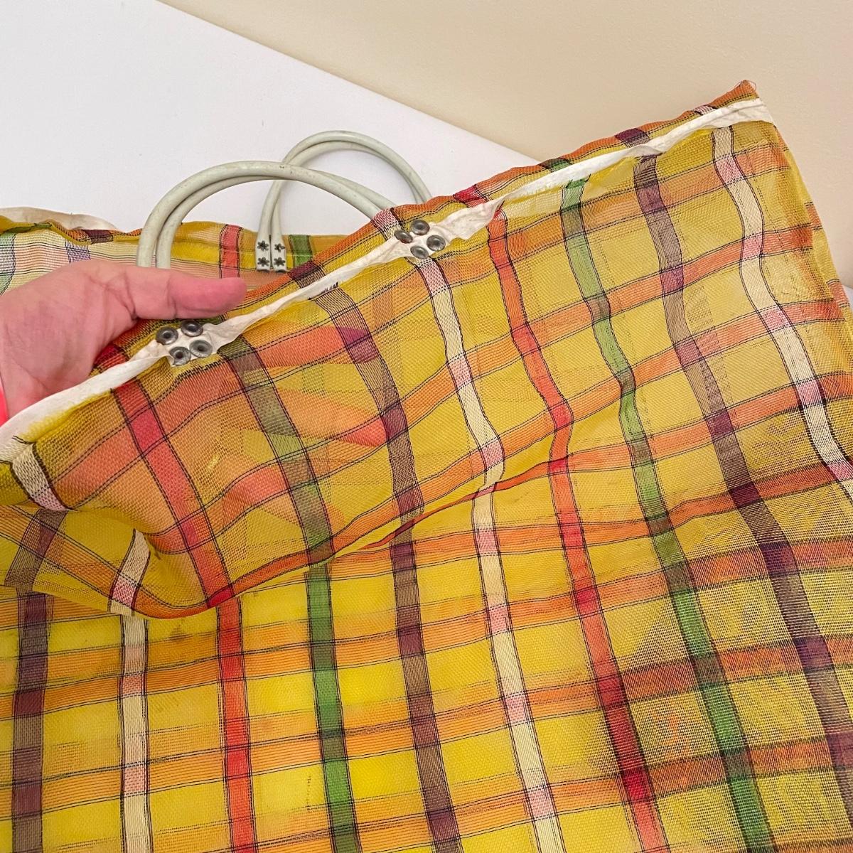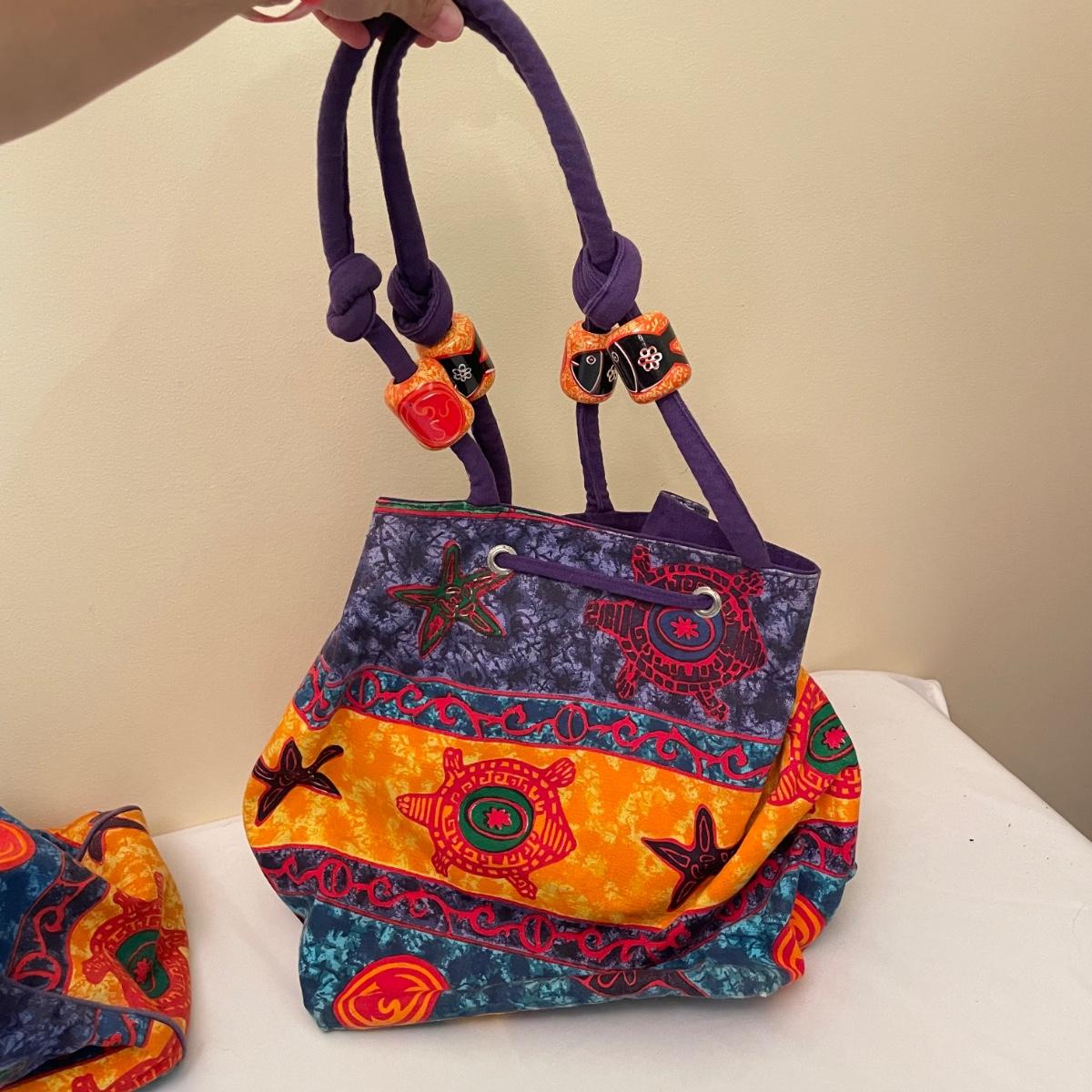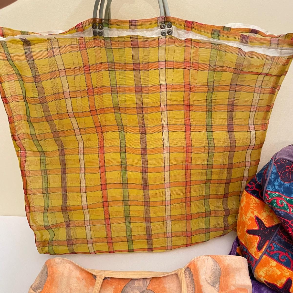 A six-piece set by Sun and Sand includes a sarong, large and small totes and bags plus a small garment bag. Lot also includes a large mesh tote that feels like plastic and another shell bag by Sun and Sand. Items show some fading and a couple need a good cleaning. See images. The yellow mesh tote measures 24” x 23” while lying flat, the garment bag laid out measures 27” x 36”. Local pick up only.