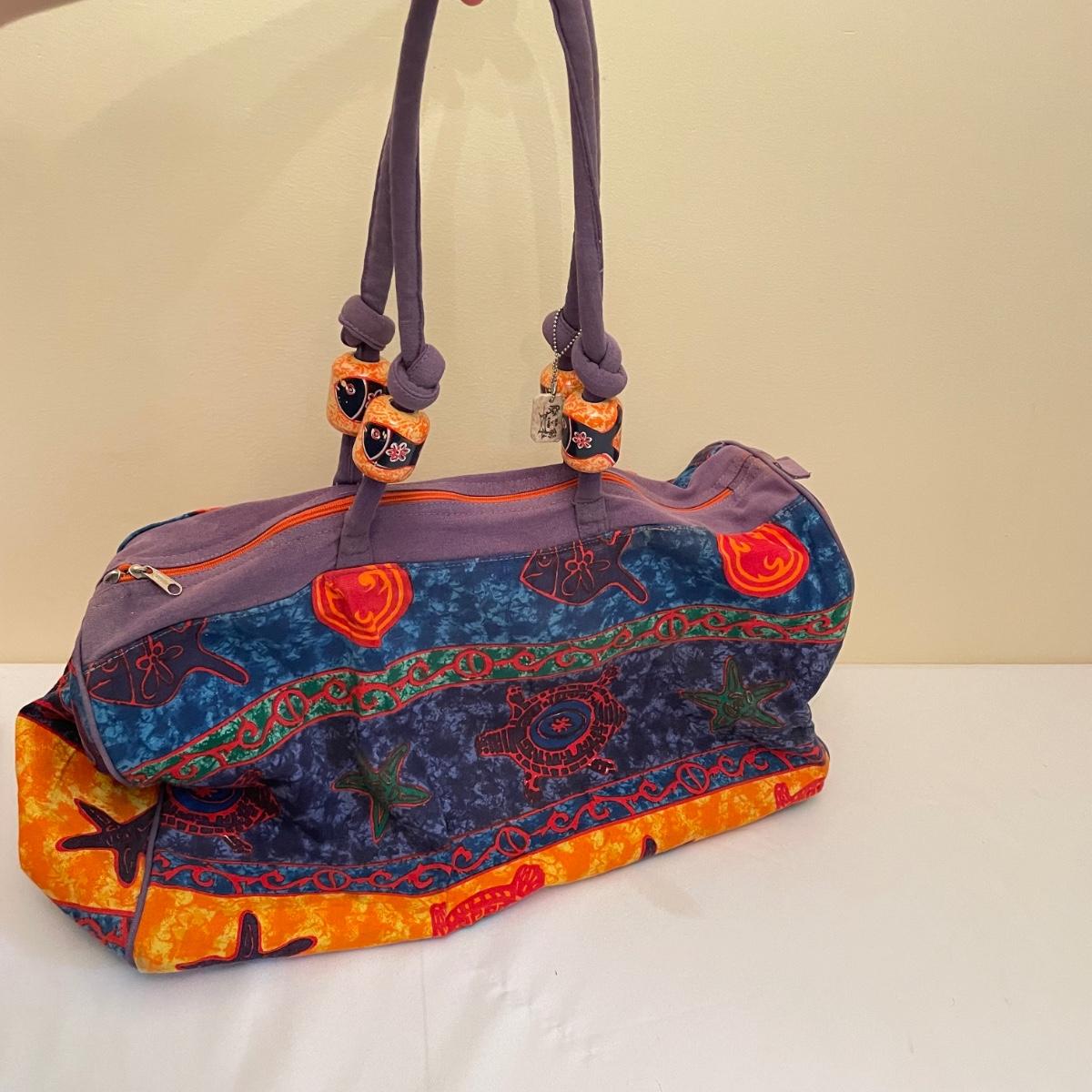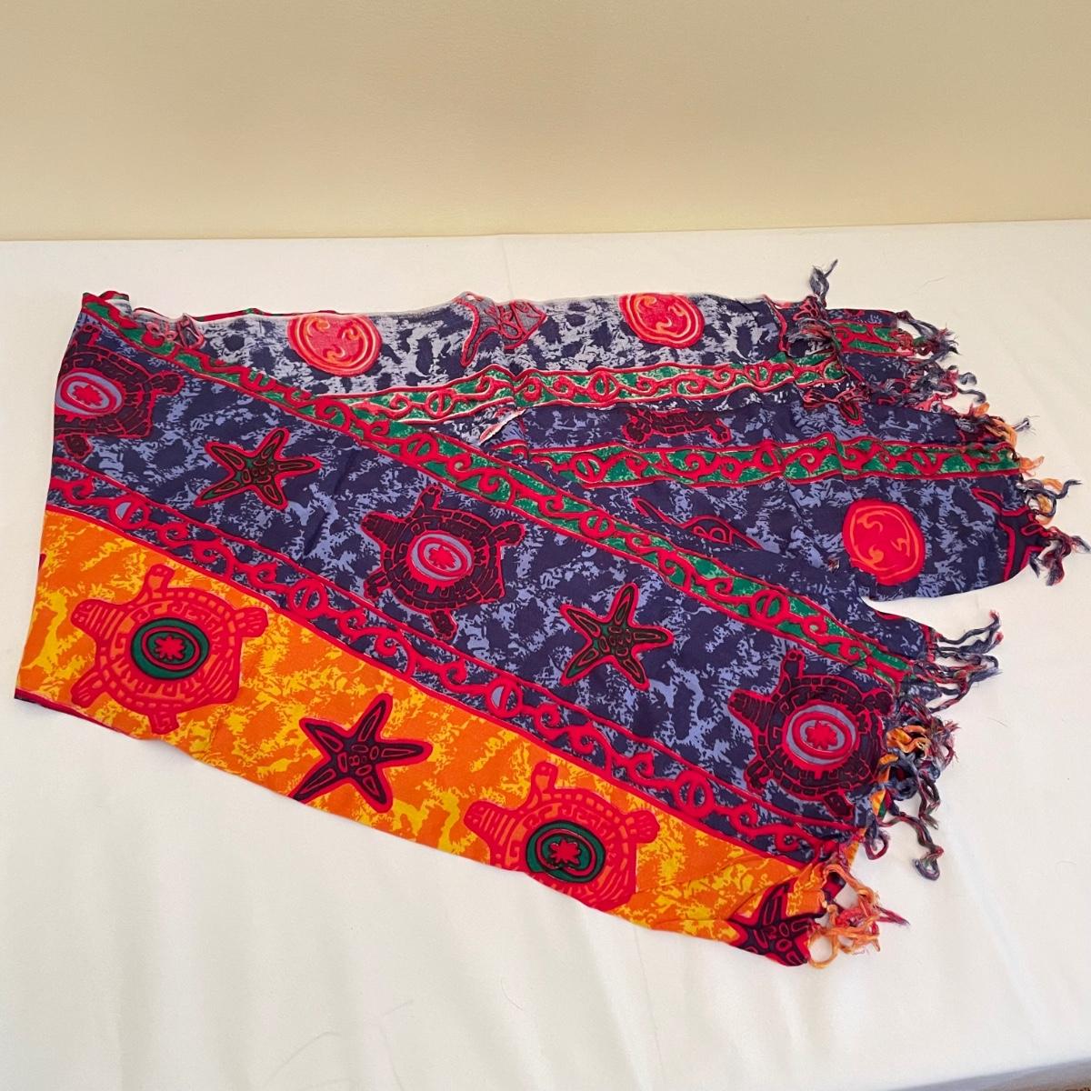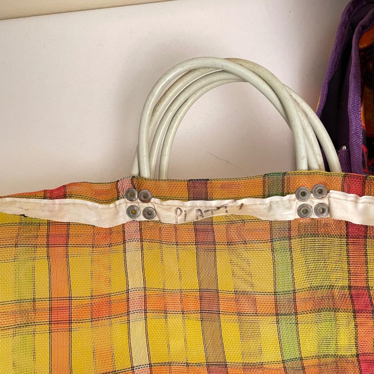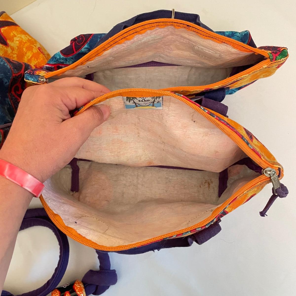 A six-piece set by Sun and Sand includes a sarong, large and small totes and bags plus a small garment bag. Lot also includes a large mesh tote that feels like plastic and another shell bag by Sun and Sand. Items show some fading and a couple need a good cleaning. See images. The yellow mesh tote measures 24” x 23” while lying flat, the garment bag laid out measures 27” x 36”. Local pick up only.