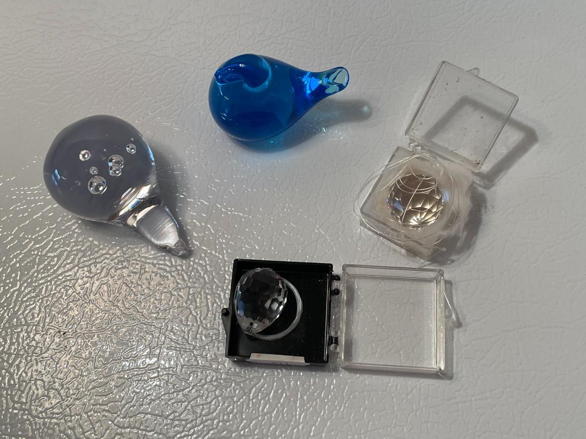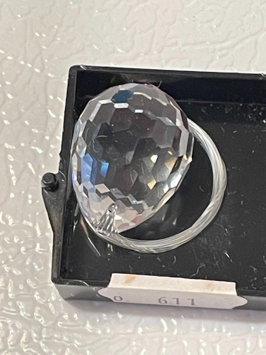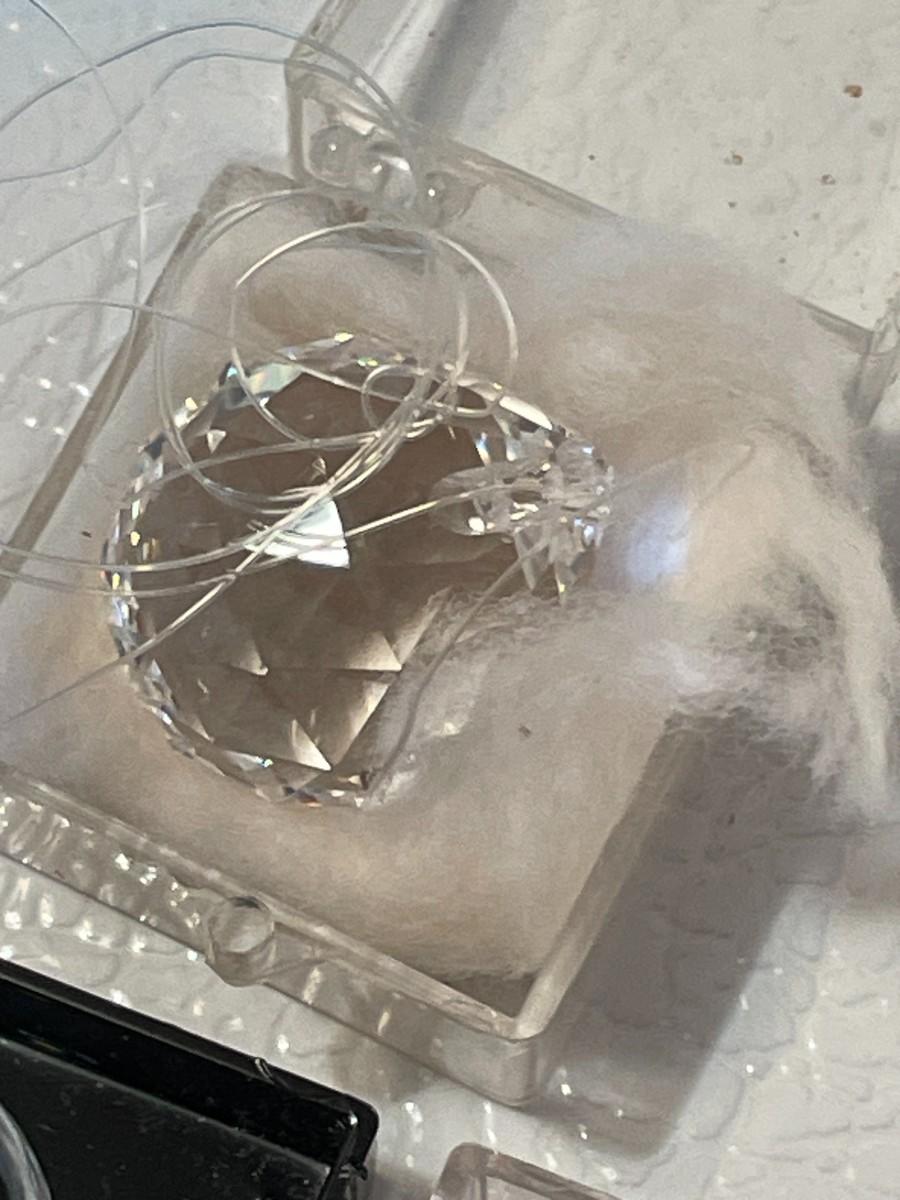The large clear suncatcher can be hung and has large air bubbles inside. The bluebird of happiness is about 2 inches long from beak to tail feathers. Each faceted glass prism is about 0.75 inches in diameter.