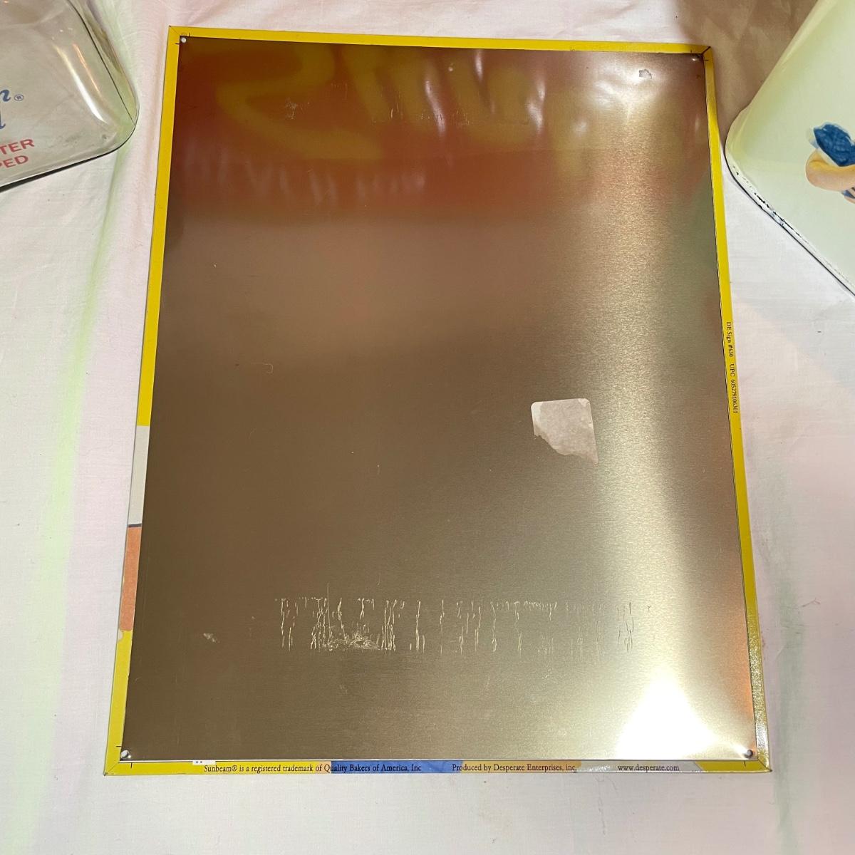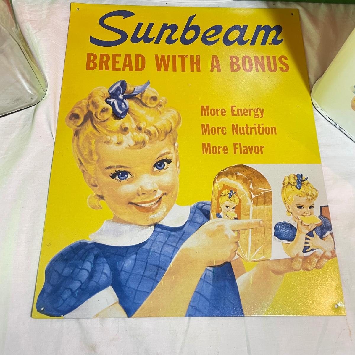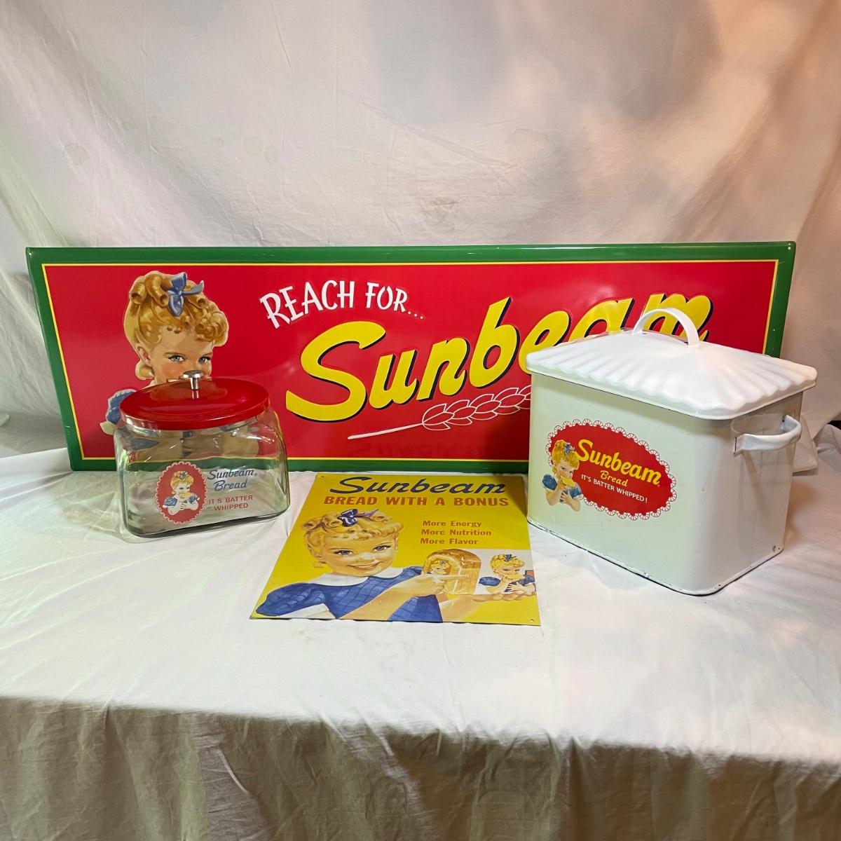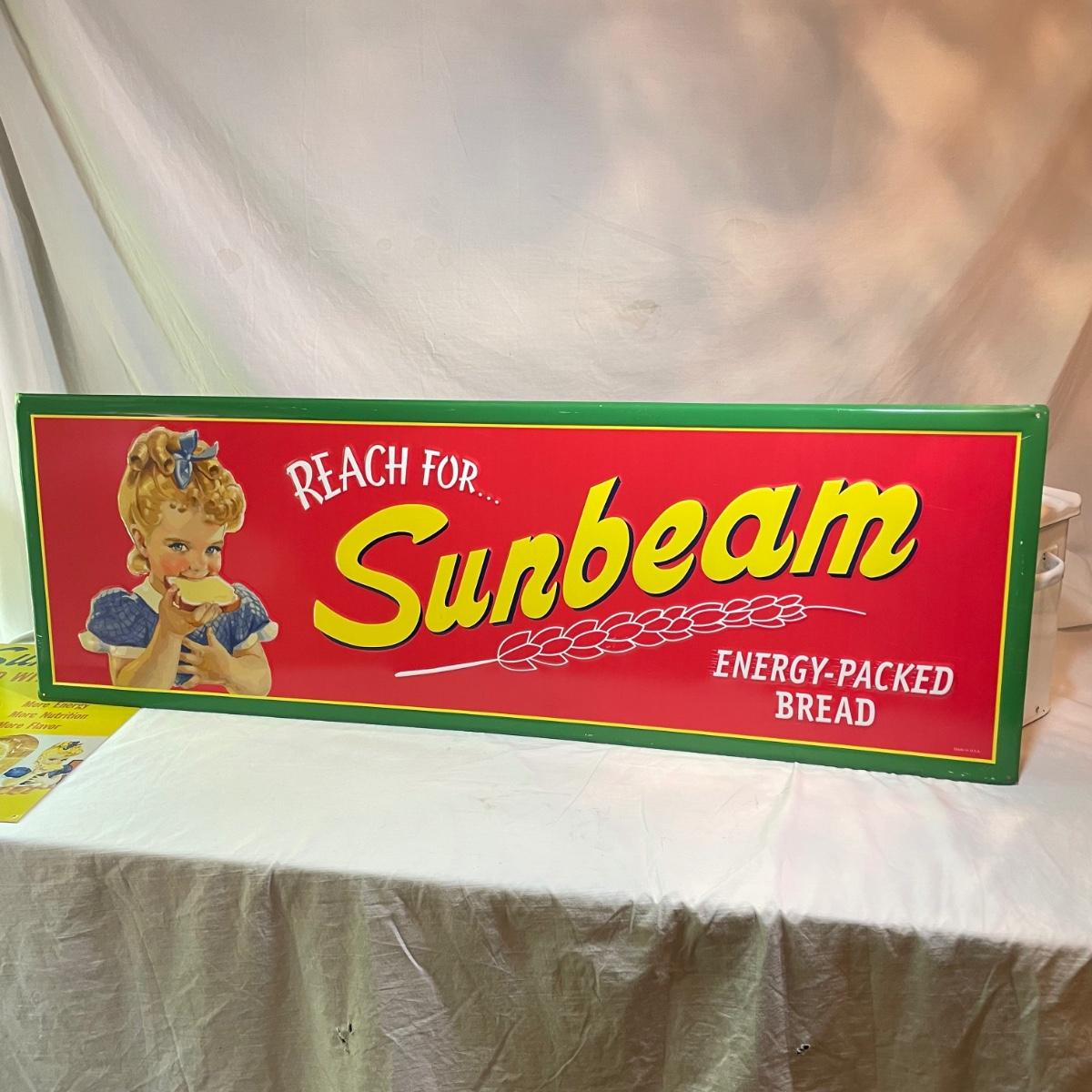 Two metal posters, a lidded jar and an enamel lidded box all with the signature Sunbeam child. The posters are newer reproductions, the jar and box appear a bit more vintage. The largest green bordered and embossed poster is 42” x 14”, the clear glass jar is 8”SQ x 8”H. See images. Shipping available. Shipping available. Shipping can be costly. We suggest contacting our preferred local shipping provider, Postage Express, with dimensions and getting an estimate before bidding: (828) 255-9250 or email shipping@postageexpressnc.com