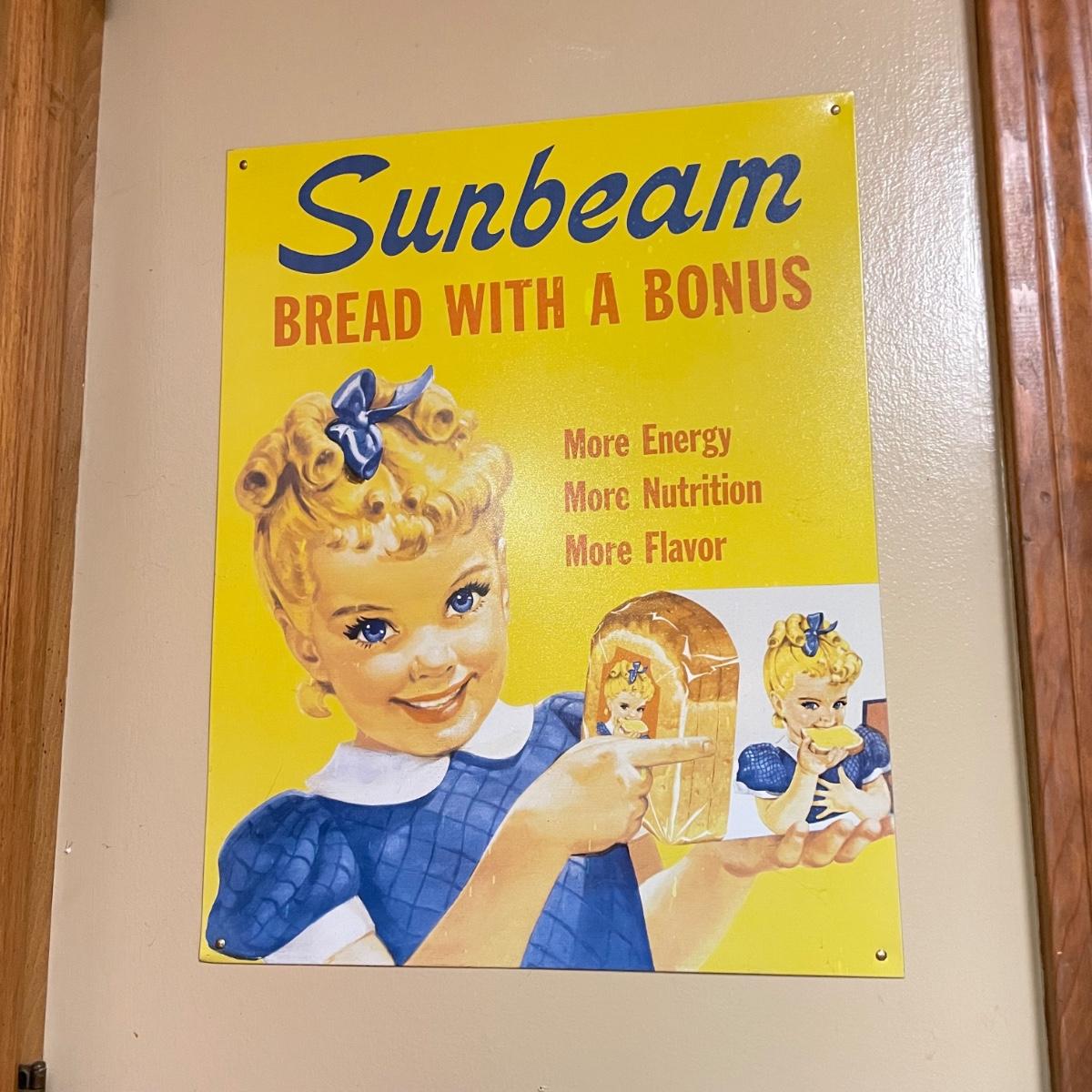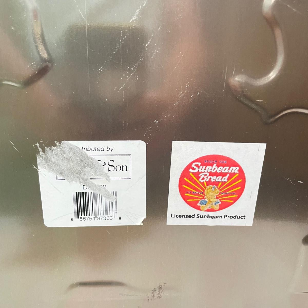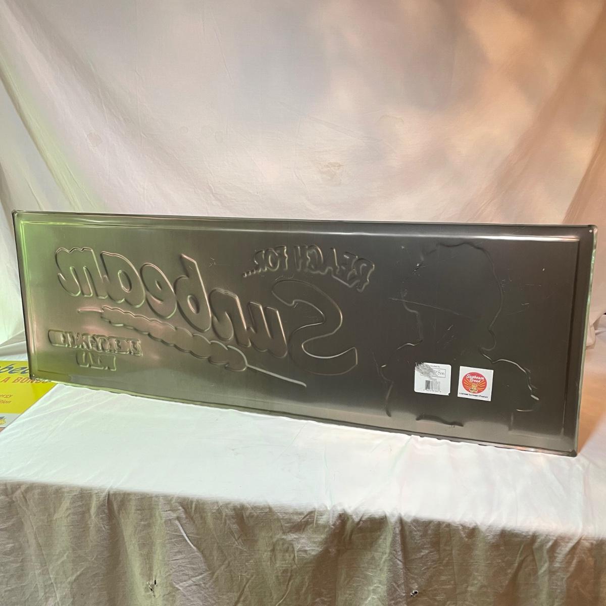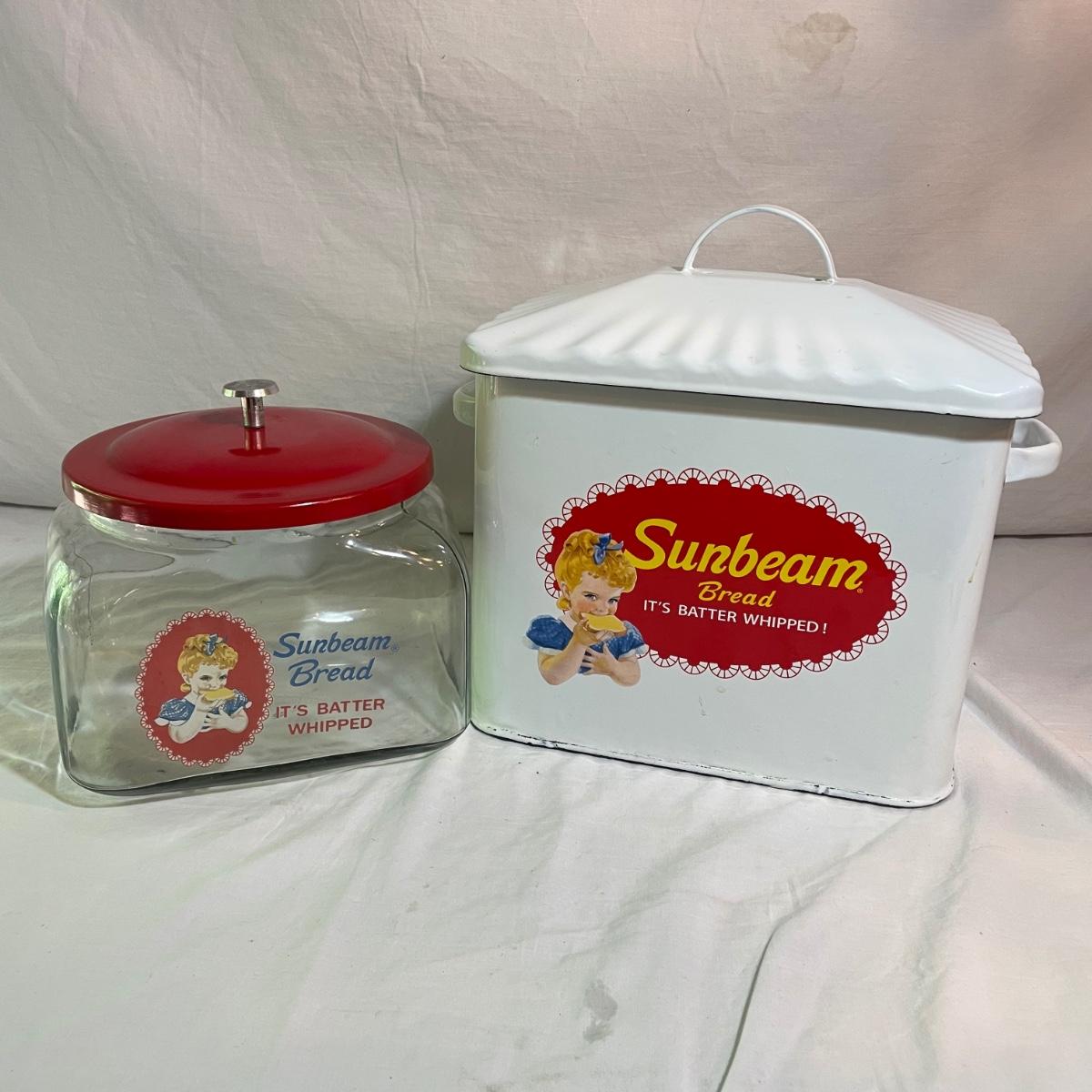 Two metal posters, a lidded jar and an enamel lidded box all with the signature Sunbeam child. The posters are newer reproductions, the jar and box appear a bit more vintage. The largest green bordered and embossed poster is 42” x 14”, the clear glass jar is 8”SQ x 8”H. See images. Shipping available. Shipping available. Shipping can be costly. We suggest contacting our preferred local shipping provider, Postage Express, with dimensions and getting an estimate before bidding: (828) 255-9250 or email shipping@postageexpressnc.com
