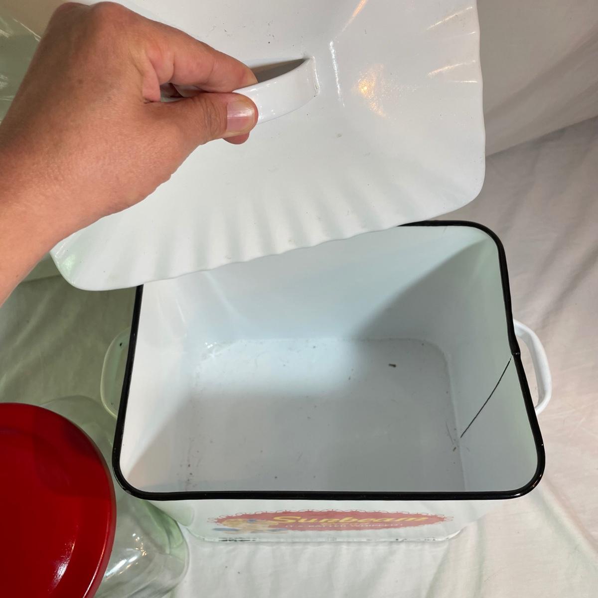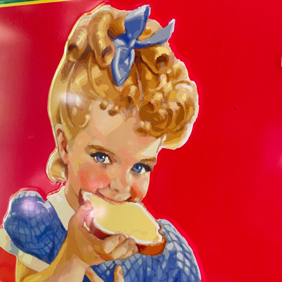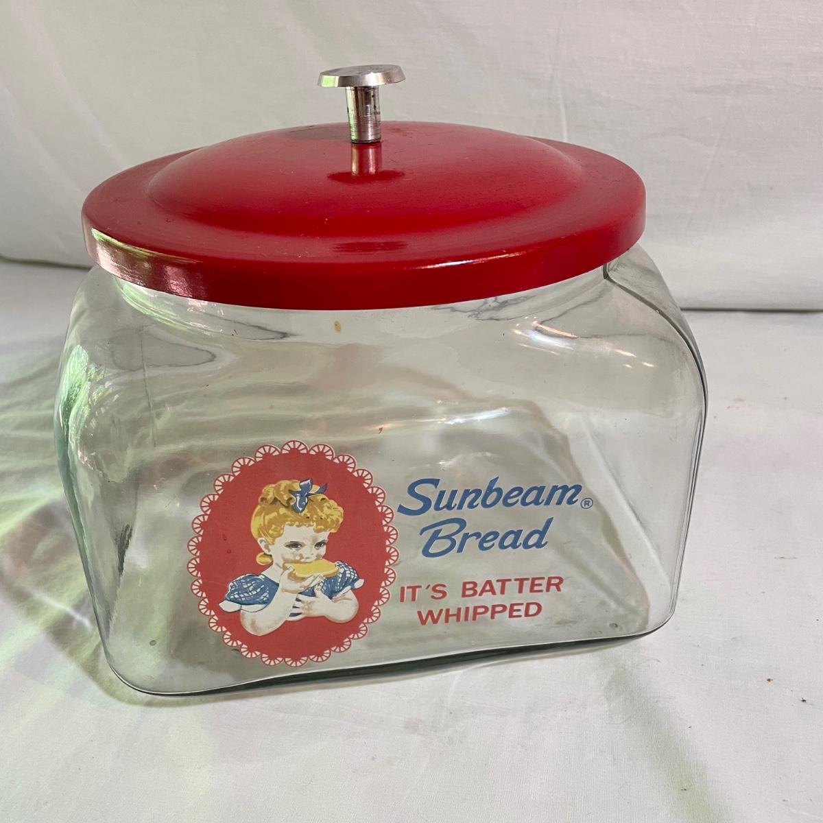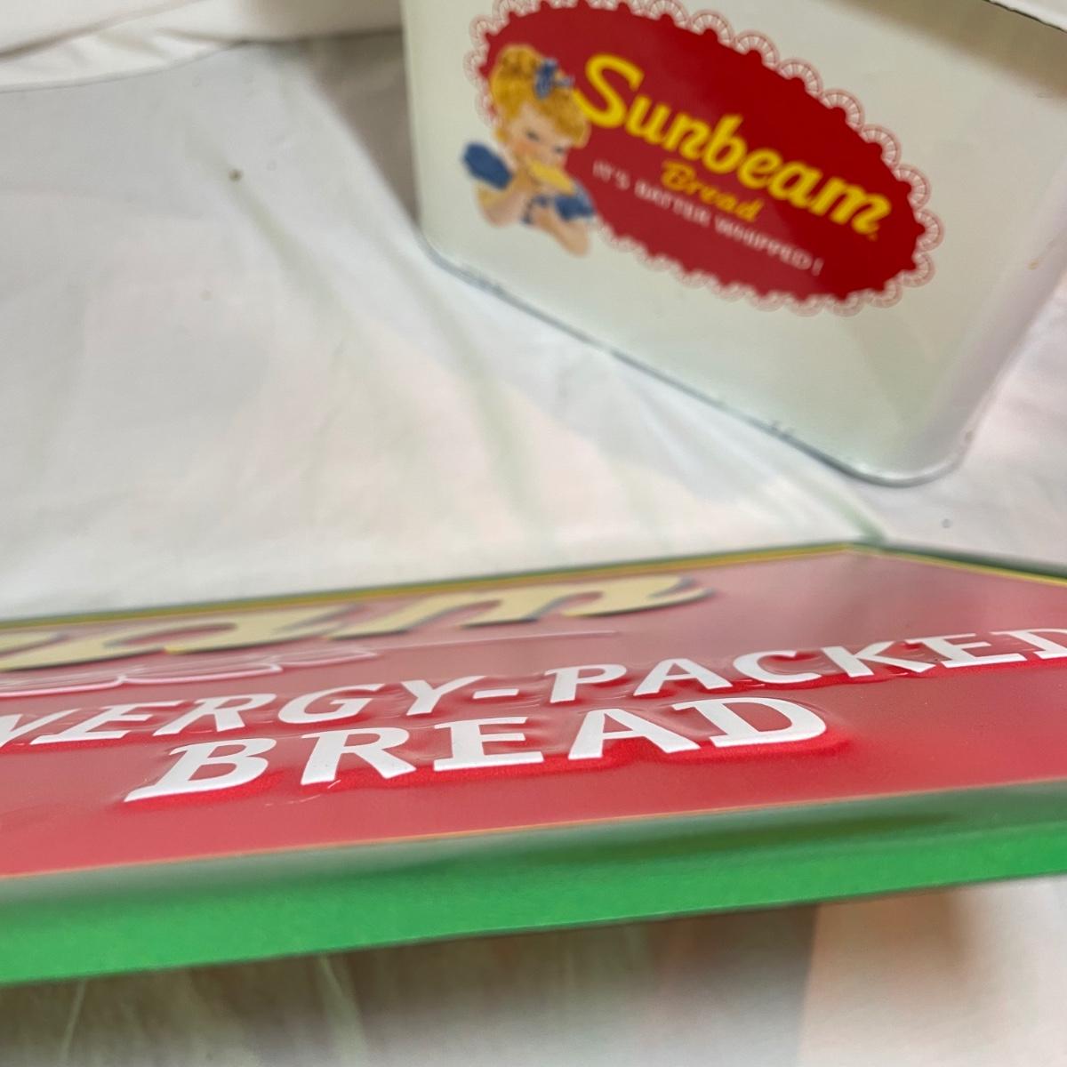 Two metal posters, a lidded jar and an enamel lidded box all with the signature Sunbeam child. The posters are newer reproductions, the jar and box appear a bit more vintage. The largest green bordered and embossed poster is 42” x 14”, the clear glass jar is 8”SQ x 8”H. See images. Shipping available. Shipping available. Shipping can be costly. We suggest contacting our preferred local shipping provider, Postage Express, with dimensions and getting an estimate before bidding: (828) 255-9250 or email shipping@postageexpressnc.com